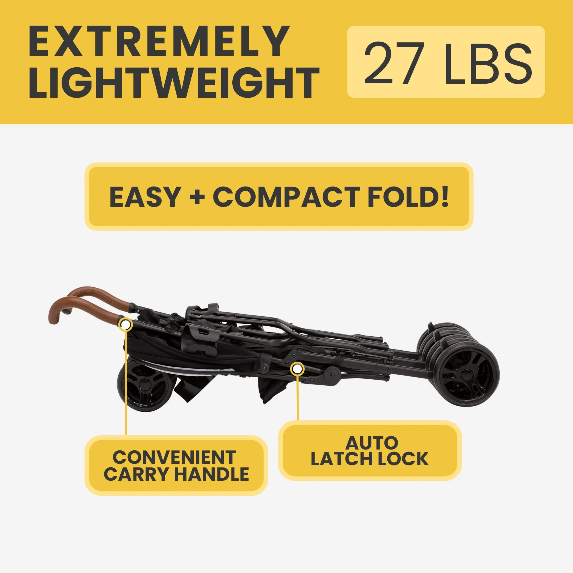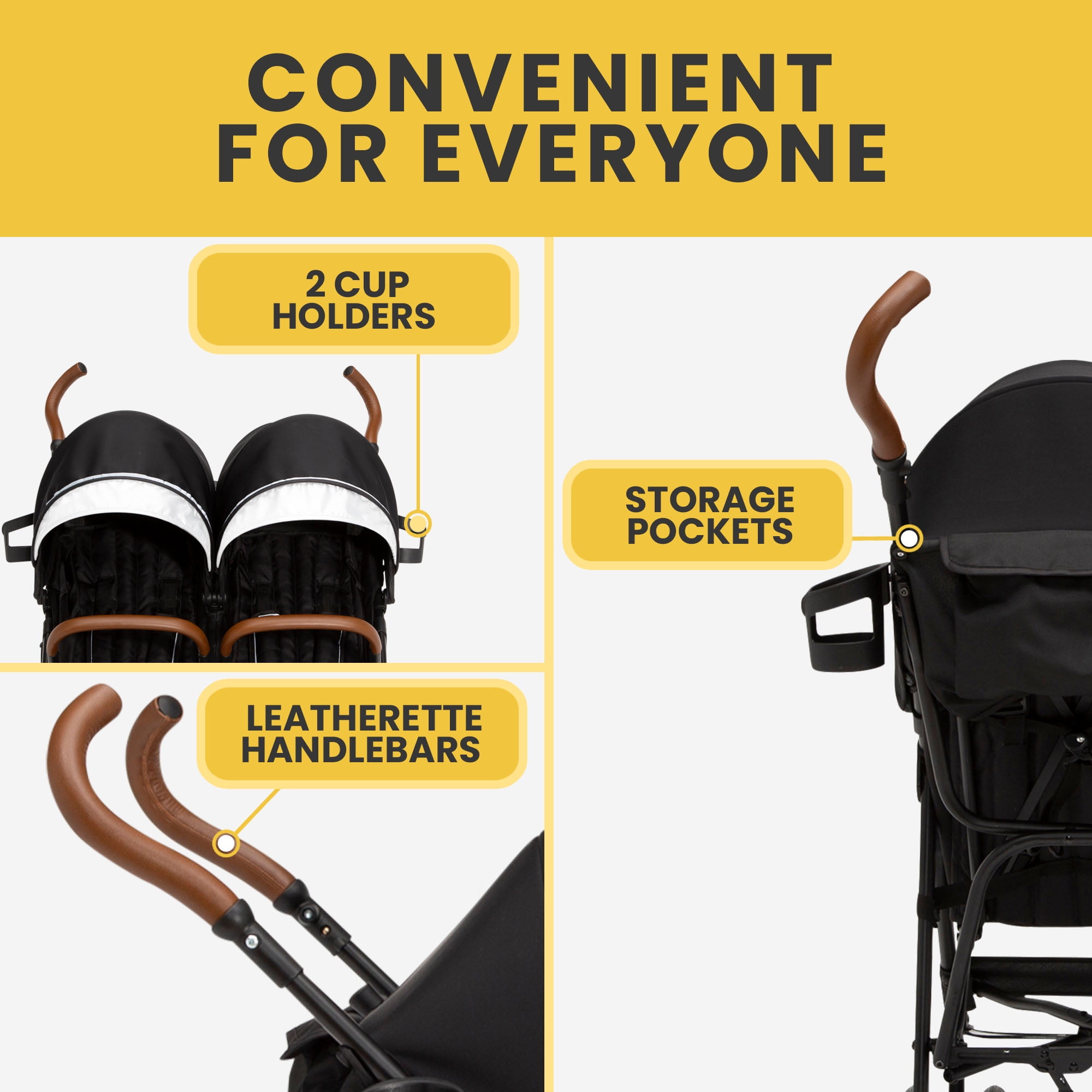 SMOOTHEST RIDE: Swivel front wheels feature precision technology for outstanding control and effortless push, easier than ever to glide, turn and maneuver | Separate back step brakes | Puncture-proof airless 6-inch and 7-inch tires are durable/shock absorbing LIGHTWEIGHT: The ultimate in convenience, this lightweight double stroller has a durable frame that only weighs 27.17 lbs. COMPACT FOLD: The easy compact umbrella fold with carry handle and auto latch lock Is ideal for travel or everyday use | Folded dimensions: 13.4″L x 8.33″W x 38.6″H | Meets theme park size requirements DESIGNED FOR COMFORT: Keep kids comfy with calf rests, footrests and recline | Leatherette handlebars/child bars | Neoprene canopies with extendable sun visors have UPF 50+ protection | Storage pockets and 2 cup holders SAFE OPTION: JPMA certified | 5-point safety harnesses | Reflective shoulder pads Recommended for ages 9 months up to 35 lbs. per seat (70 lbs. total) Assembled dimensions: 34.4″L x 31.3″W x 42.3″H