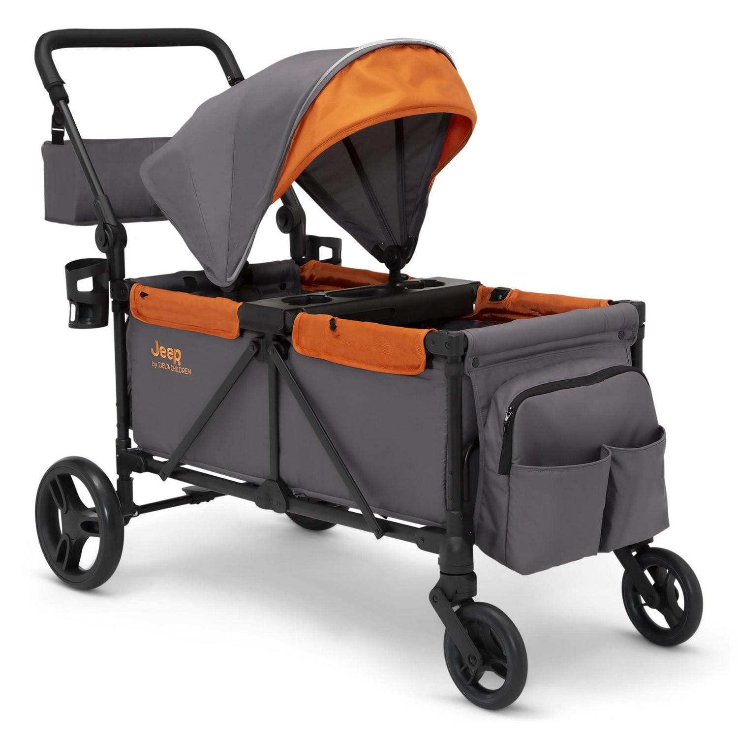 Be ready for adventure with the travel-ready Jeep Sport All-Terrain Stroller Wagon by Delta Children. Your all-in-one solution for smooth rides, tons of storage, and endless fun, this wagon is a comfy option for siblings or friends. This versatile stroller wagon features an adjustable canopy with an extendable sunshade to protect children from the elements. And, with two kids safely in tow, the adjustable leatherette handlebar with five different positions gives you the ability to push or pull on your next adventure. Equipped with tons of storage inside and out, each wagon comes with an expandable bag, tons of pockets, parent organizer, two parent cupholders and plastic child’s tray with compartments for snacks and drinks. Built to last, this wagon’s durable rust-resistant frame, puncture-proof tires and compact fold make it easy to stow or transport. More than a stroller wagon the Jeep Evolve Stroller Wagon by Delta Children makes it possible to create your own adventures with your family. Holds up to 110 lbs. (55 lbs. per seat). Weighs 30.5 lbs. Recommended for ages 9 months up to 55 lbs.