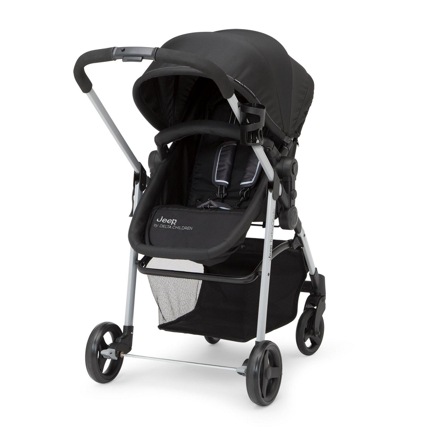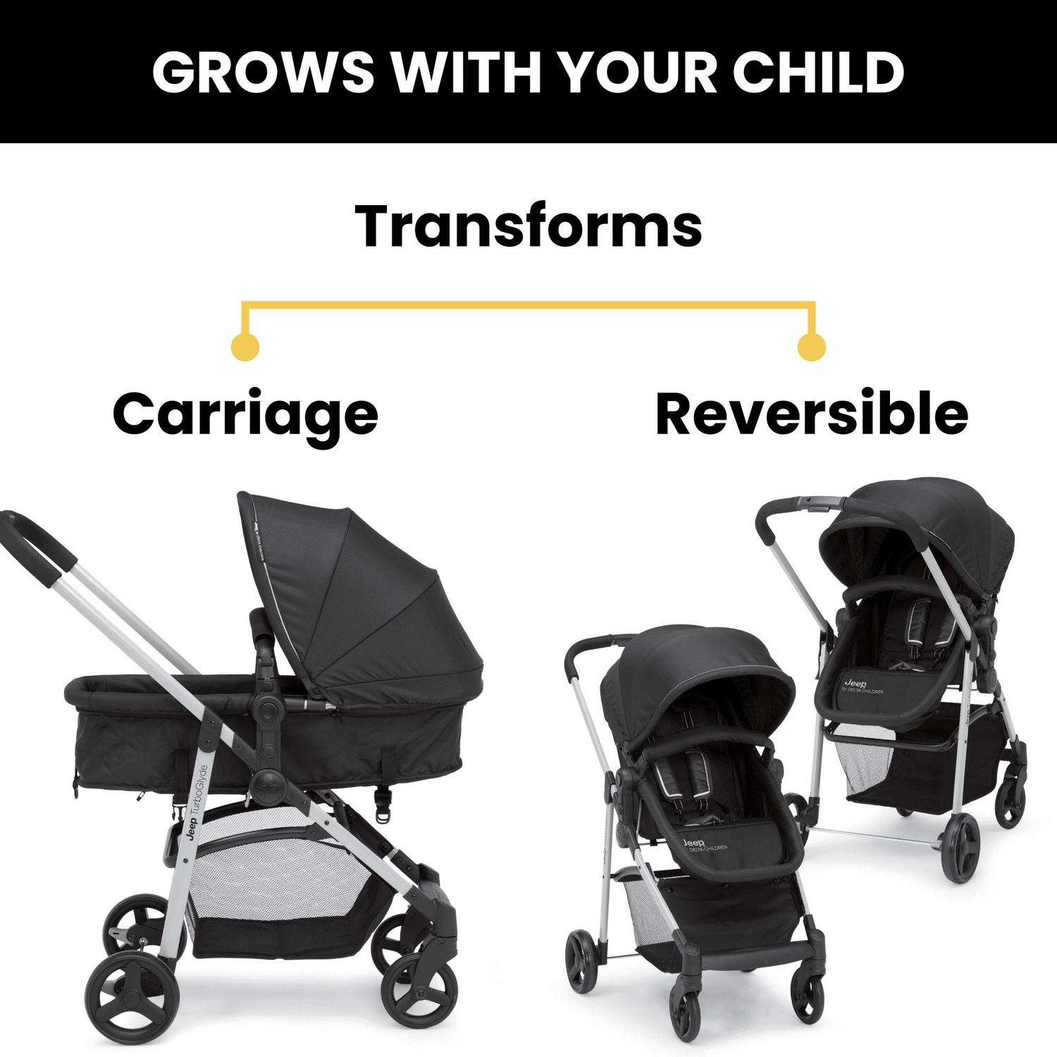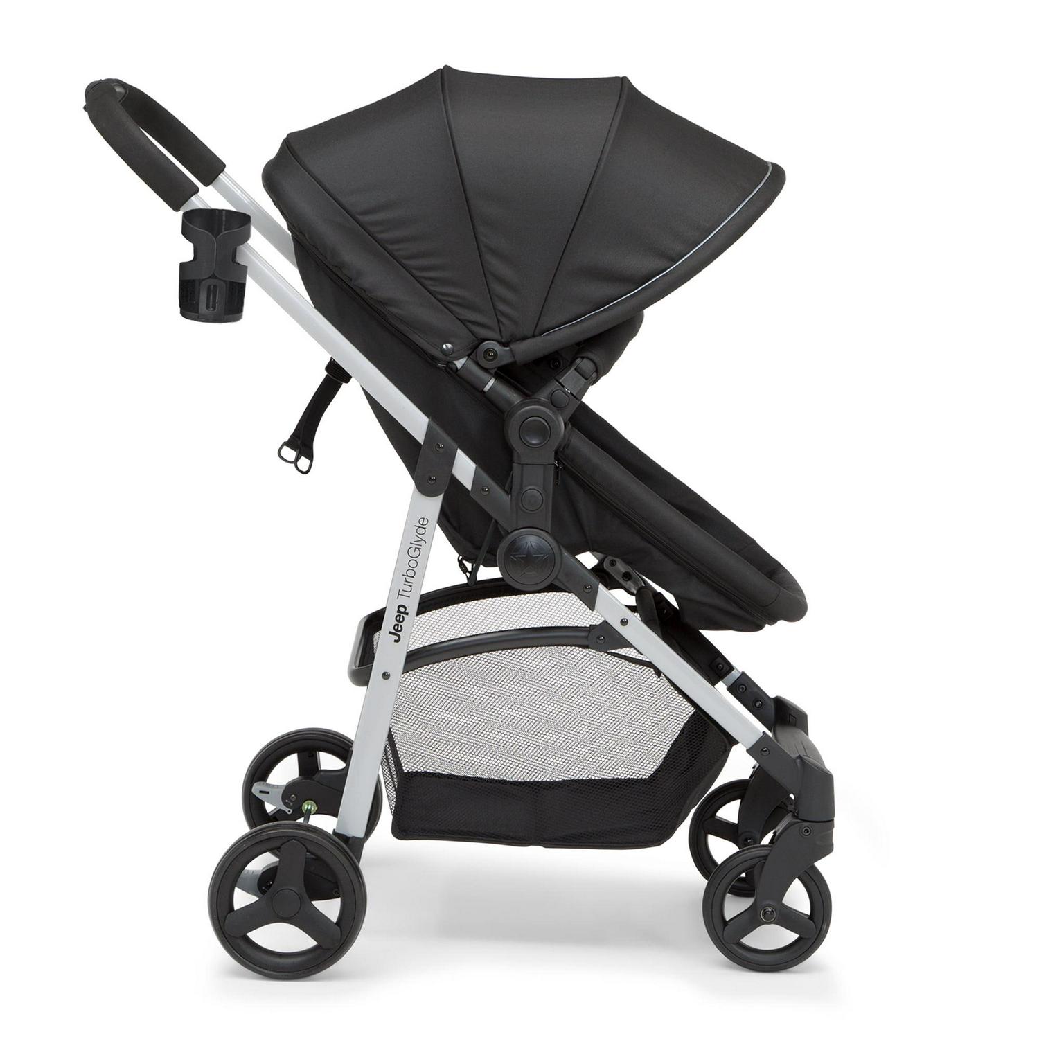 The Jeep TurboGlyde 2-in-1 Stroller by Delta Children will carry kids through all ages and stages. This incredibly versatile stroller easily transforms from infant carriage/bassinet to a reversible toddler stroller that allows baby to face you or the world. Created with the ever-growing child in mind, it features an adjustable position reclining seat, swing-out child bar and oversized, extendable canopy that blocks the sun. That s not all, the Jeep TurboGlyde 2-in-1 Stroller opens and closes with one hand, its easy and compact fold makes traveling or everyday walks stress-free, even if you only have one free hand. Car seat compatibility: This stroller fits the following infant car seats (adapter #10030-2294 and car seats sold separately): Graco Snug Ride, Click Connect 30, 35, 40, Evenflo Nurture, Evenflo Embrace, Chicco KeyFit 30 and Britax B-Safe 35.