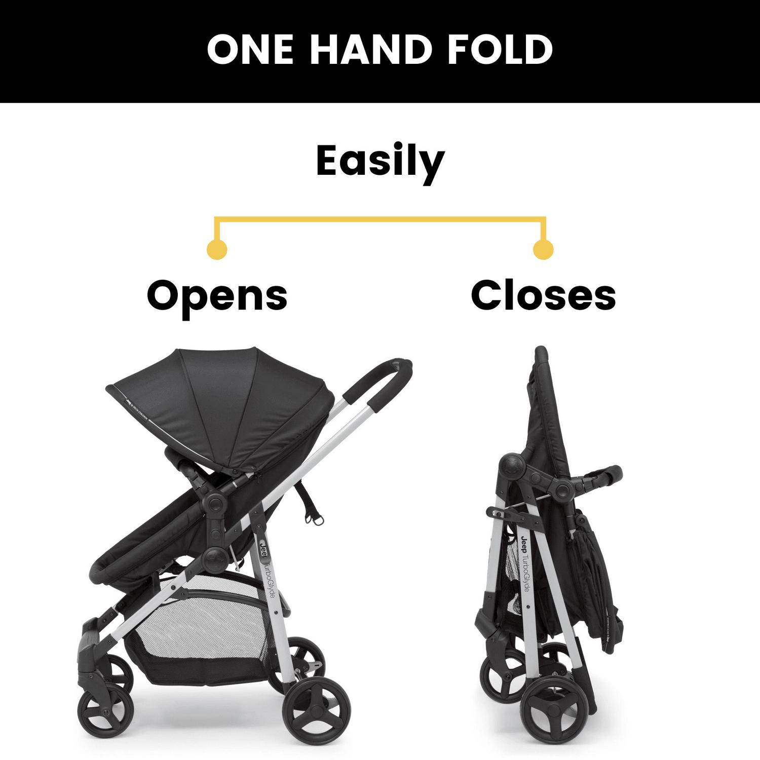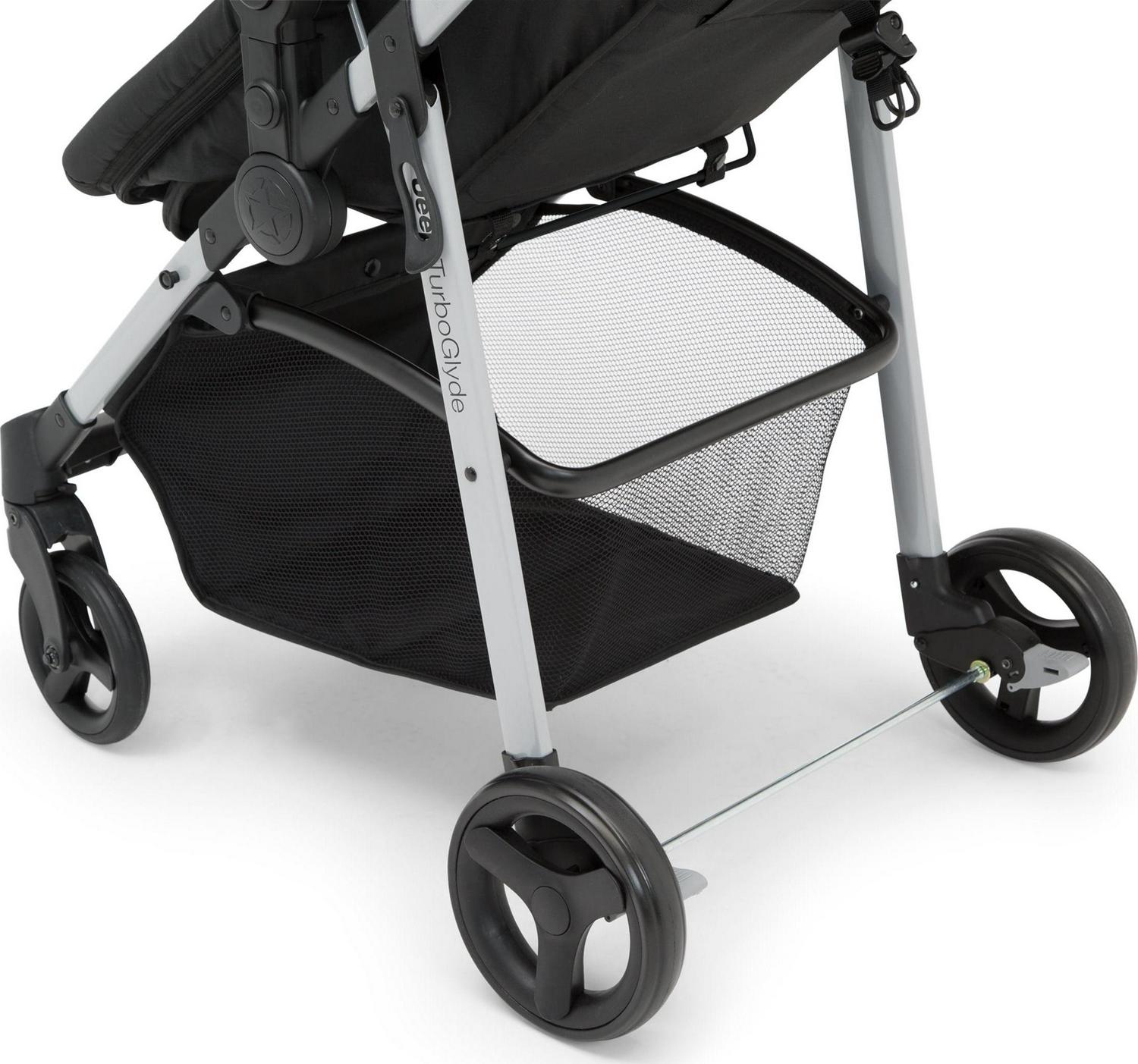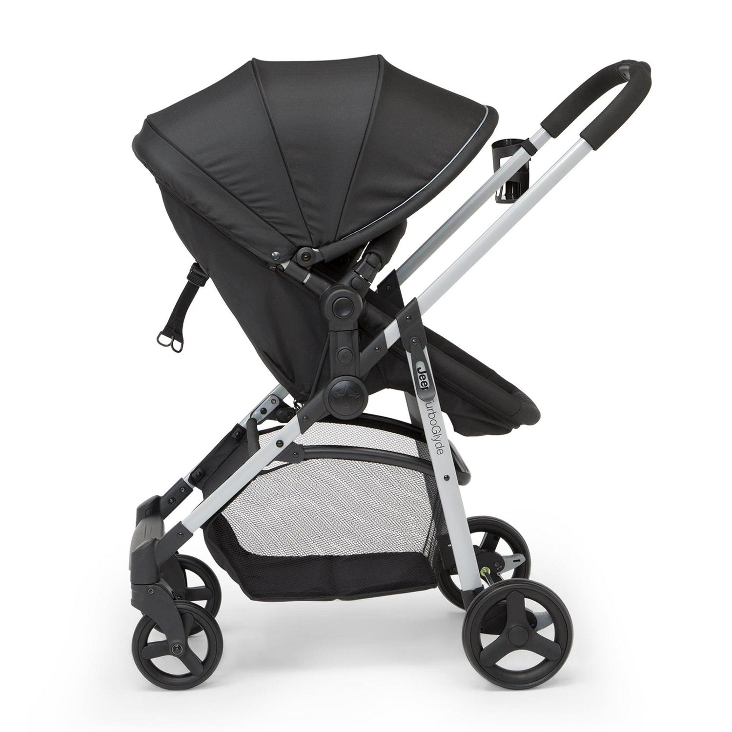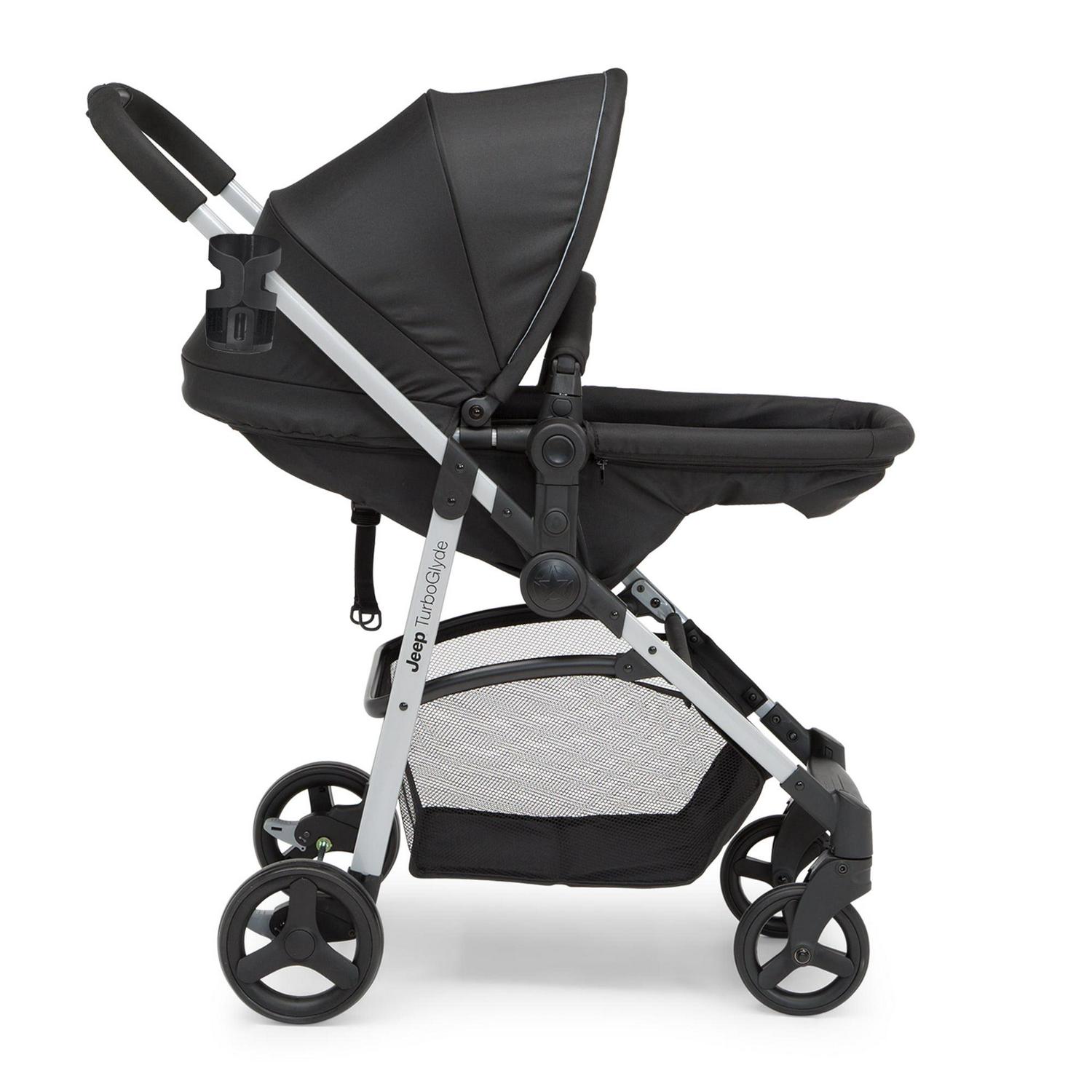 The Jeep TurboGlyde 2-in-1 Stroller by Delta Children will carry kids through all ages and stages. This incredibly versatile stroller easily transforms from infant carriage/bassinet to a reversible toddler stroller that allows baby to face you or the world. Created with the ever-growing child in mind, it features an adjustable position reclining seat, swing-out child bar and oversized, extendable canopy that blocks the sun. That s not all, the Jeep TurboGlyde 2-in-1 Stroller opens and closes with one hand, its easy and compact fold makes traveling or everyday walks stress-free, even if you only have one free hand. Car seat compatibility: This stroller fits the following infant car seats (adapter #10030-2294 and car seats sold separately): Graco Snug Ride, Click Connect 30, 35, 40, Evenflo Nurture, Evenflo Embrace, Chicco KeyFit 30 and Britax B-Safe 35.