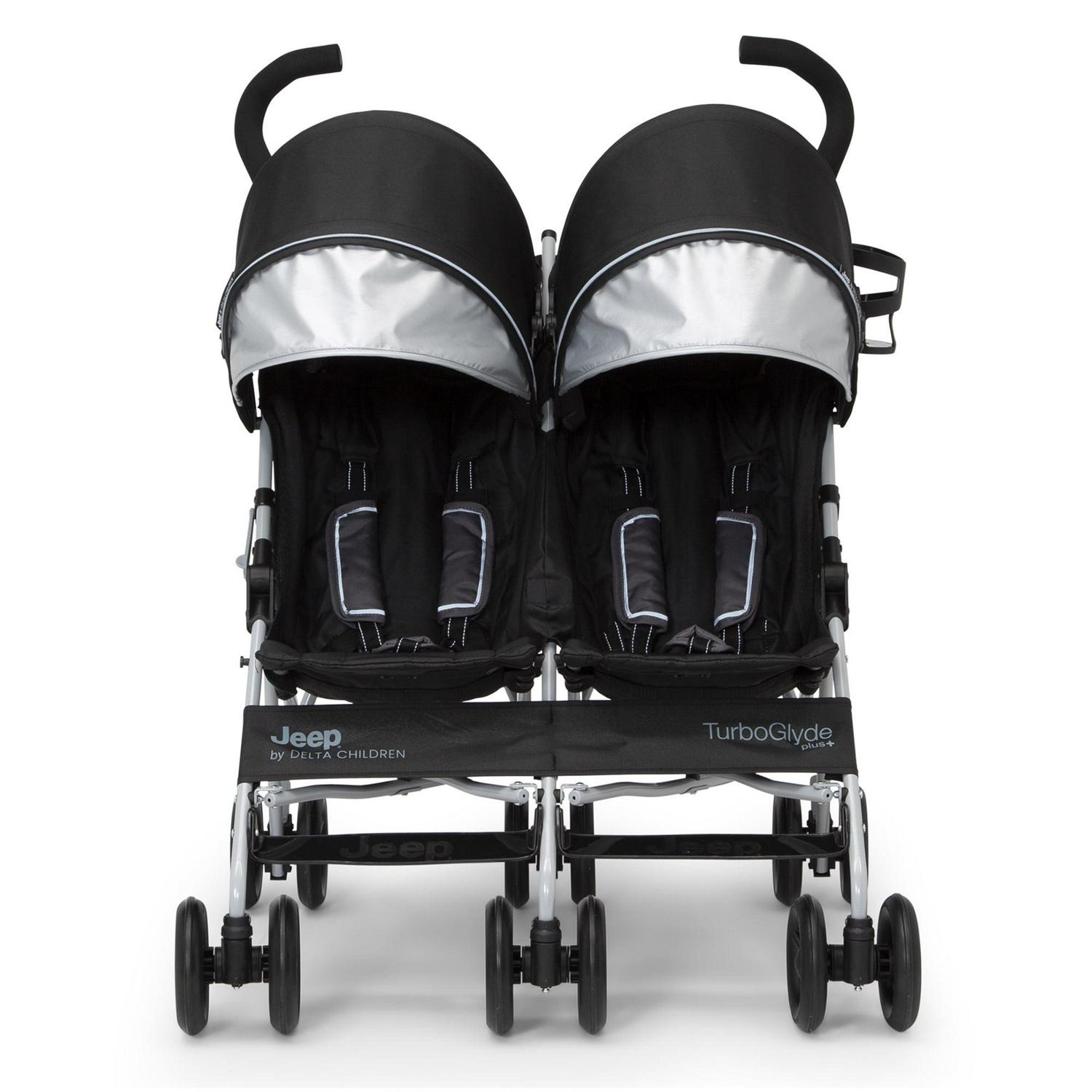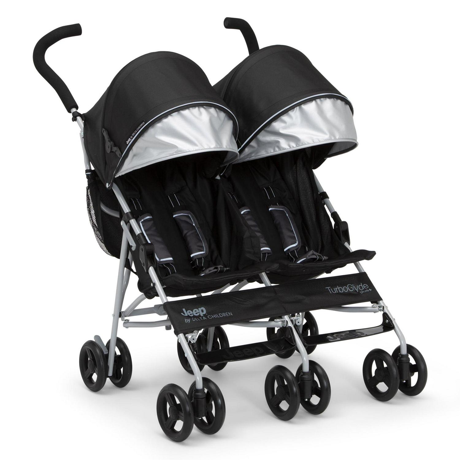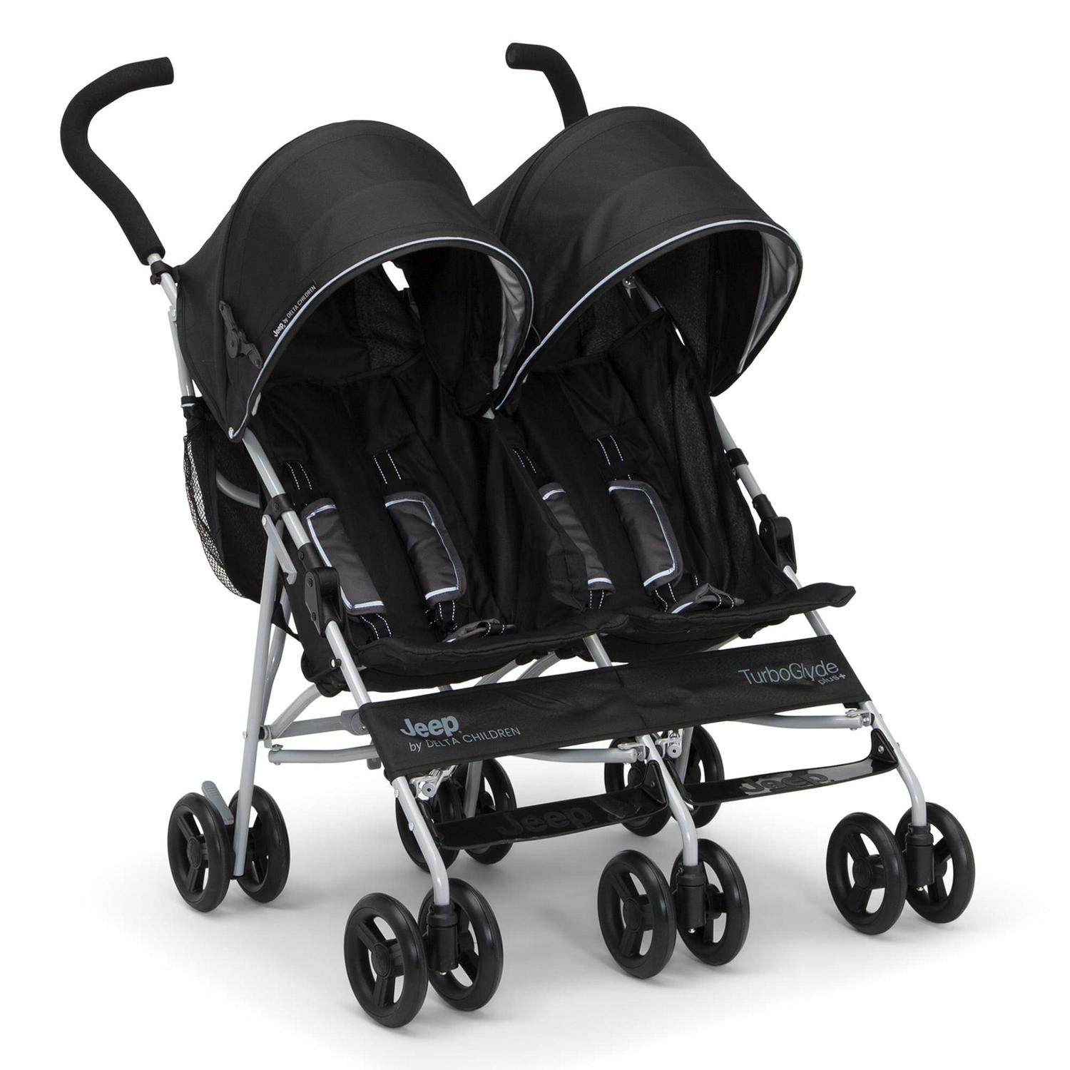 Looking for a wheel-y great ride for you and your growing family Look no further than the Jeep TurboGlyde Plus Side-by-Side Double Stroller by Delta Children! Designed to deliver the best ride ever, the Jeep TurboGlyde Plus Side-by-Side Double Stroller offers the most advanced handling thanks to all-new front wheels that feature precision technology, making it easier than ever to glide, turn and maneuver any surface. Ideal for travel or everyday use, this extremely lightweight double stroller weighs under 20 pounds and features a compact umbrella fold design. An extra-large extendable canopy with UPF 50+ sun visor will protect your children from the elements while calf and footrests ensure kids are comfortable during walks, near and far. Some additional features of this lightweight double stroller include ergonomic handles, five-point safety harness with reflective piping, two storage pockets, extra-large parent cup holder and swivel front wheels. This stroller is recommended for infants 9 months up to 35 lbs. per seat (70 lbs. total). Let’s glyde!