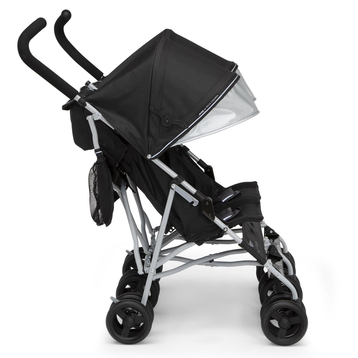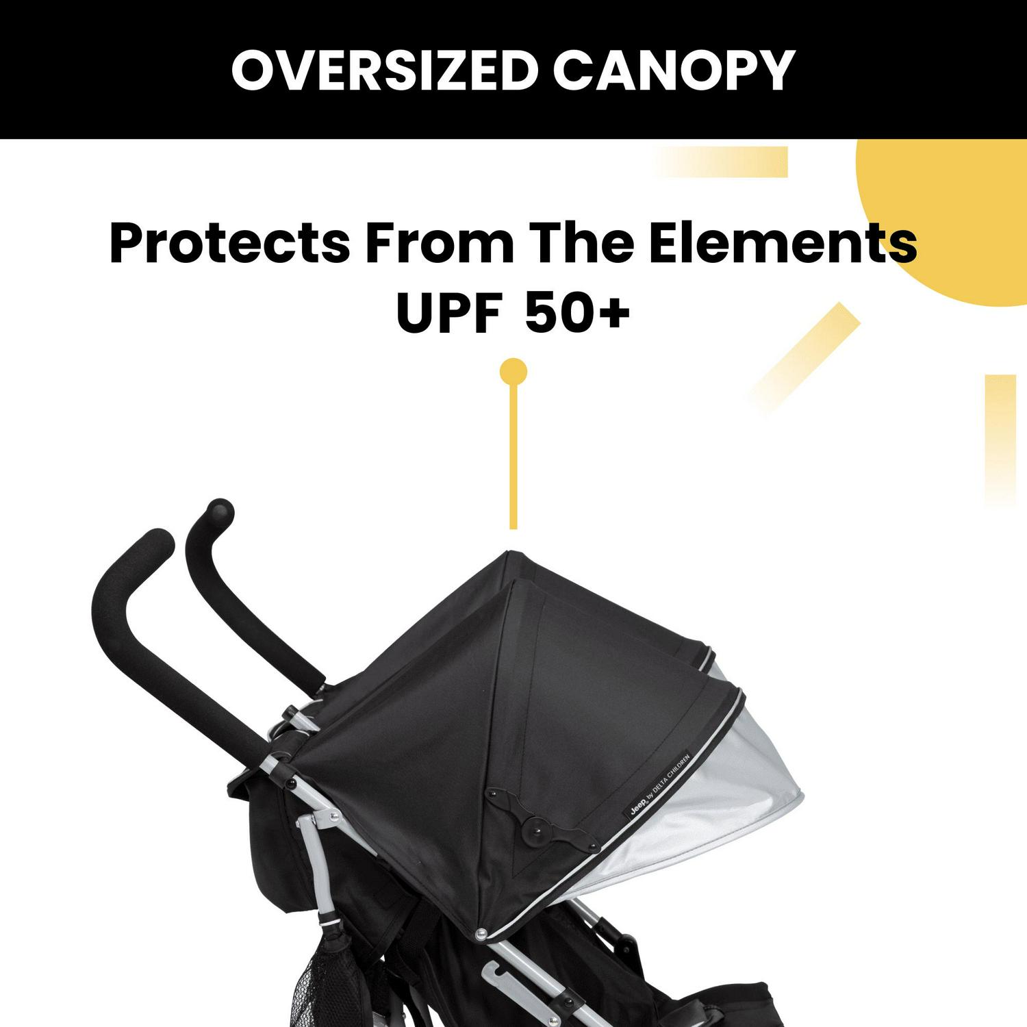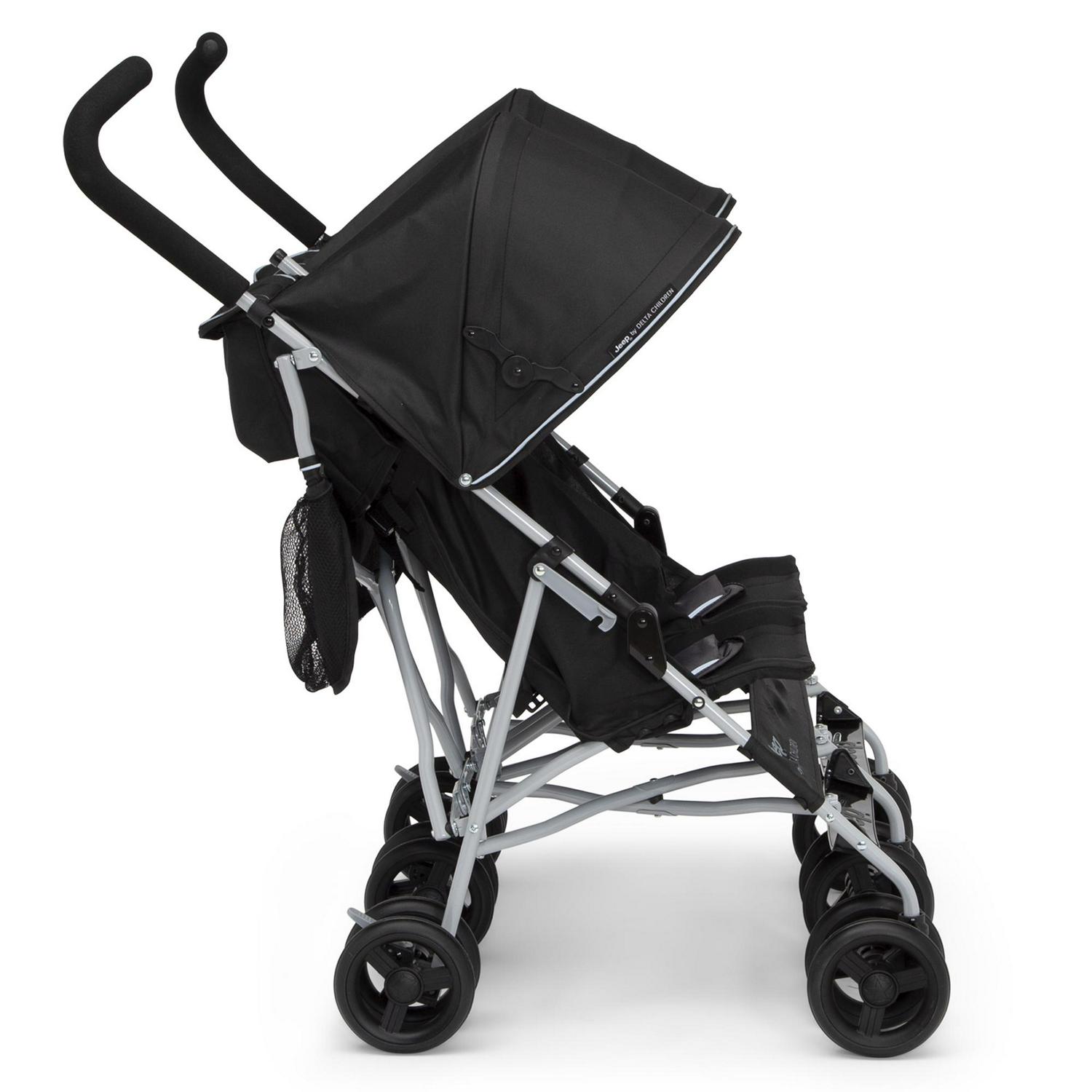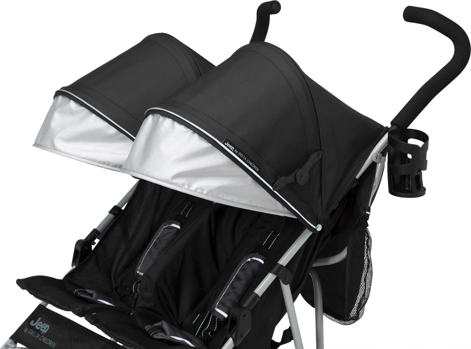 Looking for a wheel-y great ride for you and your growing family Look no further than the Jeep TurboGlyde Plus Side-by-Side Double Stroller by Delta Children! Designed to deliver the best ride ever, the Jeep TurboGlyde Plus Side-by-Side Double Stroller offers the most advanced handling thanks to all-new front wheels that feature precision technology, making it easier than ever to glide, turn and maneuver any surface. Ideal for travel or everyday use, this extremely lightweight double stroller weighs under 20 pounds and features a compact umbrella fold design. An extra-large extendable canopy with UPF 50+ sun visor will protect your children from the elements while calf and footrests ensure kids are comfortable during walks, near and far. Some additional features of this lightweight double stroller include ergonomic handles, five-point safety harness with reflective piping, two storage pockets, extra-large parent cup holder and swivel front wheels. This stroller is recommended for infants 9 months up to 35 lbs. per seat (70 lbs. total). Let’s glyde!