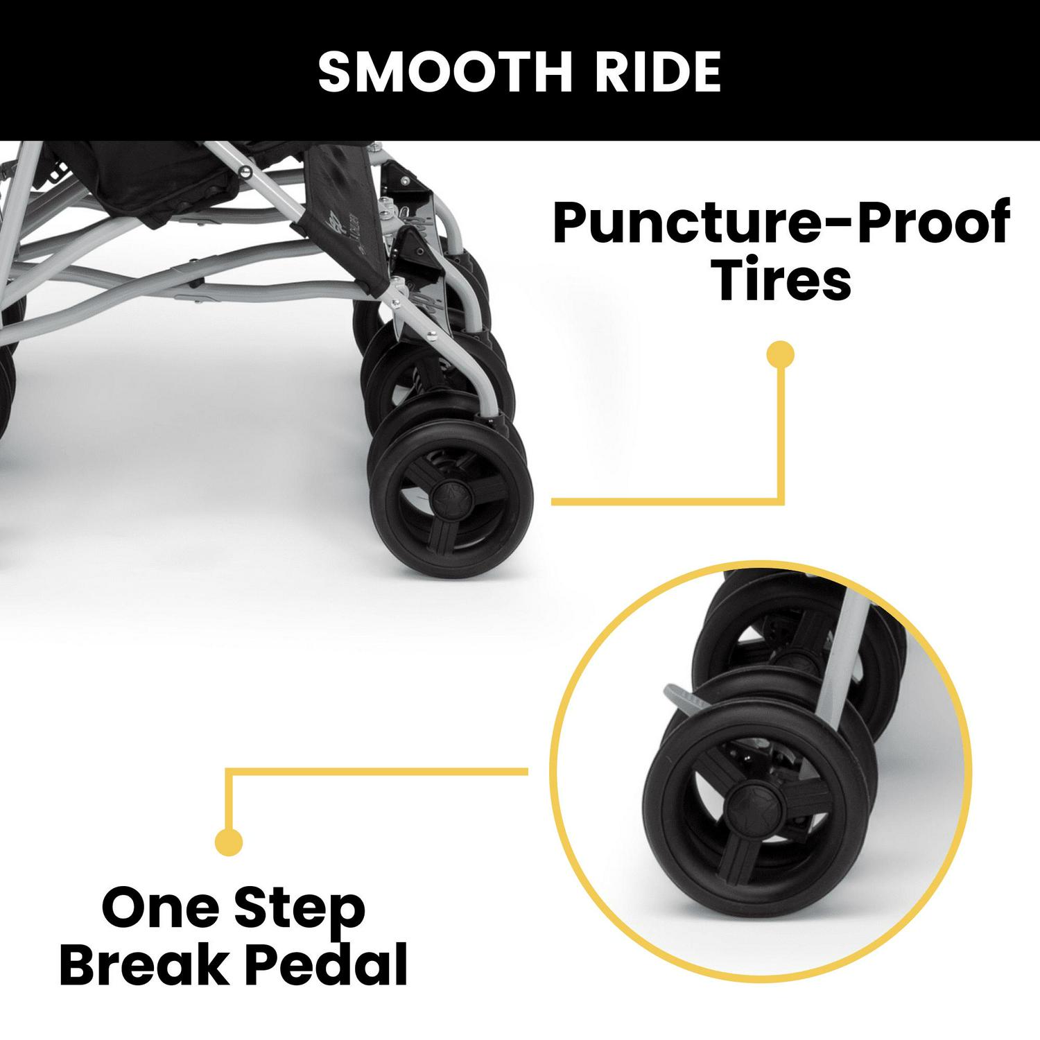– SMOOTH RIDE: Swivel front wheels feature precision technology for outstanding control and effortless push, easier than ever to glide, turn and maneuver | Separate back step brakes | Puncture-proof/never flat 5.5-inch tires are durable