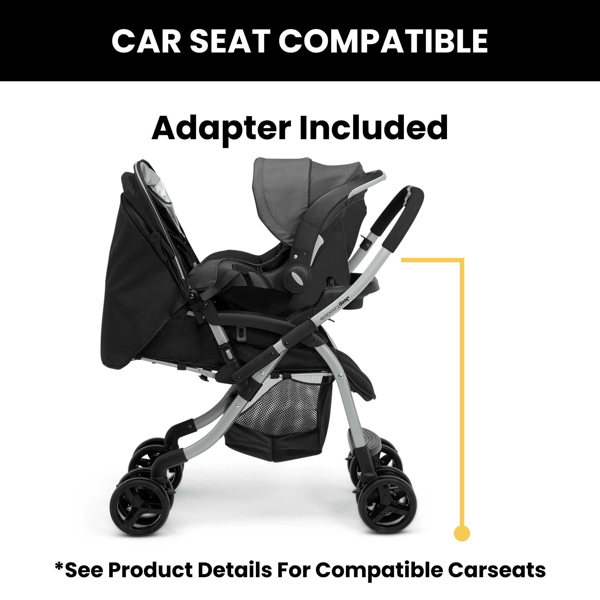 Designed to adapt to your child’s growth, the Jeep TurboGlyde Reversible Handle Stroller by Delta Children can be used as travel system with any compatible infant car seat, as a parent-facing stroller or as a forward-facing stroller. Without disturbing your child, the reversible handle flips, and allows your little one to face you for interaction, or face forward to discover the world. Additional features like a compact fold, full coverage UPF 50+ canopy for sun protection, and removable child tray with cup holder help make your everyday adventures effortless. Car seat compatibility: This stroller fits the following infant car seats (car seats sold separately): Graco Snug Ride, Click Connect 30, 35, 40, Evenflo Nurture, Evenflo Embrace. Since 1941, the Jeep brand has been a symbol of freedom and expression. Influenced by a love of the great outdoors, Jeep kids’ Products are created for little adventurers.