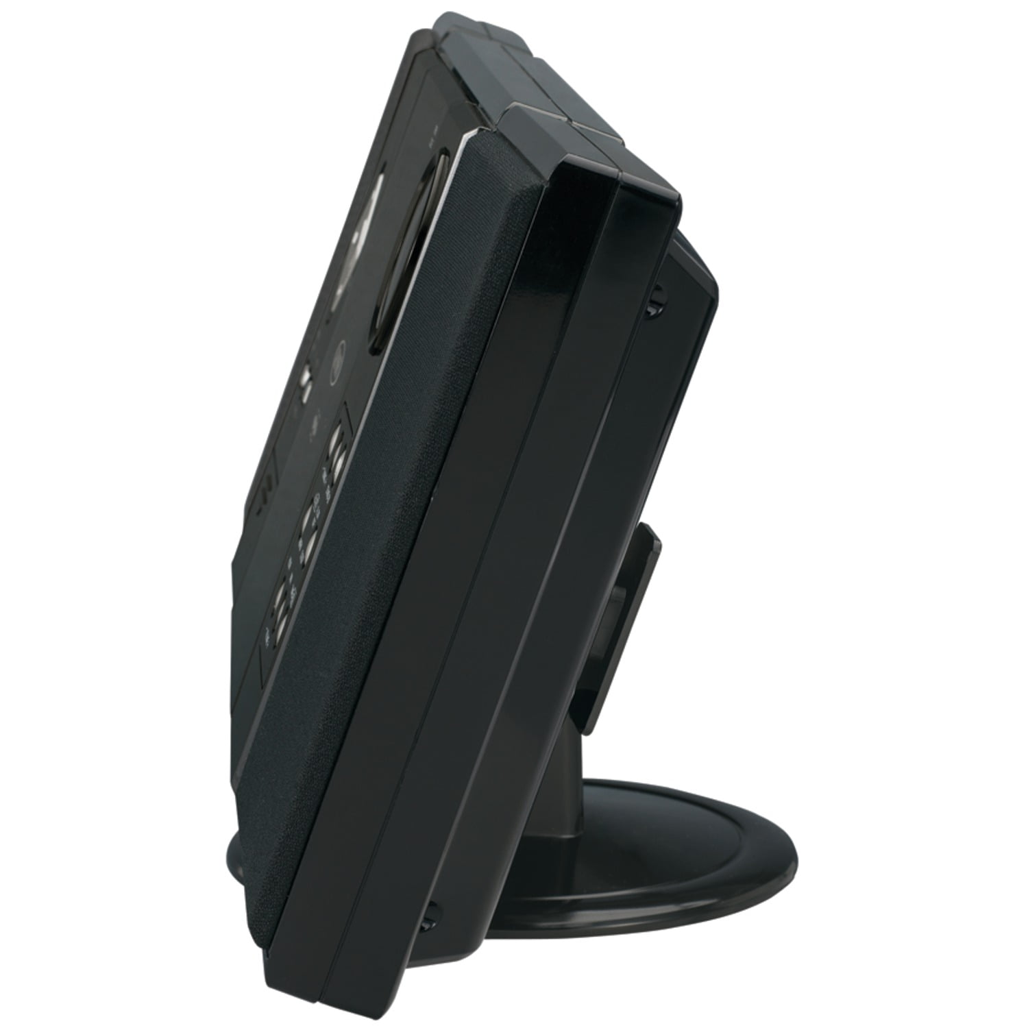 Vertical-loading CD playerCD-R/RW compatible Multifunction blue backlit LCD display AM/FM stereo receiver with digital display Alarm clock Skip/search forward & backward Repeat 1 or all Random play Programmable memory Stereo speaker system Stereo headphone output 2 x 1W RMS Power: 120V AC/60Hz Aux input for connecting iPod, MP3 or other digital audio players Includes wall mount kit & remote Remote requires 2 AAA batteries Dim: 7″H x 18.88″W x 2.38″D