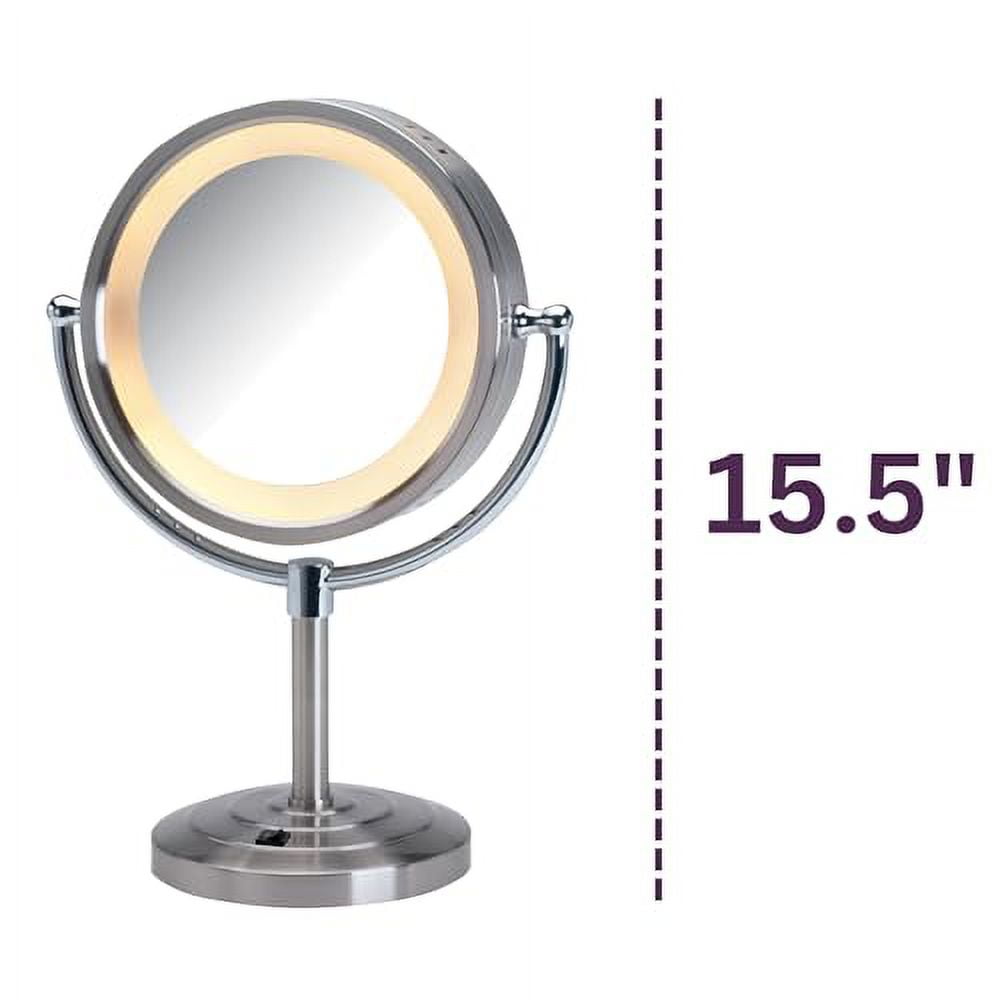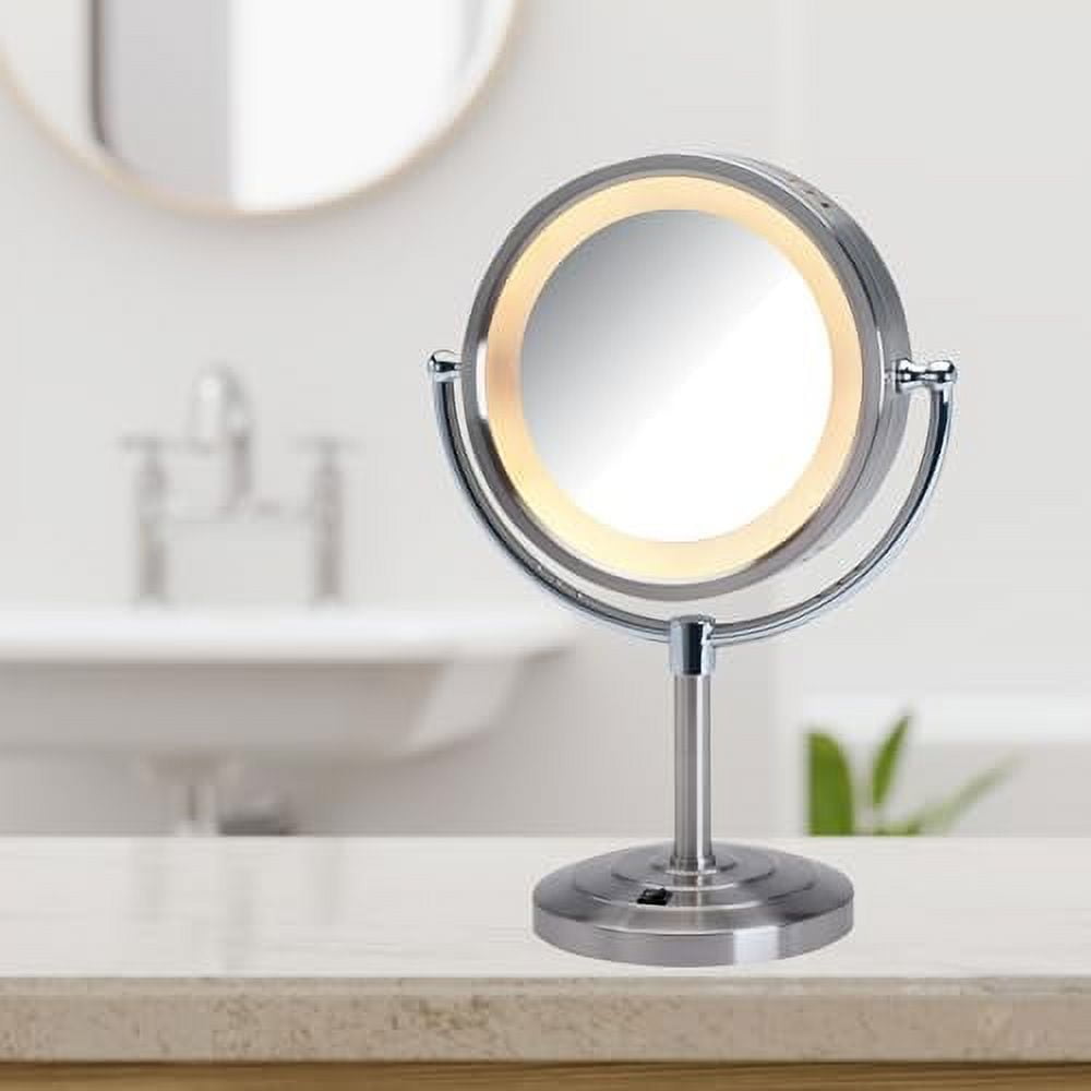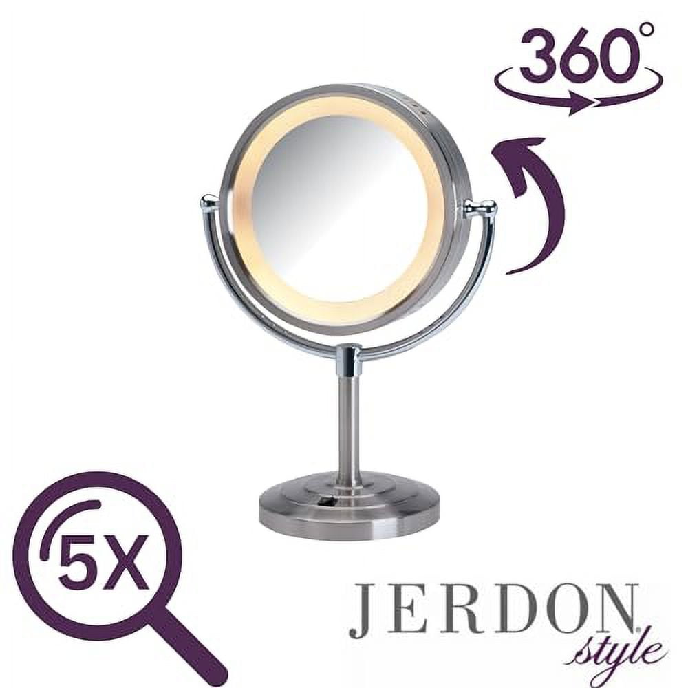 TABLETOP VANITY MIRROR – This sleek, circular mirror looks stunning on any vanity or bathroom counter. The modern, nickel finish base matches a variety of home styles and aesthetics. This tabletop mirror is great for getting ready, especially for styling hair and applying makeup. The magnification offers a close-up view, allowing you to see every detail and perfect your look! LED LIGHTING – This Jerdon makeup mirror features LED lighting around the perimeter of the circular frame. Experience flawless makeup application and grooming with the combination of bright lights and 5X magnification LUXURY DESIGN – Update your bathroom vanity with this ultra-modern makeup mirror. The simple, nickel base paired with the halo lighting creates a contemporary look that is sure to impress. This elegant mirror is used in luxury hotel rooms across the world. MAGNIFICATION OPTIONS – This Jerdon makeup mirror has 2 magnification levels, 1X and 5X. The 5X magnification makes tweezing and grooming easier while the 1X is perfect for basic skincare and makeup application. SPECIFICATIONS – This simple, elegant personal mirror is perfect for any bathroom. This 8.5-inch diameter mirror is great for shaving, grooming, makeup application and more! The tabletop mirror stands 15.5 inches high and has a lightweight base for easy mobility. Protected under a 1-year warranty
