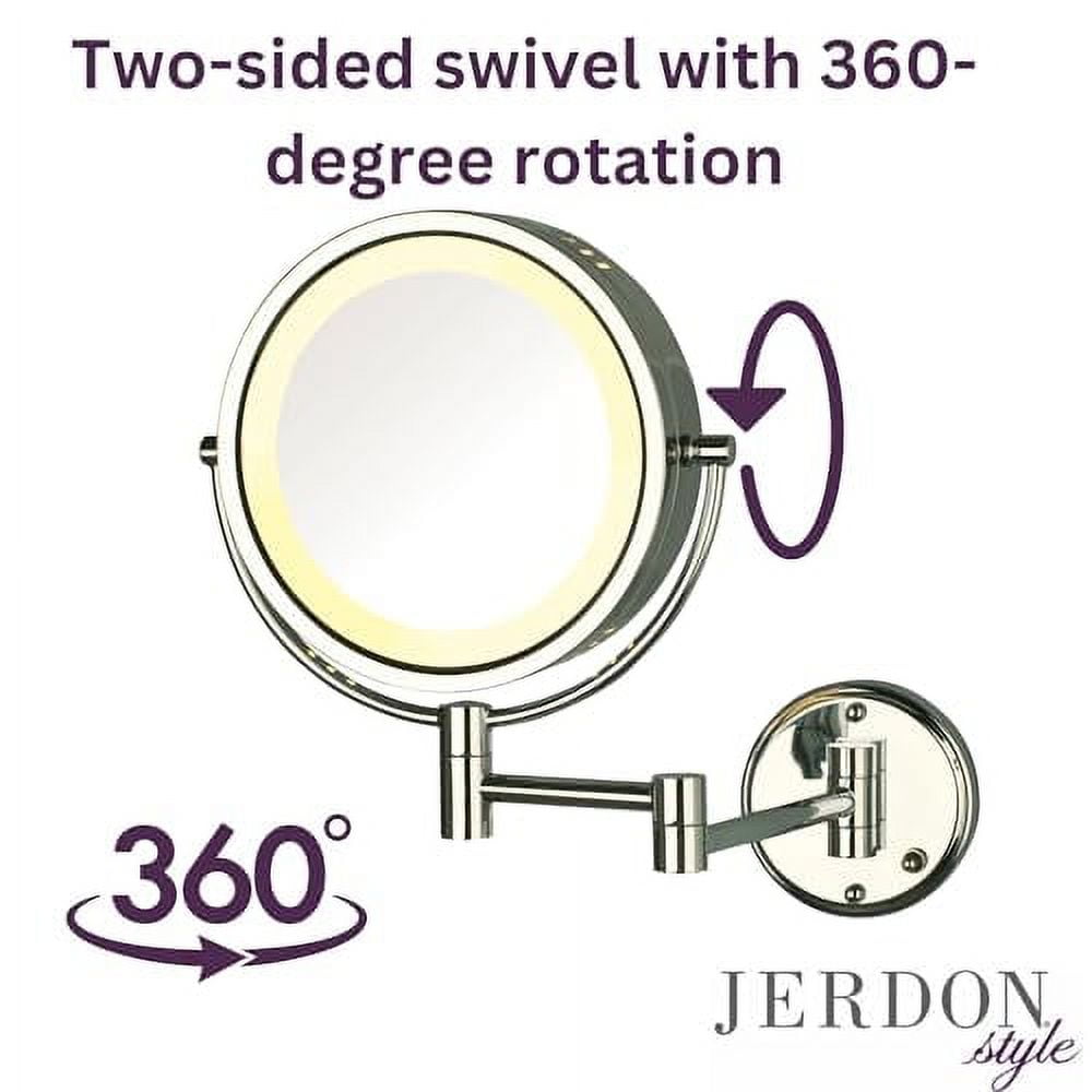 WALL-MOUNT CONVENIENCE – Experience the space-saving convenience of a wall-mounted makeup mirror. This is a direct wire makeup mirror so there is no power cord or plug. This circular makeup mirror is easy to install and attached to a 13.5-inch arm that extends from the wall, saving you space. LED LIGHTING – This Jerdon makeup mirror features LED lighting around the perimeter of the circular frame. Experience flawless makeup application and grooming with the combination of bright lights and 8X magnification MODERN STYLE – This Jerdon wall-mounted personal mirror features a round mirror attached to the chrome finish extendable arm. This modern makeup mirror looks stunning in any bathroom and saves space. The swivel capability and moveable arm make this mirror as functional as it is stylish MAGNIFICATION OPTIONS – This Jerdon makeup mirror has 2 magnification levels, 1X and 8X. The 8X magnification makes tweezing and grooming easier while the 1X is perfect for basic skincare and makeup application. SPECIFICATIONS – This chrome finish mirror includes a 13.5-inch extendable wall-mount and mounting hardware, allowing you to save valuable counter space. This 8.5″ diameter mirror is great for shaving, grooming, makeup application and more! This is a direct wire Jerdon makeup mirror that is protected under a 1-year warranty. The location where the mirror is mounted will require a junction box with a live wire in order to provide light.