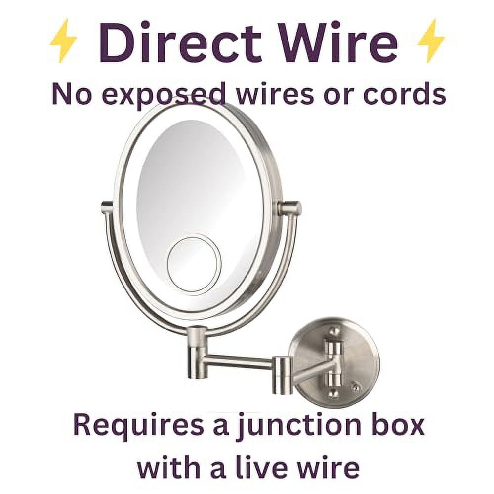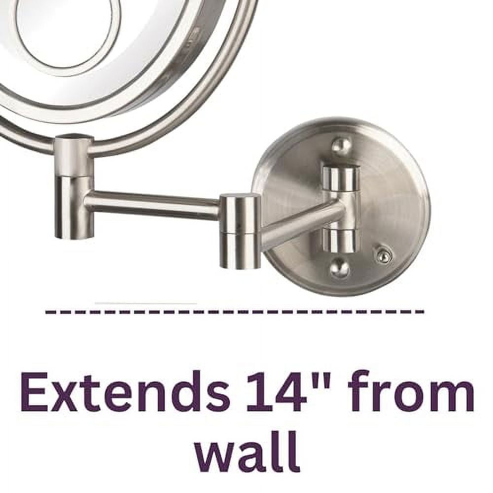 WALL-MOUNT CONVENIENCE – Experience the space-saving convenience of a wall-mounted makeup mirror. This mirror is attached to a 14-inch arm that extends from the wall. Save valuable counter space with this adjustable, wall-mount mirror SWIVEL DESIGN – The makeup mirror features a smooth, 360-degree swivel design. The extendable arm combined with the swivel function makes grooming and makeup application easier and more convenient. Easily switch from 1X to 10X magnification MODERN STYLE – This Jerdon wall-mounted personal mirror features an oval mirror attached to the nickel finish extendable arm. This modern makeup mirror looks stunning in any bathroom and saves space. The swivel capability and moveable arm make this mirror as functional as it is stylish MAGNIFICATION OPTIONS – This Jerdon makeup mirror has 2 magnification levels, 1X and 10X. The 10X magnification makes tweezing and grooming easier while the 1X is perfect for basic skincare and makeup application. SPECIFICATIONS – This elegant lighted personal mirror is perfect for any bathroom, especially ones that are low on space. This nickel finish mirror includes a 14-inch extendable wall-mount and mounting hardware, allowing you to save valuable counter space. This 8″ by 10″ mirror is great for shaving, grooming, makeup application and more! The location where the mirror is mounted will require a junction box with a live wire in order to provide light.