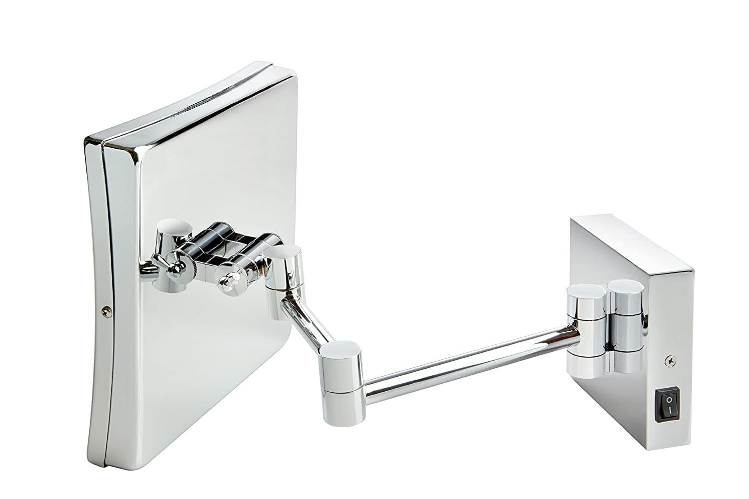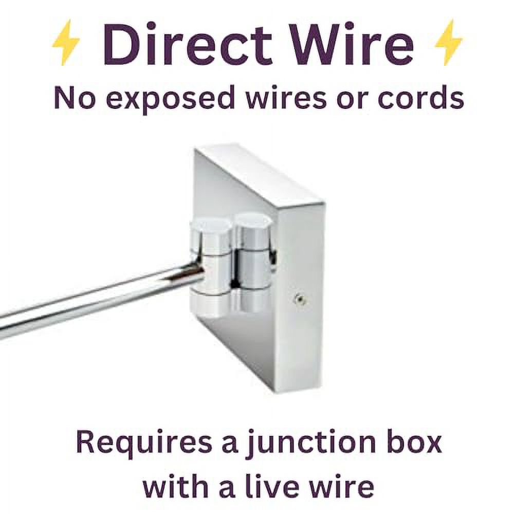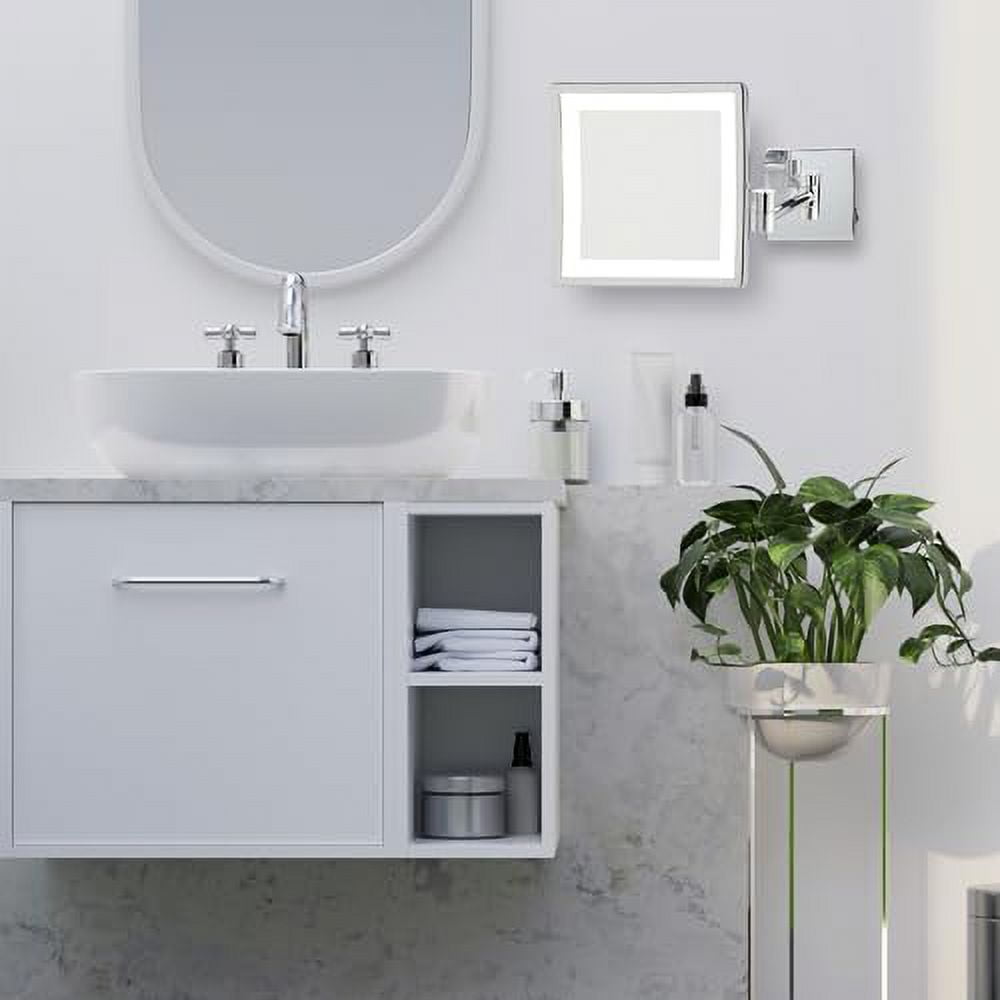 WALL-MOUNT CONVENIENCE – Experience the space-saving convenience of a wall-mounted makeup mirror. This is a direct wire makeup mirror so there is no power cord or plug.This rectangular mirror is attached to a wall mount arm that extends 16 inches from the wall. Save valuable counter space with this adjustable wall-mount mirror BRIGHT LED LIGHTING – This mirror is lighted with bright LED bulbs that produce a clean white light. The LED lighting makes it easier to apply makeup in addition to tweezing and grooming MODERN STYLE – This makeup mirror features a square mirror attached to the chrome finish extendable arm. This modern makeup mirror looks stunning in any bathroom and saves space. The lighted perimeter and adjustable arm make this mirror as functional as it is stylish MAGNIFICATION – The 5X magnification makes tweezing and grooming easier than ever. Easily move the mirror using the extendable wall-mount arm to view more angles. SPECIFICATIONS – This makeup mirror includes an extendable arm for wall-mounting with 5X magnification. The mirror has a modern chrome base. The mounting hardware is included with the mirror for your convenience. The mirror measures 8 by 8 inches and has a 1-year warranty. the location where the mirror is mounted will require a junction box with a live wire in order to provide light.