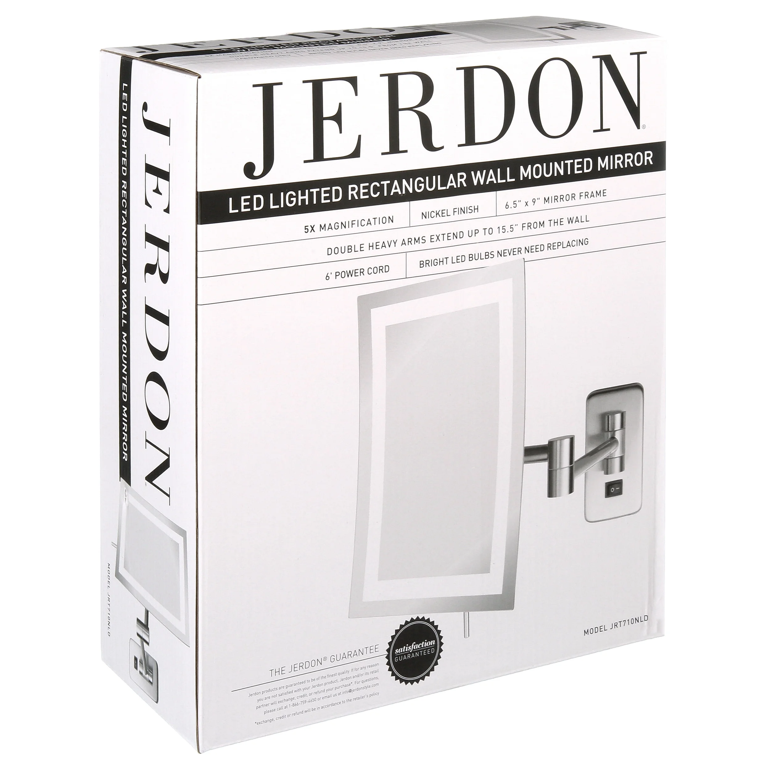The Jerdon JRT710NLD 6.5-Inch by 9-Inch Direct Wire LED Lighted Wall Mount Rectangular Makeup Mirror with nickel finish stands out with its sleek and modern look, while providing close-up magnification for flawless makeup application. Add a touch of glamour to your home with a makeup mirror that is used in luxury hotels and spas because of its convenience, sleek look and precise magnification. This single-sided mirror features a 6.5-inch by 9-inch rectangular frame that provides 5x magnification to make sure every detail of your hair and makeup are in place. This mirror is lighted with bright LED bulbs that produce a clean white light to apply your makeup. The twin heavy extension arm adjusts to all angles for a dynamic point of view. The JRT710NLD extends up to 15.5-inches from the wall and can be easily moved around, while still being firm enough to hold for odd angles. This item comes complete with mounting hardware and designed to direct wire to a junction box for the electrical connection.