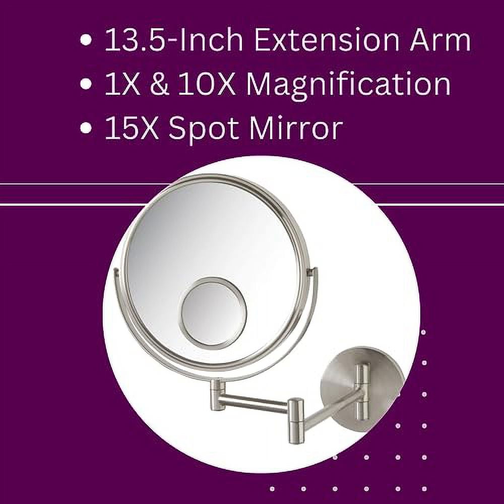 Jerdon Wall-Mounted Makeup Mirror with 10X/1X and 15X Spot Magnification -13.5 Inch Wall Extension – Nickel Finish – Model JP7510N