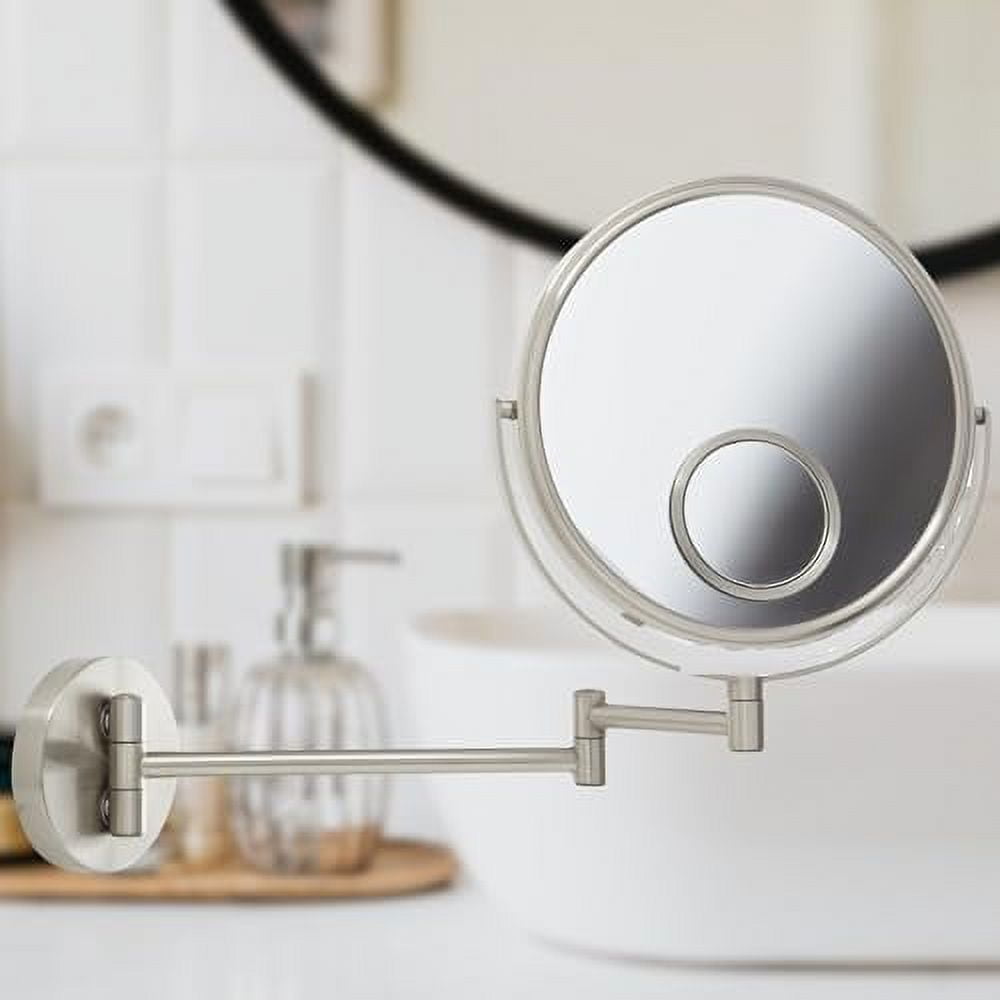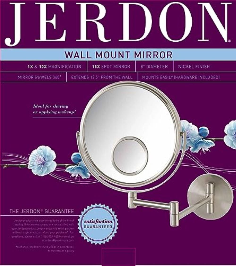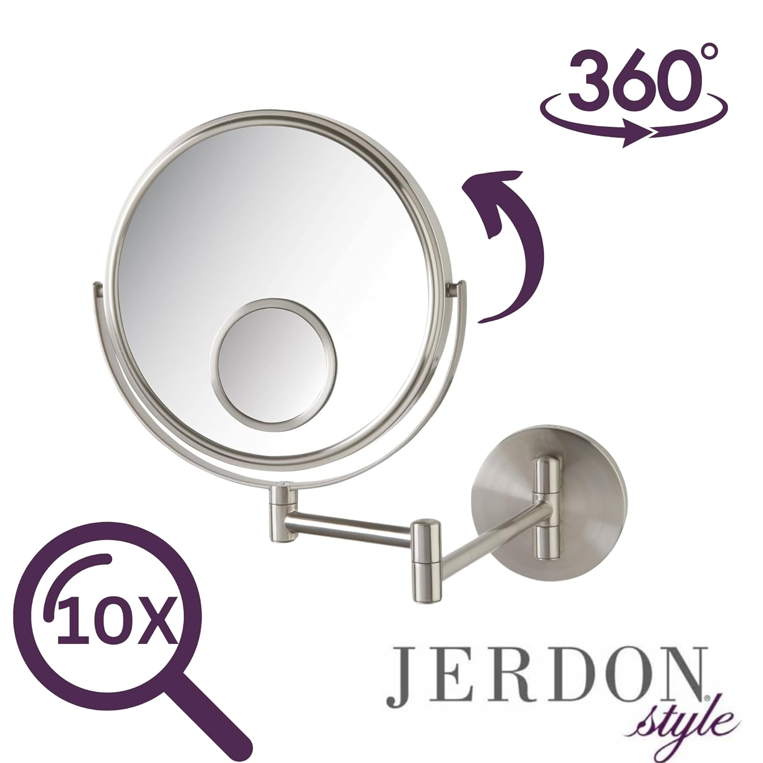 WALL-MOUNT CONVENIENCE – Experience the space-saving convenience of a wall-mounted makeup mirror. This circular mirror is attached to a sleek, folding arm that extends 10 inches from the wall. Save valuable counter space with this adjustable wall-mount mirror MODERN STYLE – The Jerdon Swivel Wall Mount Mirror features a circular mirror attached to the nickel finish, extendable arm. The swivel capability and adjustable arm make this mirror as functional as it is stylish MAGNIFICATION OPTIONS – This Jerdon makeup mirror has 3 magnification levels, 1X, 10X, and 15X. The 10X makes shaving and grooming easier while the 1X is perfect for basic skincare and makeup application. The 15X spot mirror provides a precise, close-up view, perfect for tweezing SWIVEL DESIGN – The makeup mirror features a smooth, 360-degree swivel design. The extendable arm combined with the swivel function makes grooming and makeup application easier and more convenient SPECIFICATIONS – This makeup mirror includes an extendable arm for wall-mounting with 1X, 10X, and 15X magnification. The mirror has a modern nickel finish base and a 360-degree swivel function. The mirror has an 8-inch diameter and a 1-year warranty.