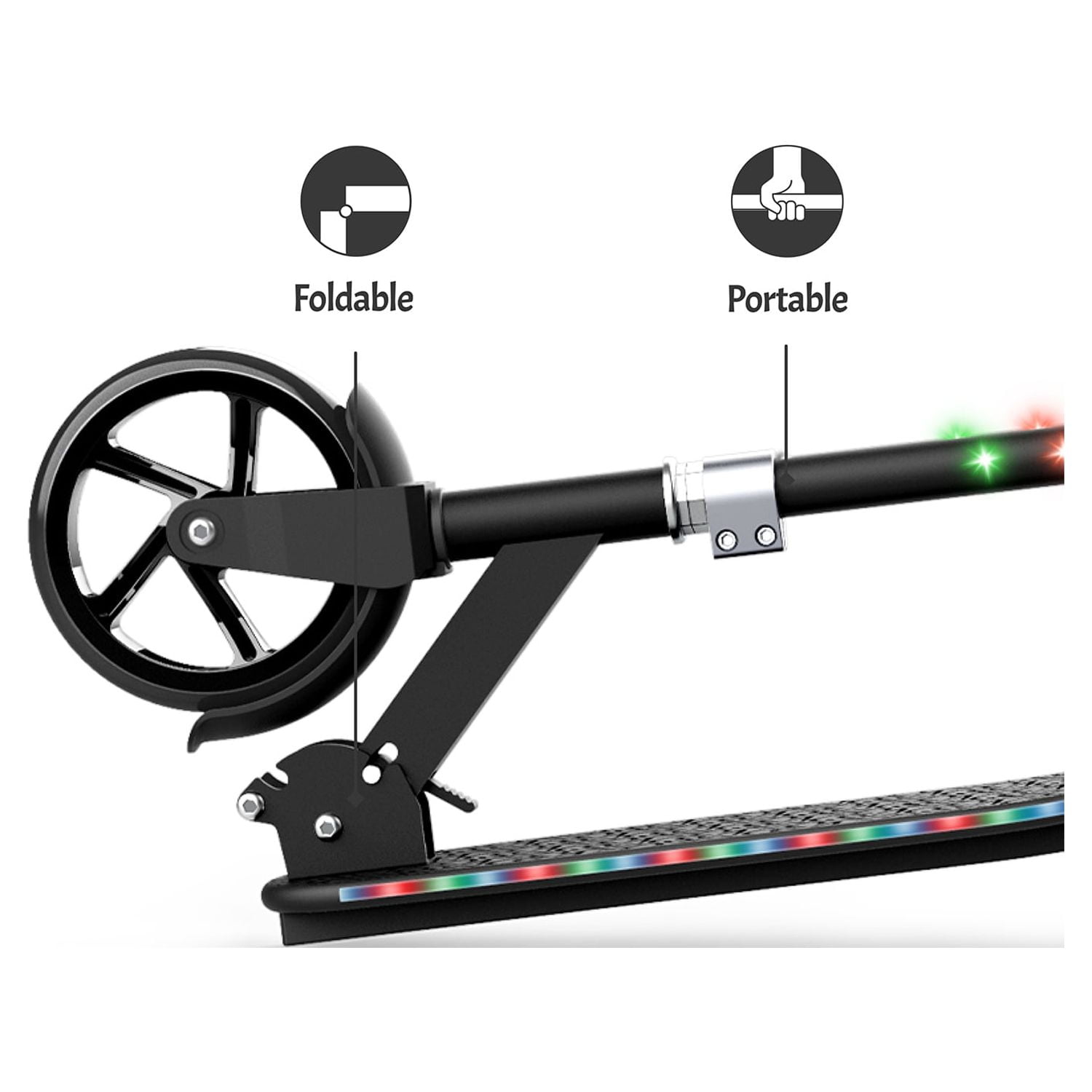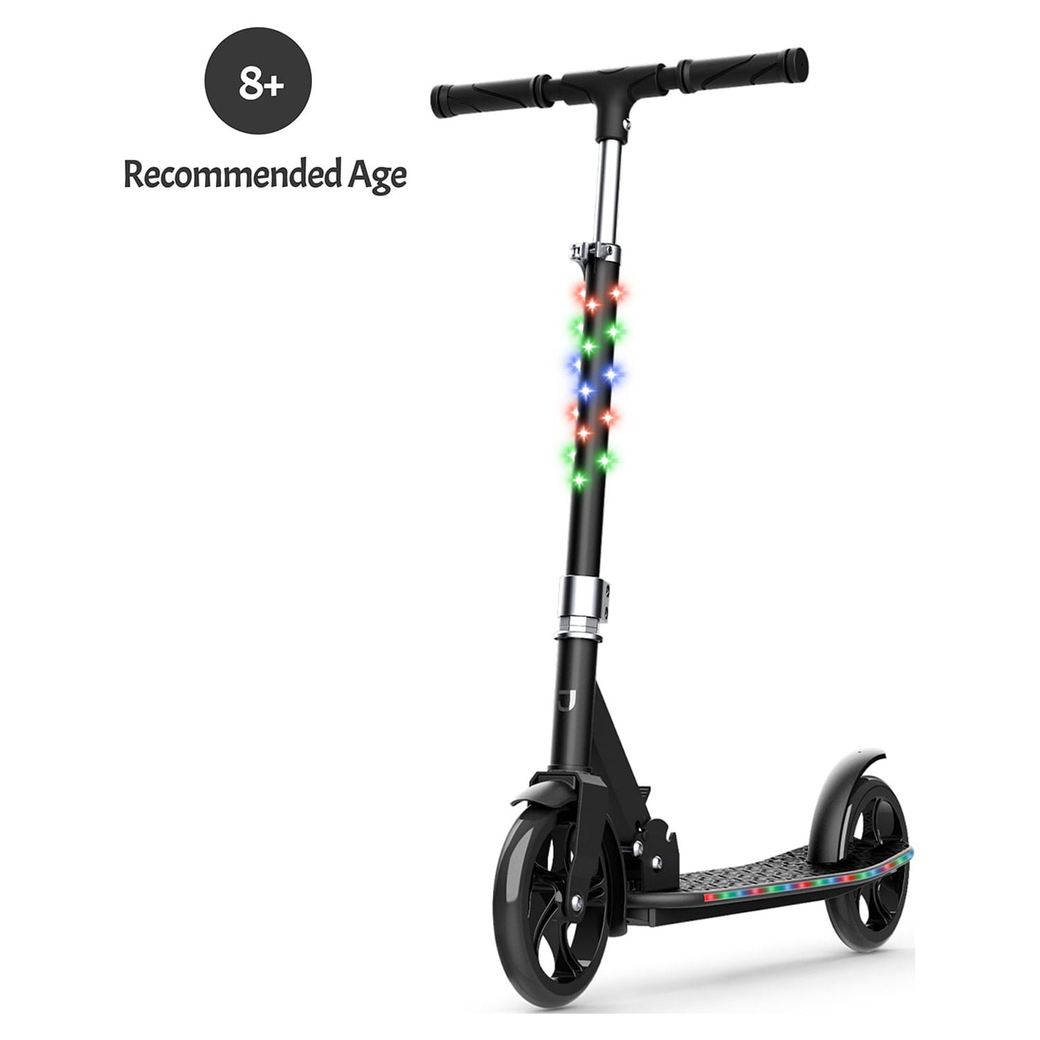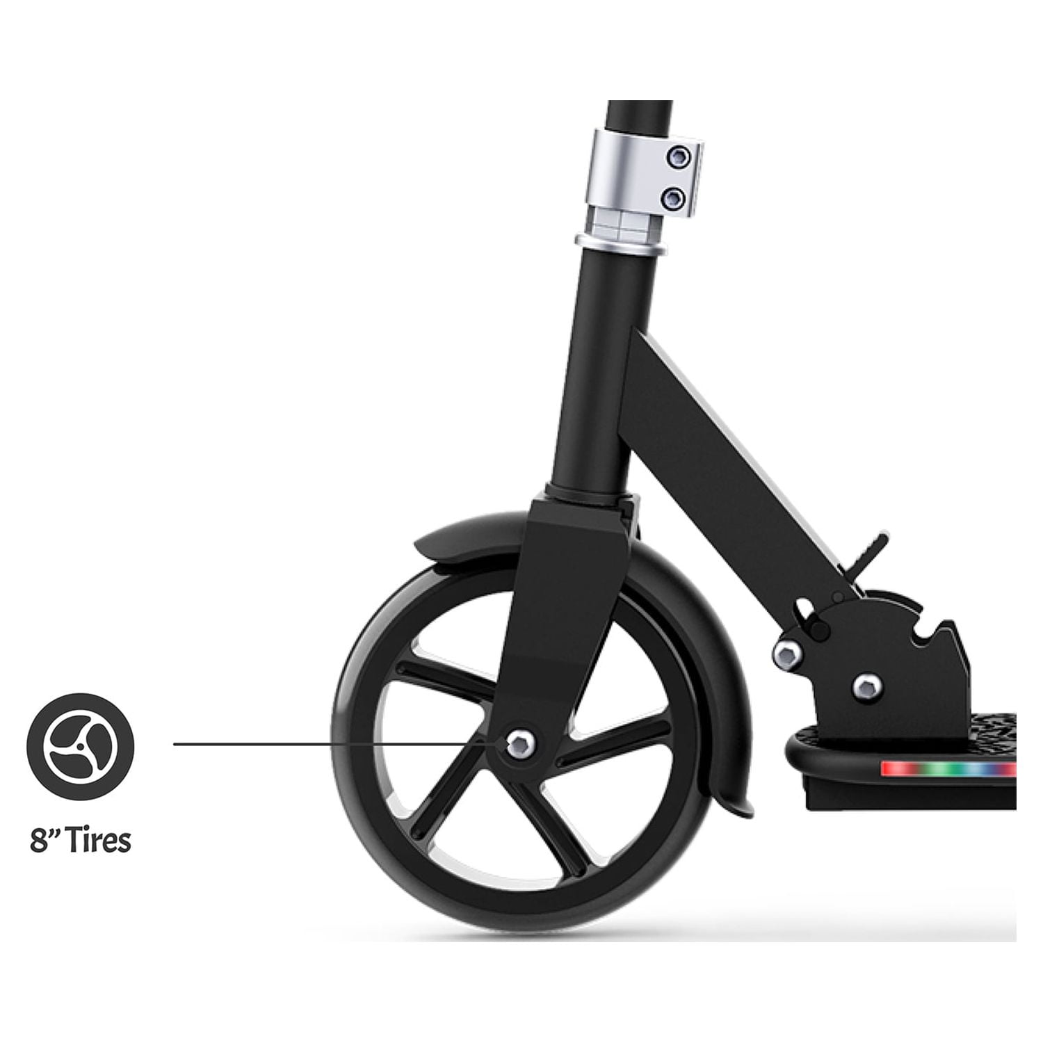 Weight Limit: Up to 165 lb Sturdy wide deck (Dims: 23.6″ × 6″) Height Adjustable Handlebar: The scooter grows with you (25.5″- 31.5″) Wheel Size: 8” Color: Black Age: Children, 8+