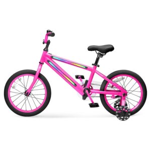 Get ready for a bike that will be sure to leave kids excited. The Jetson Light Rider M Light-up 16-inch Bike makes for a magical introduction to the joy of cycling for your littlest riders. The durable aluminum frame comes with a dazzling array of lights built into it. Insert 3 AA batteries into the frame, and with the touch of a button, you can switch between three different light modes and choose from seven colors – red, dark blue, green, yellow, pink, purple, and light blue. A bright bike for your bright spark. And if your little one is learning to ride, training wheels come included. For added fun, they light up too. Other features include a height-adjustable seat and handlebar so you can easily adjust the bike to make it comfortable for your child and alter it as they grow. And to keep things safe, an easy-to-use coaster brake back pedal to stop – means riders can always come to a solid stop. The perfect choice for boys and girls from ages 3+, this is a bike that is sure to delight.
