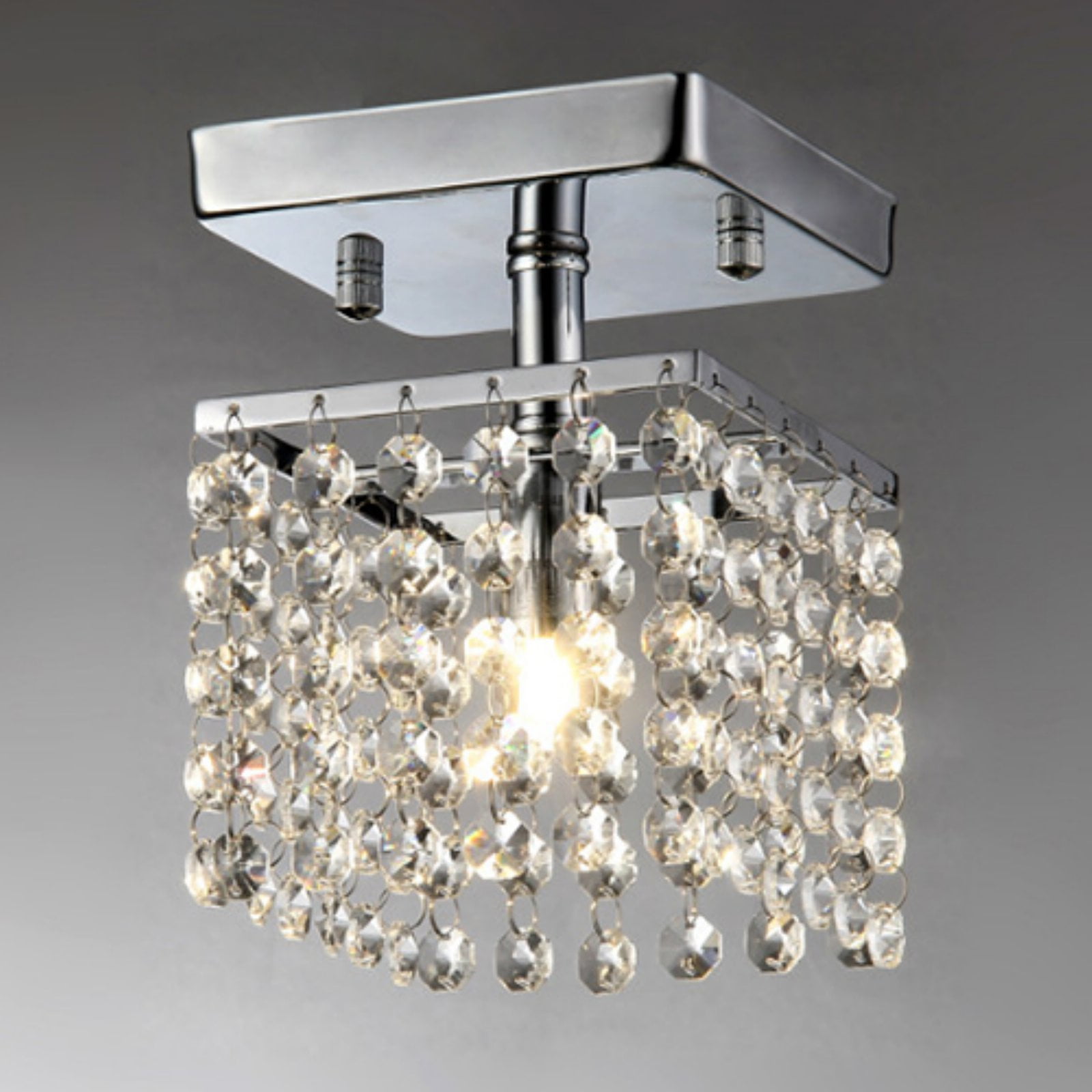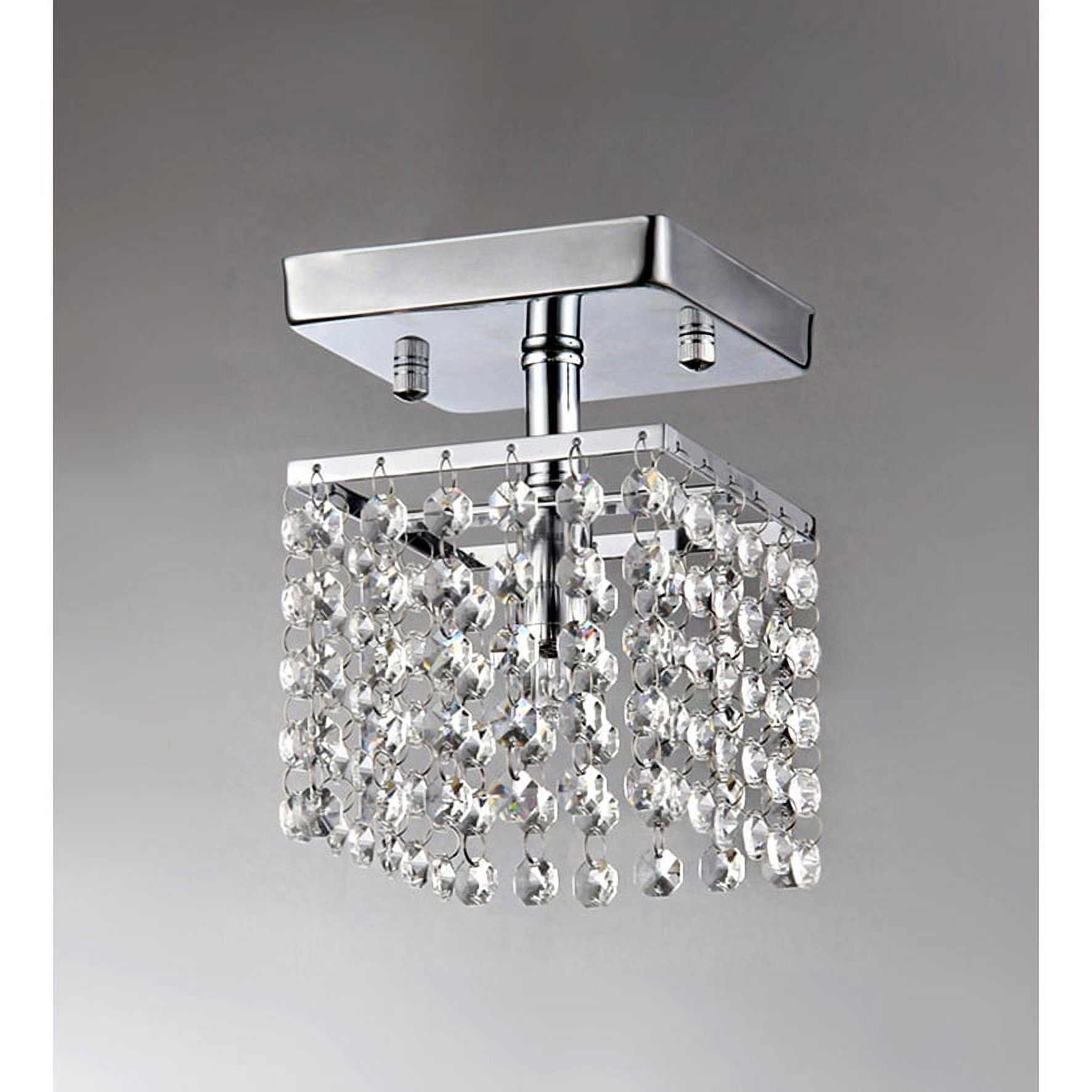 Dimensions: 5W x 5D x 6H in. Contemporary style crystal chandelier Made of iron with crystal shade Chrome finish Dangling crystals allow for open and multi-directional light Requires one 40-watt incandescent bulb (not included)