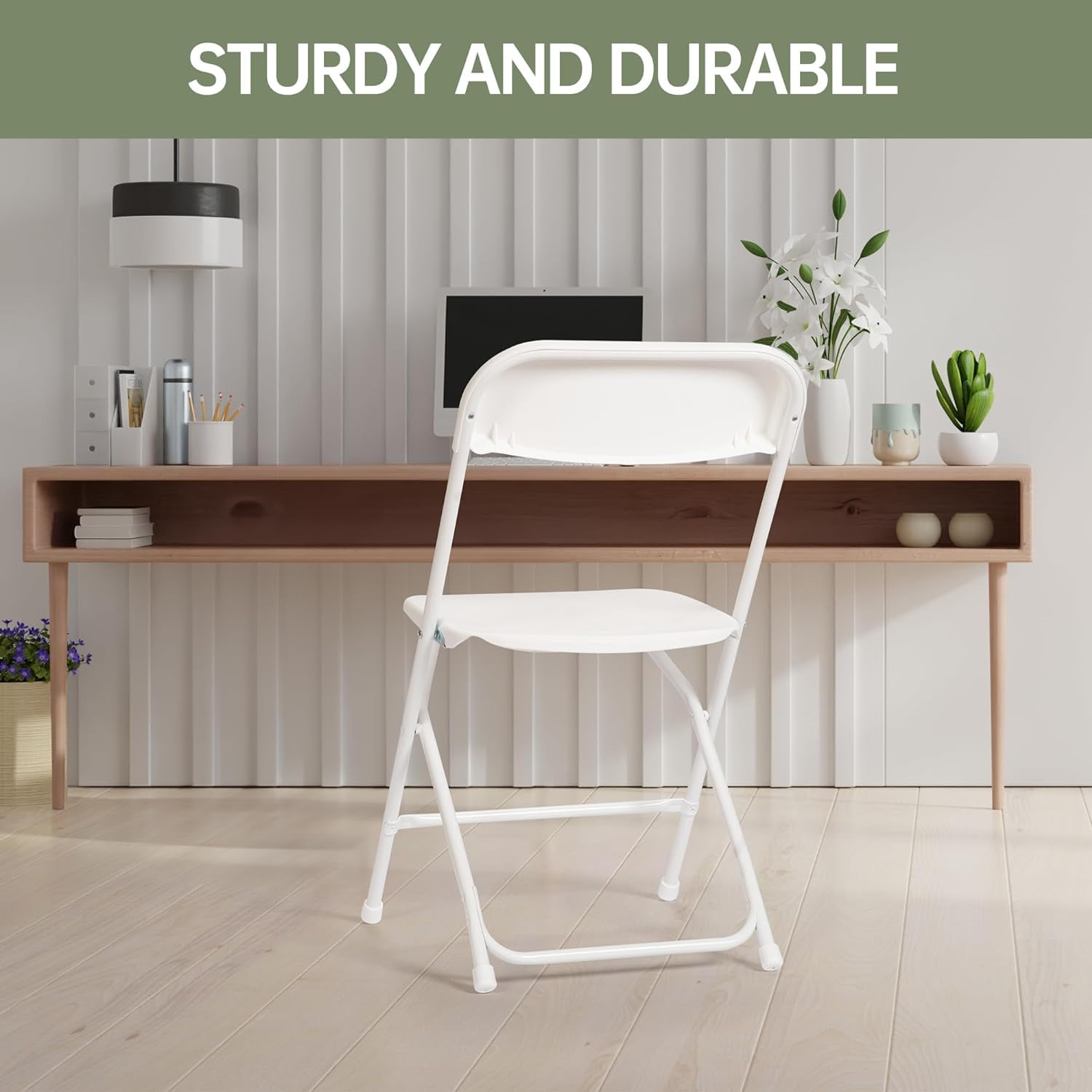 4 PCS Plastic Folding Chair, Portable Commercial Chair, 350 LB Capacity Plastic Folding Chairs, Folding Chair for Wedding Party Outdoor Indoor White Classic design: Our plastic folding chairs feature a sleek and modern design that offers comfort and convenience while adding a touch of elegance to any event, and they are simple and elegant in design and can be used for different events. They are not only modern decorations for your home or office, but also suitable for occasions such as weddings or parties. Backrest Design: The backrest of the folding chair is ergonomically designed to enhance your back support and relieve spinal pressure. Durable materials: Our plastic folding chairs are made of high-quality, durable polypropylene material with steel frame construction. The chair legs are reinforced with high-quality steel and fixed with an extra steel pipe, which improves the load-bearing capacity and makes it more stable during use. Multifunctional chair: These chairs are easier to store without taking up space. Lightweight and easy to transport, which are perfect for outdoor activities, picnics and camping trips. Also these chairs are configured with anti-slip pads that prevent scratches and damage to floors, making them ideal for indoor events. When not in use, they can be easily folded for easy storage. Specifications: Material: Plastic & steel Dimensions: 17.7″D x 17.7″W x 31.5″H Seat Dimensions: 13.6″ x 13.6″ Seat Height from Floor: 17.3″ Weight Capacity: 350lbs Color: White