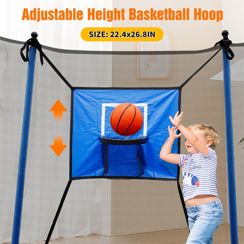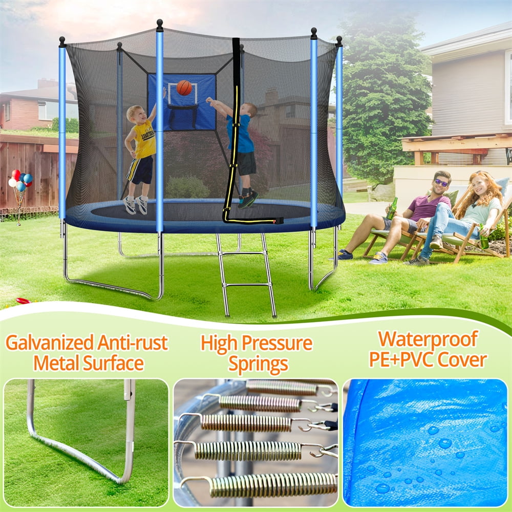 8FT Kids Recreational Trampoline with Basketball Hoop, Enclosure Net and 2 Steps Ladder for Indoor, Outdoor and Backyard, Blue