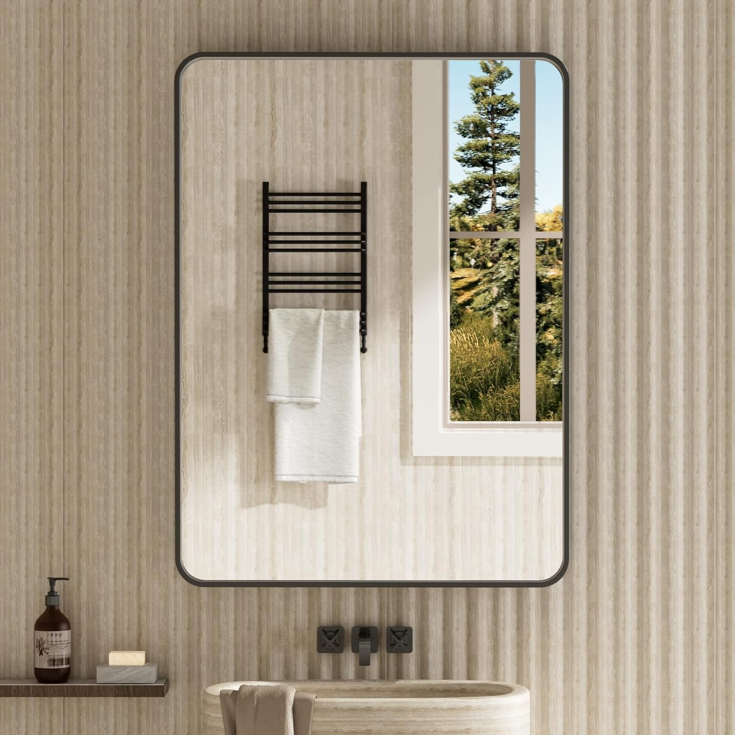 A:The matte black bathroom mirror can be wall-mounted installed horizontally or vertically or you can lean against the wall.