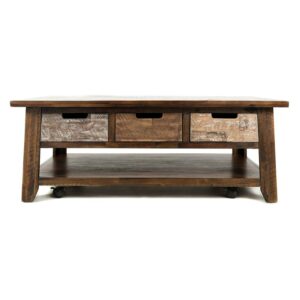 With a beautiful combination of rustic charm and unique hand-finished distressing on the drawer front, the Painted Canyon Three Drawer Coffee Table is the perfect upgrade for your living room. Made from solid Acacia hardwood, the natural material is wonderfully unique and has subtle detailing that compliments any style decor with three built in pull-through drawers and built-in caster wheels to make moving a breeze.