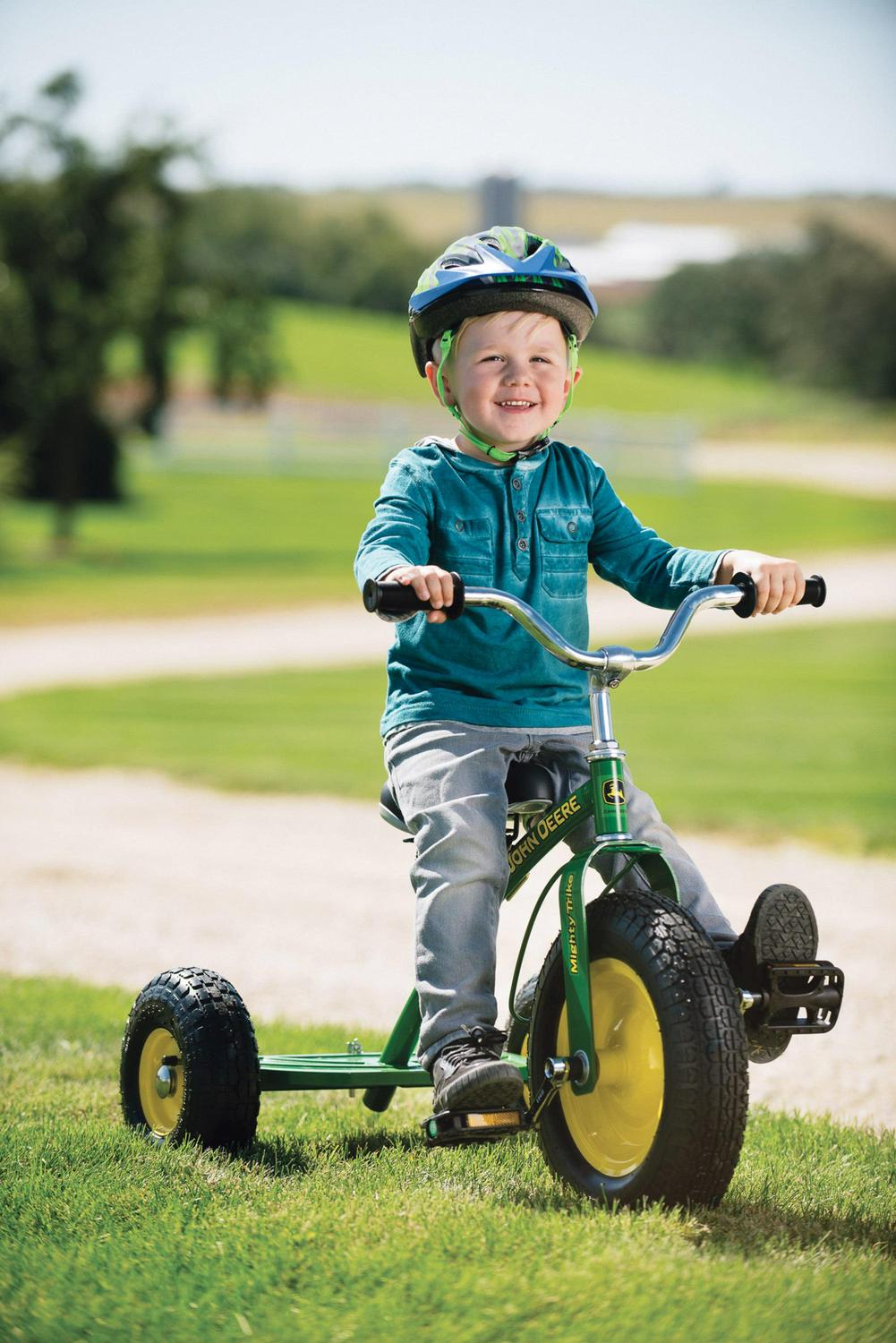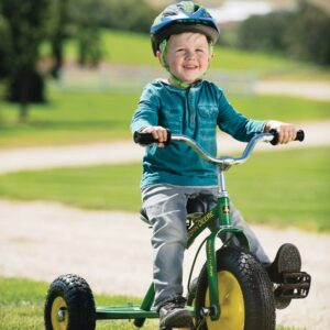 Your little road warrior will love pedaling around on the John Deere Mighty Trike 2.0. Constructed of ultra-tough heavy duty steel and featuring authentic John Deere colors, this tricycle will stand up to the enthusiastic riding that kids love. Large pneumatic tires, an adjustable padded seat, and comfort grip handle bars provide a smooth and comfortable ride. This ultimate trike is ready to conquer the sidewalks and driveways in every neighborhood!