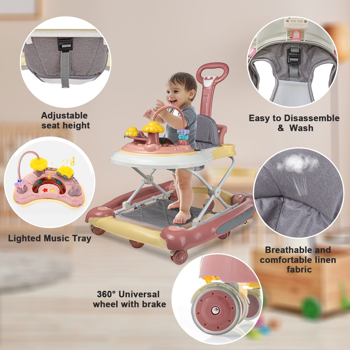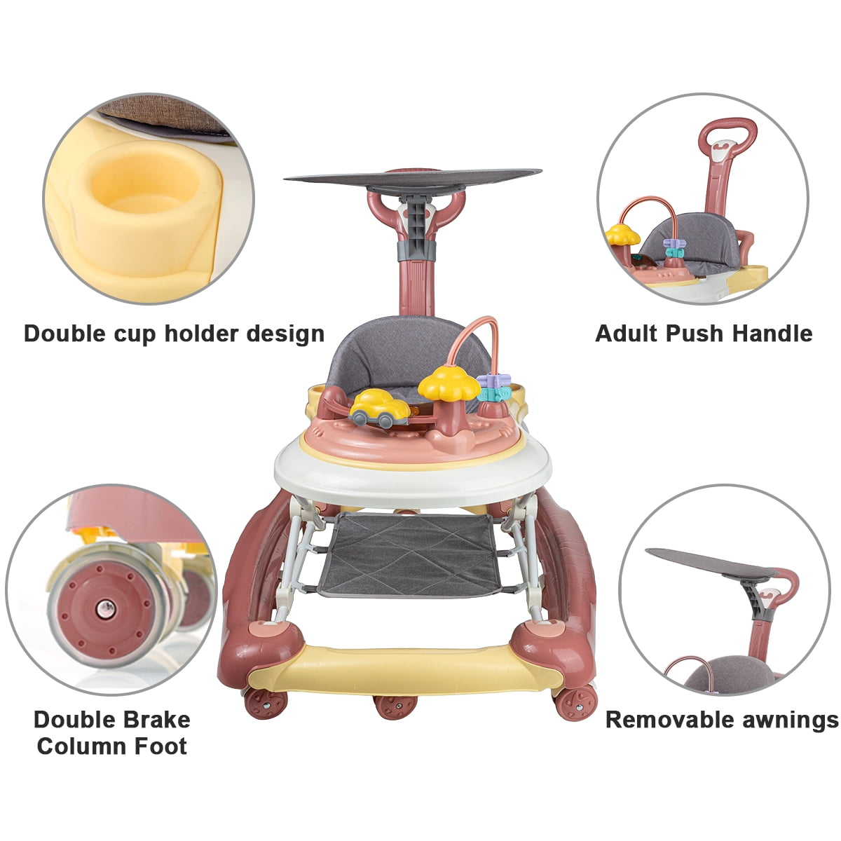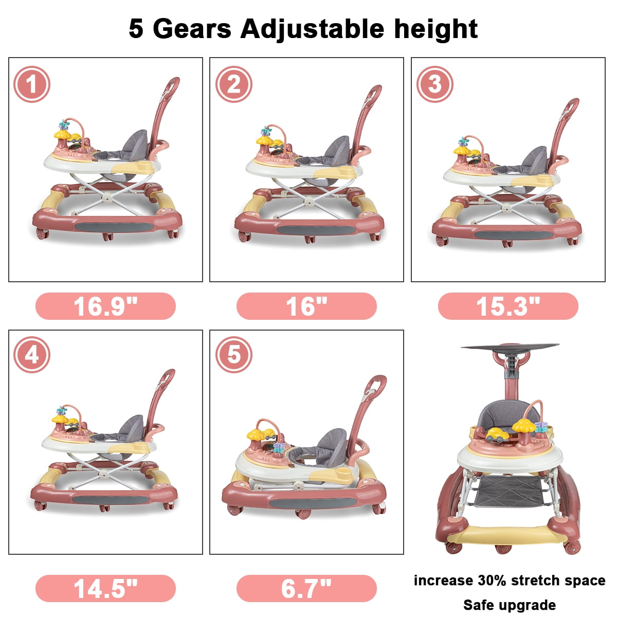 FACNOATIHN 5-in-1 Baby Walker, Musical Activity Push Walker with Detachable Awning Footrest, Adjustable Height, Pink