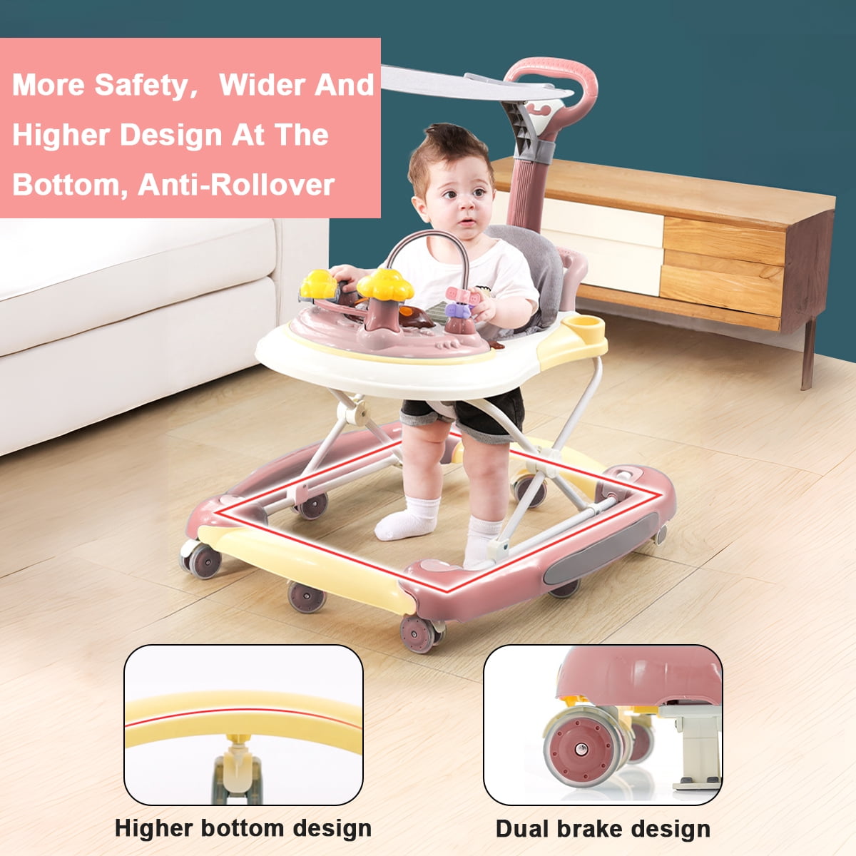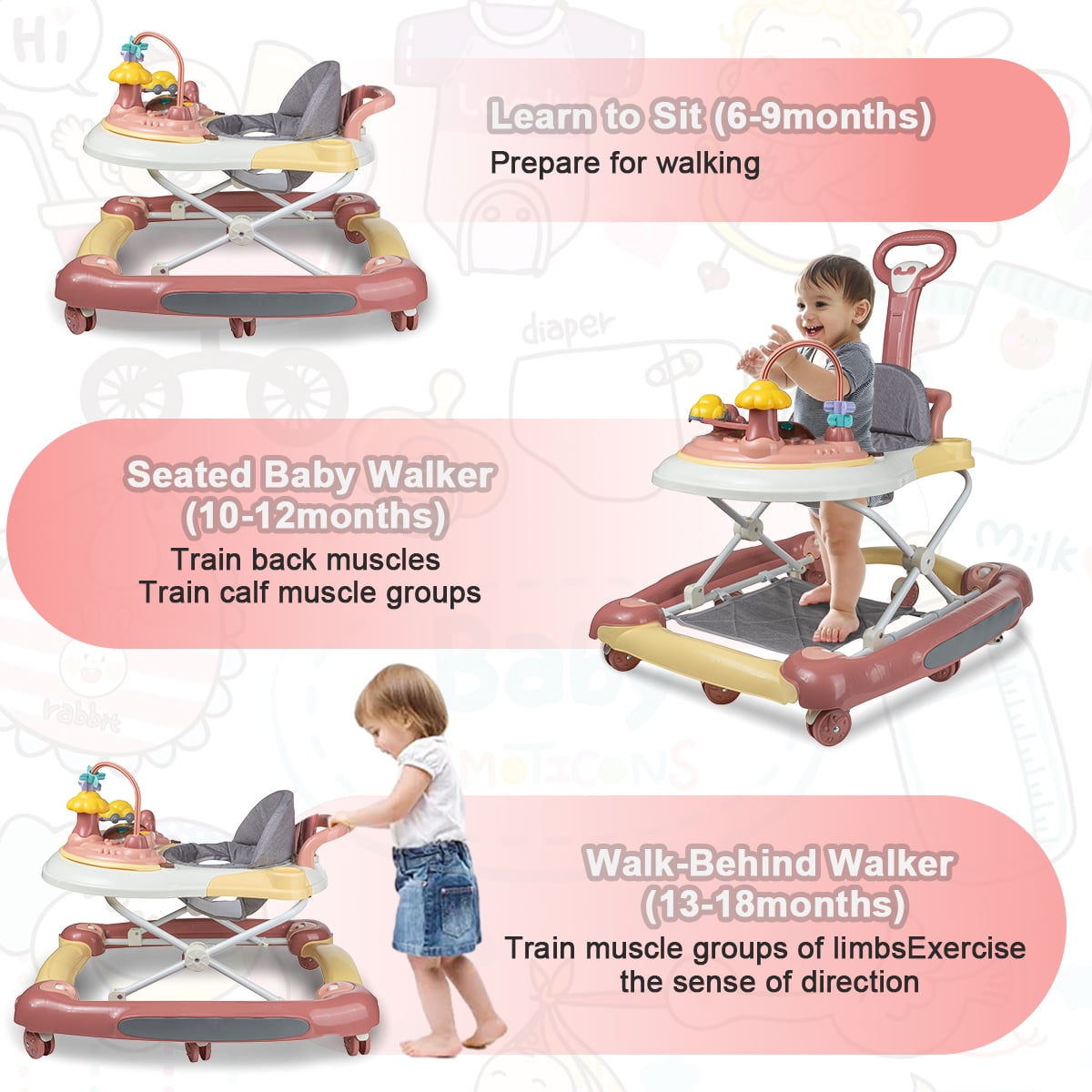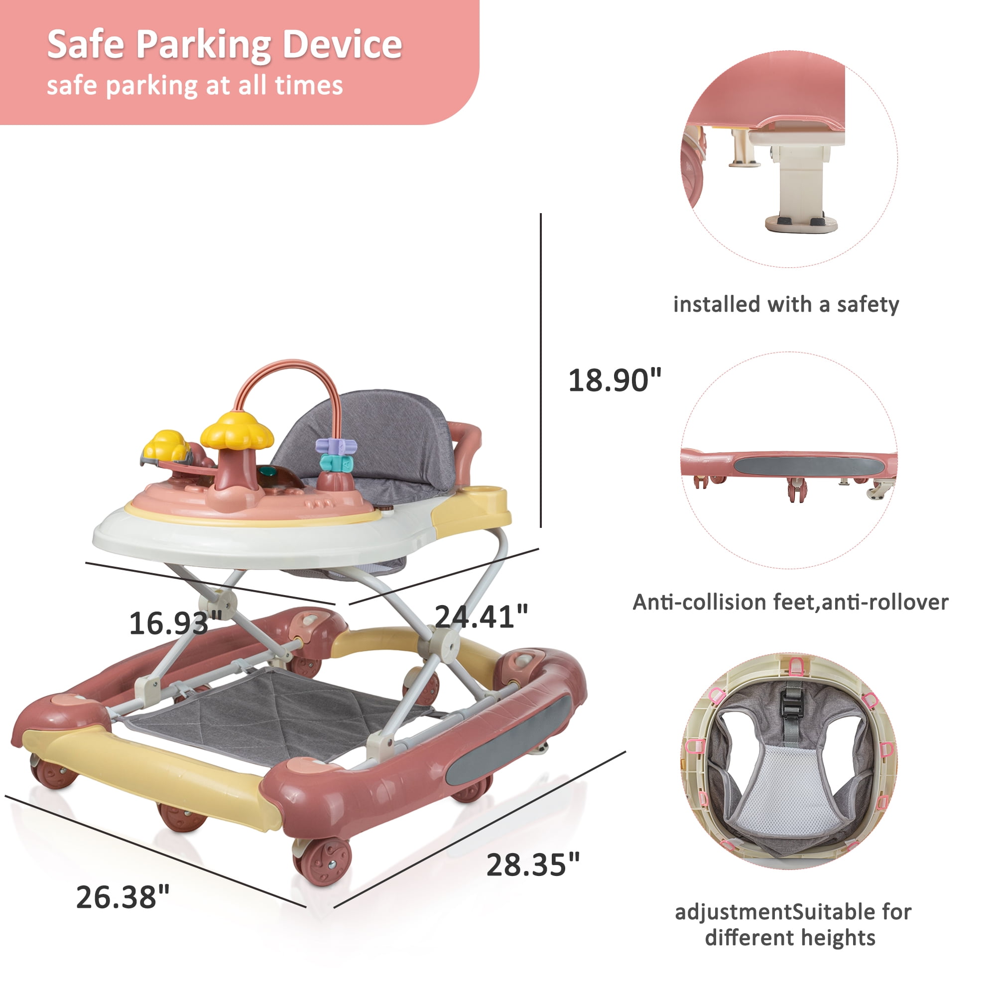 FACNOATIHN 5-in-1 Baby Walker, Musical Activity Push Walker with Detachable Awning Footrest, Adjustable Height, Pink