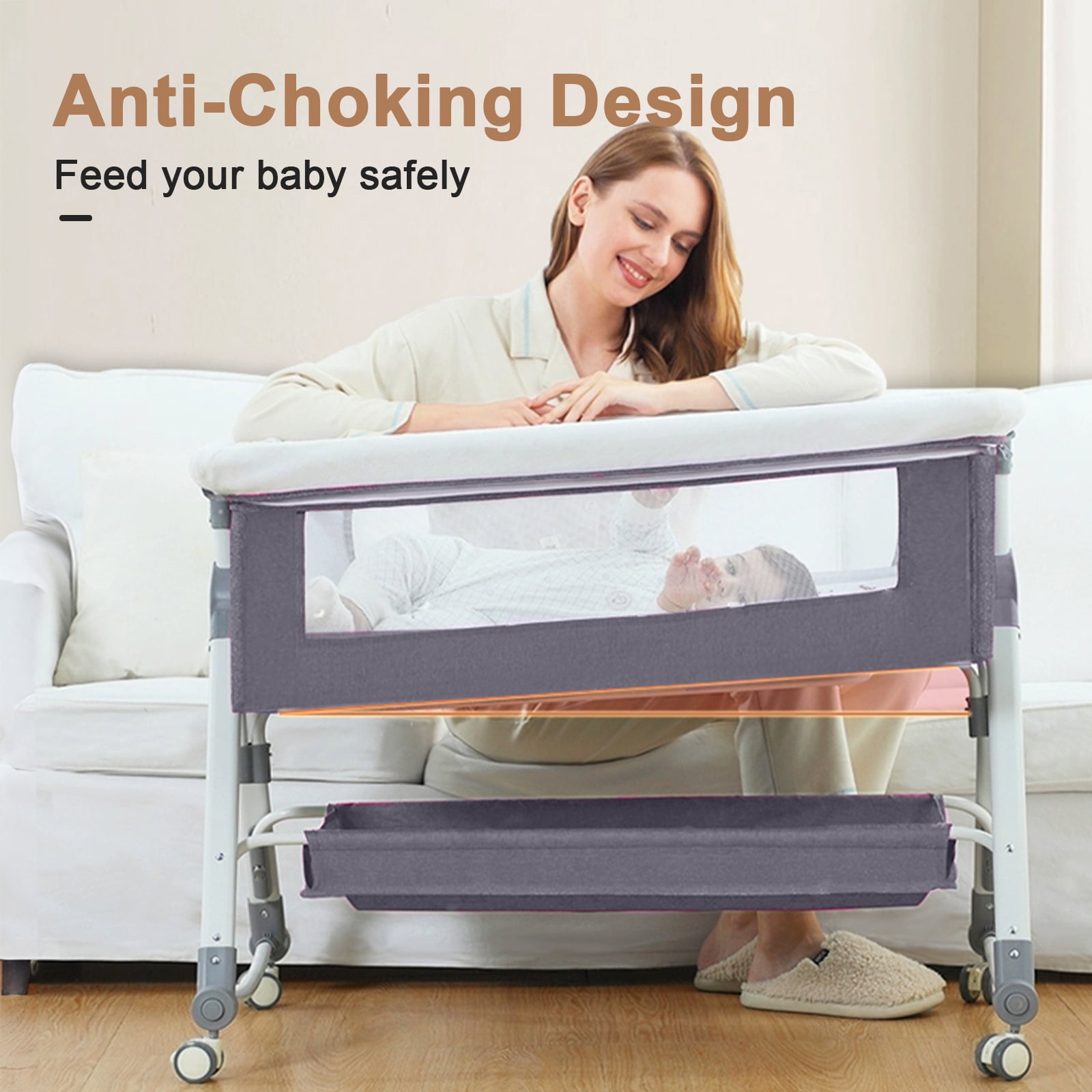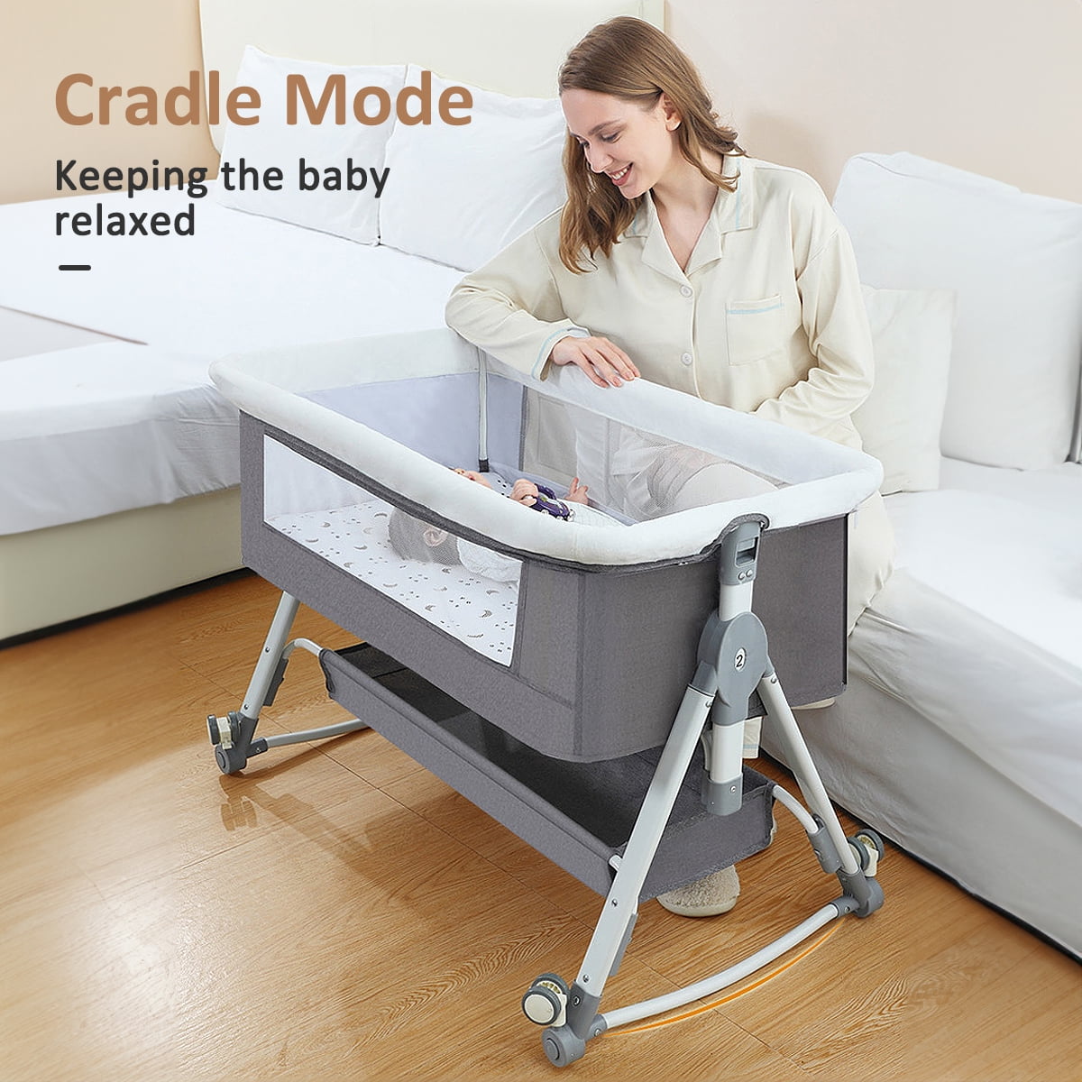 Bassinet & Crib Modes The Splicing Big Bed is Opened on the Side, Close to the Big Bed at Zero Distance, Convenient for Taking Care of the Baby at Night.Cradle mode allows your baby to be relaxed. Changing Table Mode No installation required, easy for mom to change baby’s diaper. Adjustable Height It is Suitable for Big Bed, and the Height of the Crib Can Be Adjusted on 5 Levels, Which Can Easily Adapt to the Height of a Big Bed and Mother, Making It More Convenient to Use. Silent Universal Wheel Free to Push, Equipped with Casters, Universal Push, Easy to Move with Brakes, Stable Cot Without Running Around. With Storage Basket There is a large storage basket under the bassinet that fits baby essentials like diapers, wipes, clothes. Lightweight design, easy to carry, and perfect for travel. Breathable Mesh and Easy to Clean This breathable fabric is also made to promote airflow, giving the baby a cooler and comfortable space to rest. The mattress cover and all crib fabrics are easy to remove and clean, creating a clean environment for the baby.