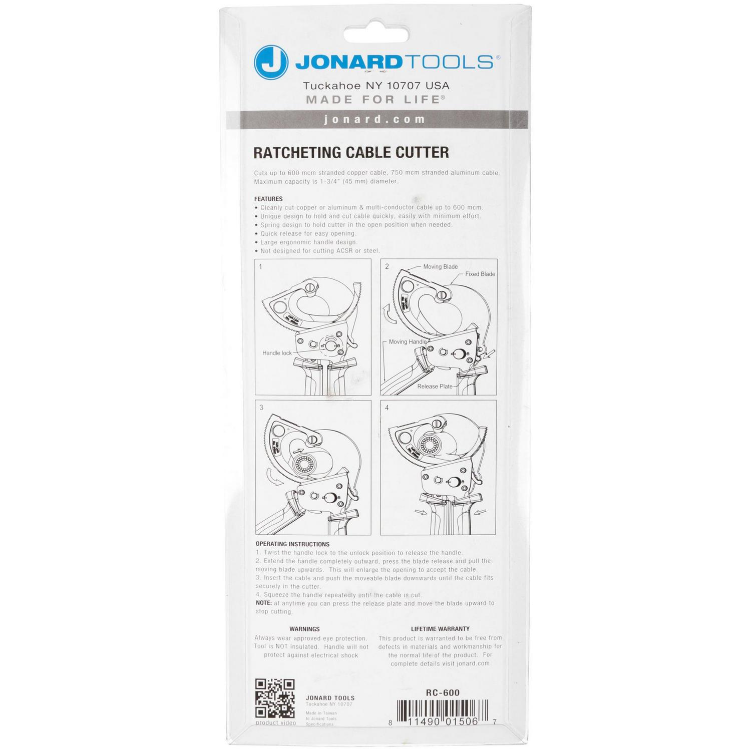 The Jonard Tools RC-600 Ratcheting Cable Cutter is your new go-to piece of equipment for your next job. This cable cutter will enable you to cleanly cut copper cable up to 600 mcm. The product will also cut up to 750 mcm stranded aluminum cable. The spring design can allow you to hold the cutter in the open position when you need to. There s a quick release for easy opening. We all know that Jonard tools are built for life. This shows in the ergonomic handle and the overall design of this tool to allow operators to hold and cut cables quickly with minimum effort used. Work smarter and not harder with Jonard Tools RC-600 Ratcheting Cable Cutter!