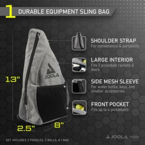 All your pickleball essentials for two players are together in one complete set with the Joola Essentials Pickleball Set! Two pickleball paddles in black and blue, 2 pickleball balls, and a stylish Joola sling bag to carry it all onto the court. Function, form and expertly designed equipment will bring your game to the next level with your Joola Pickleball Essentials set!