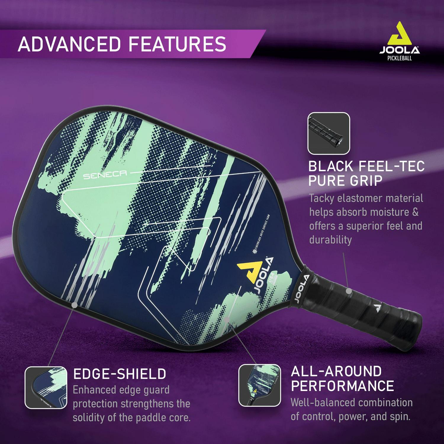 The JOOLA Seneca CDS 16mm Pickleball Paddle delivers precision for advancing players to control their shots. The thicker 16mm pickleball racquet offers an extra level of touch while the carbon fiber construction keeps it lightweight enough to put plenty of power into your swing. Fatigue reducing handle with black Feel-Tec Pure Grip allows for a more comfortable hold that allows for longer play and greater confidence in each stroke.