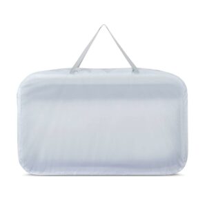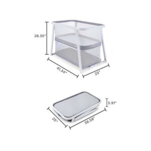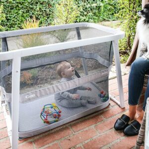 Coo Portable Bassinet Playpen Folds flat for travel and storage Great for small spaces Perfect for room sharing families Use it longer goes from bassinet to playpen with a zipper Convenient under-bassinet storage Machine-washable mattress cover 100% see-through and breathable Rocks or stays put, you choose Easy two-step fold Comes with travel bag, mattress, and mattress cover