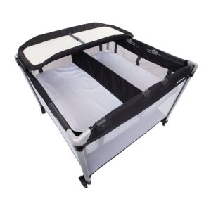 The Joovy Room2 Twin Nursery Center is the perfect accessory for the Room2 Playard. Includes bassinet and changing table (playard sold separately). Use the removable full-length bassinet for 2 infants up to 15 pounds and the flip-away changing table for a single baby up to 25 pounds. Keep your little ones comfy at naptime, playtime, or nighttime, and at home or on the road with the, Joovy’s Twin Nursery Center was made for the room playpen and to make life with littles easier. With a removable changing table and bassinet with an optional divider, the twin nursery center is perfect for everyone especially families with twins. Use the room twin nursery center’s bassinet at full size, or zip in the divider for twins. When they’ve outgrown the bassinet, remove it and store it, and use Room2 as safe sleep and play space. The changing pad flips over the side and out of the way so babies can lay and play, and the included pad is 100% machine washable.