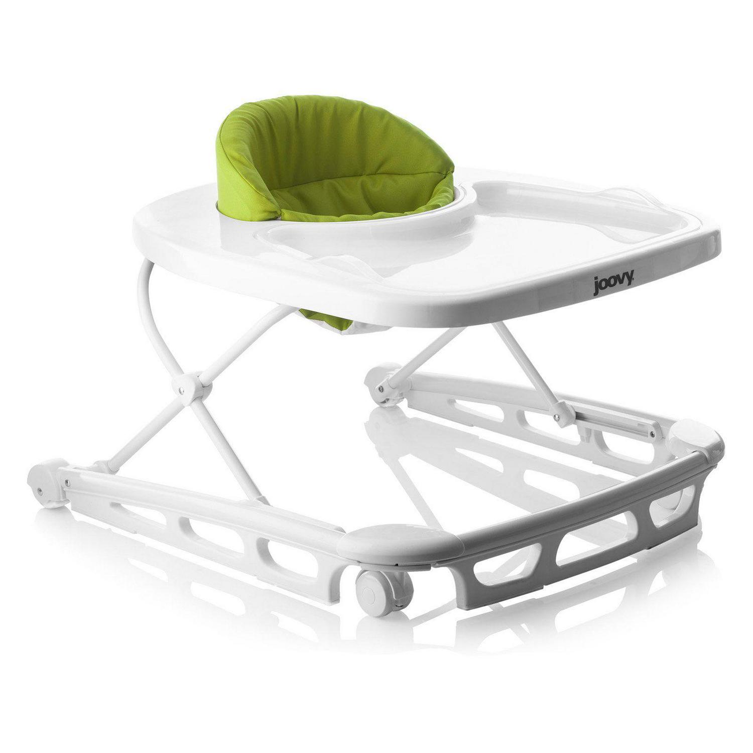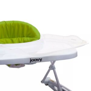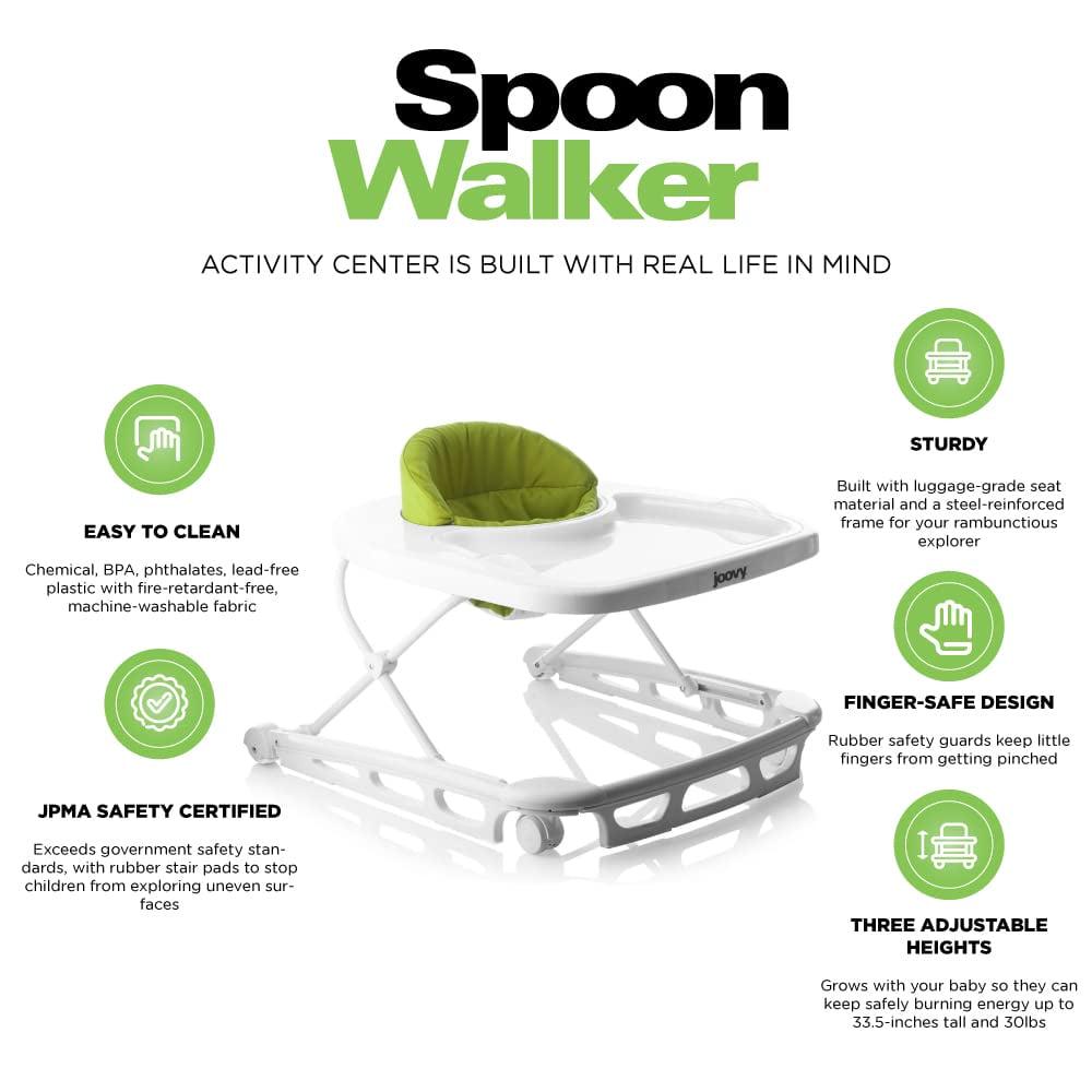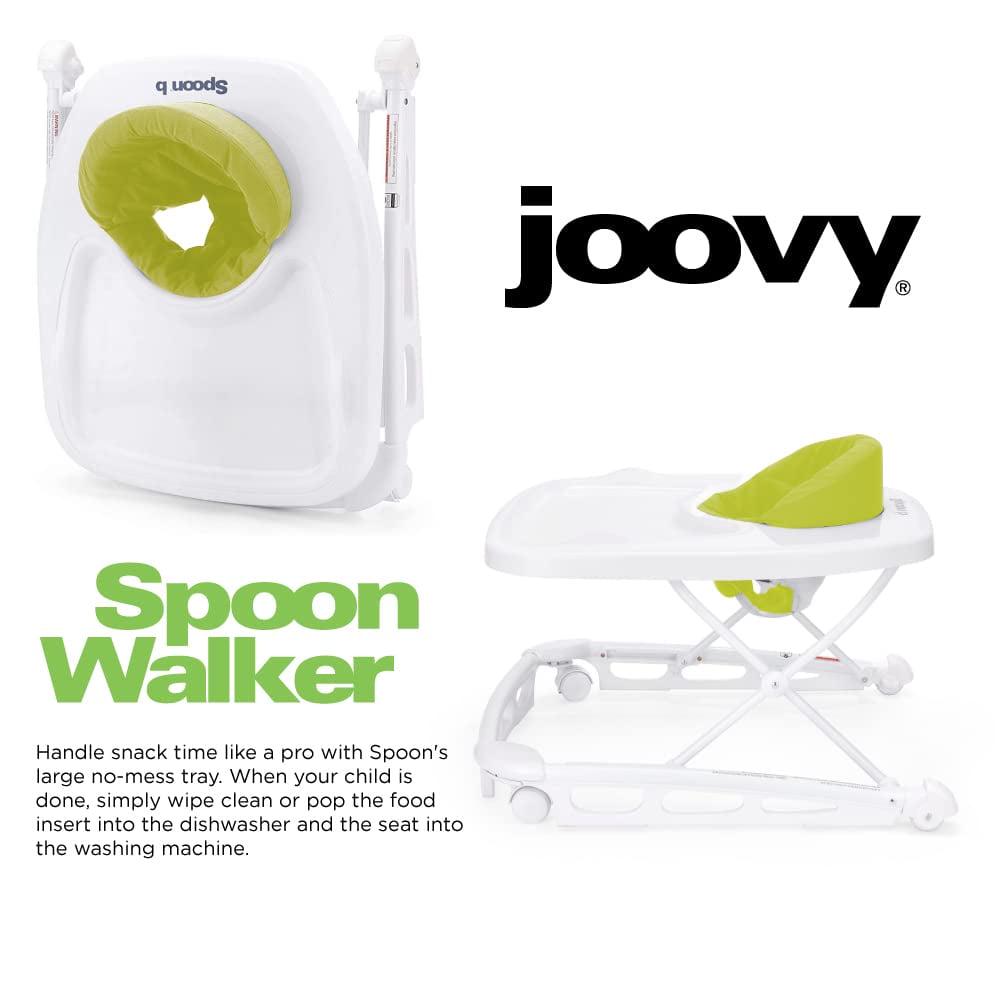 Walker meets high chair. The Spoon walker combines these two essential products into one to provide the perfect balance of eating, playing, and learning to walk! Practical and good-looking, the Spoon will blend perfectly into your kitchen and home decor. For meal and snack time, the Spoon comes with a super-sized tray that has a removable insert that can be wiped clean or put in the dishwasher for convenience. Once mealtime is over, there is lots of room for play! The extra-large tray has plenty of room for all your child s favorite toys. The bright white color and a high-gloss finish give the Spoon premium styling that cleans up easily. As your child learns to master walking, you will feel confident using the Spoon with its ultra-wide base that provides unparalleled strength, stability, mobility, and safety. The wide base ensures that little fingers won t get pinched on the side of the tray if your toddler bumps into a wall. The seat pad is supportive and comfortable, machine washable, and is made with 600D material – combining luggage-grade toughness with a soft and padded high seatback. The Spoon has three height positions that are ideal for a child who can sit upright unassisted, up to 30 lbs, and/or 33.5 inches tall. Built with steel reinforcement, oversized wheels, and non-slip stair pads, the Spoon meets or exceeds all government standards in compliance and stair safety. Still, Joovy always recommends using a gate to keep stairs out of reach. The Spoon folds flat for easy storage and travel. All Spoon walkers come out of the box almost ready to go you only need to install the seat pad. The Spoon is entirely BPA, PVC, and Phthalate Free. JPMA certified.