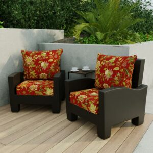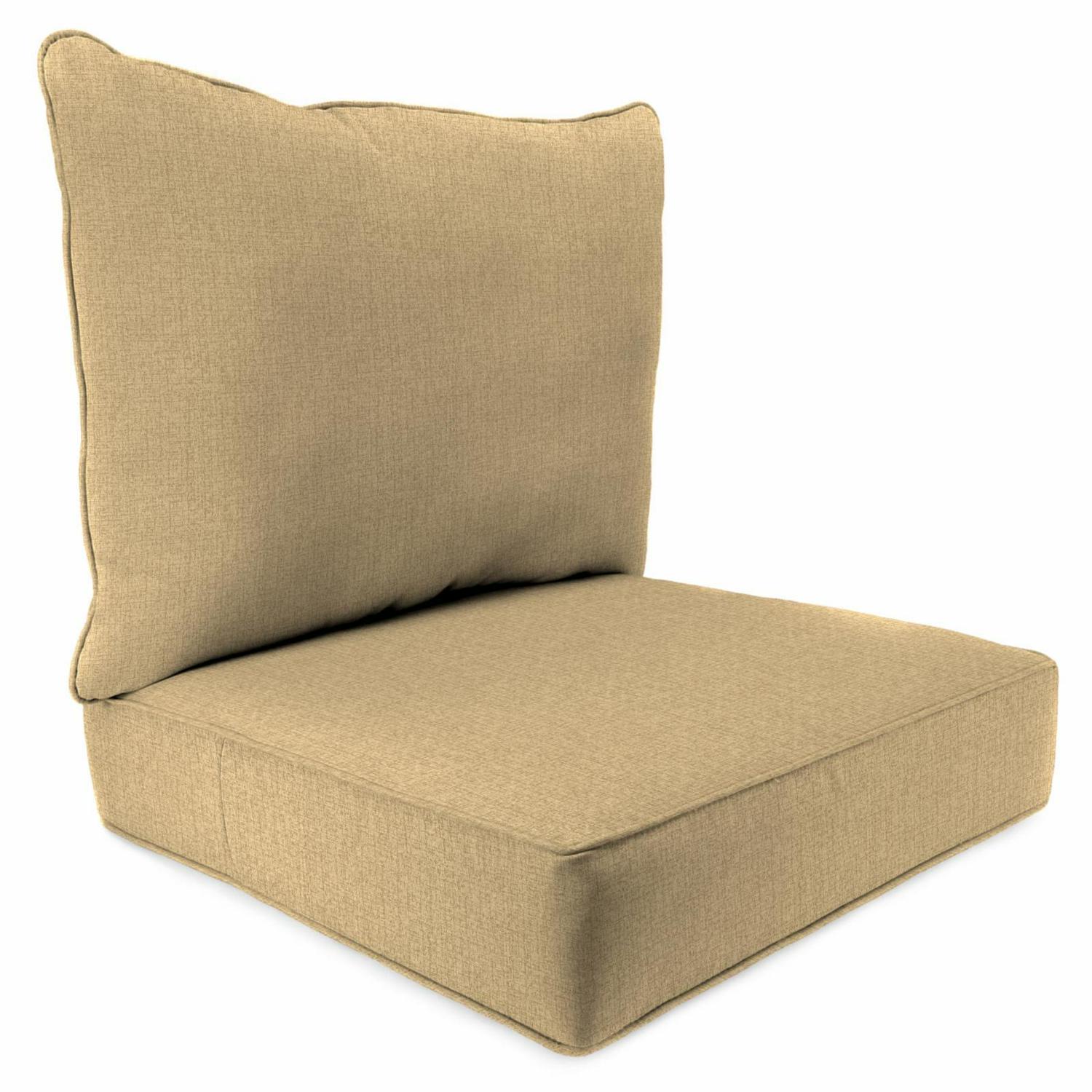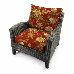 Create your own outdoor oasis with this colorful Deep Seating Chair Cushion Set. The 26.5-inch by 22.5-inch back cushion is plush and pillowy, filled with polyester fiber for extra comfort. The 24-inch by 24-inch seat cushion is designed for deep chairs and has foam and layered fiber inside for superior support. Boxed edges with a decorative welt create a crisp look that lends modern style to your patio, porch or poolside lounge area. Designed for versatility, this outdoor cushion set is finished on both sides and can be flipped for use on the front or back. These durable outdoor back and seat cushions are made to withstand any weather, featuring water-, fade- and mildew-resistant fabric that has UV protection for hours of fun in the sun. Worries about a splash of soda or spilled BBQ sauce are a thing of the past, thanks to the stain-resistant fabric that’s super easy to care for. Just spot clean with a soft cloth, warm water and mild soap, and your chair cushions will look good as new again.