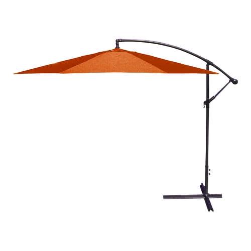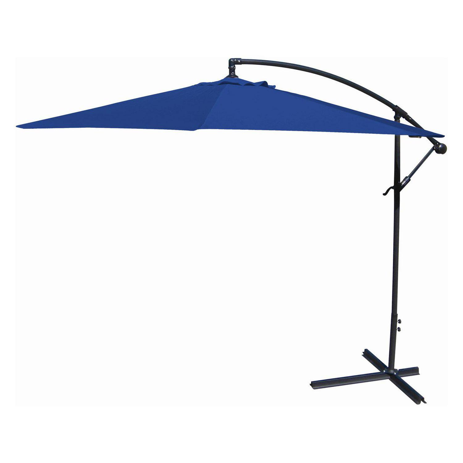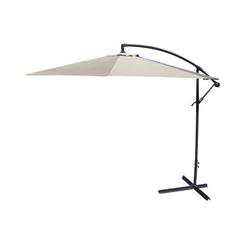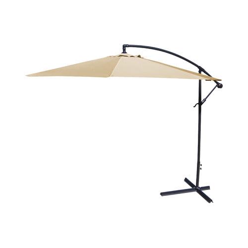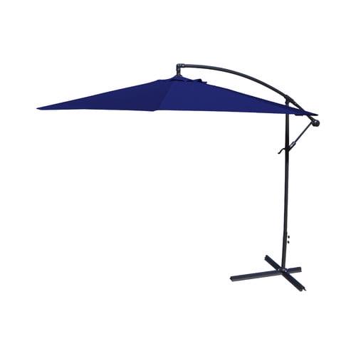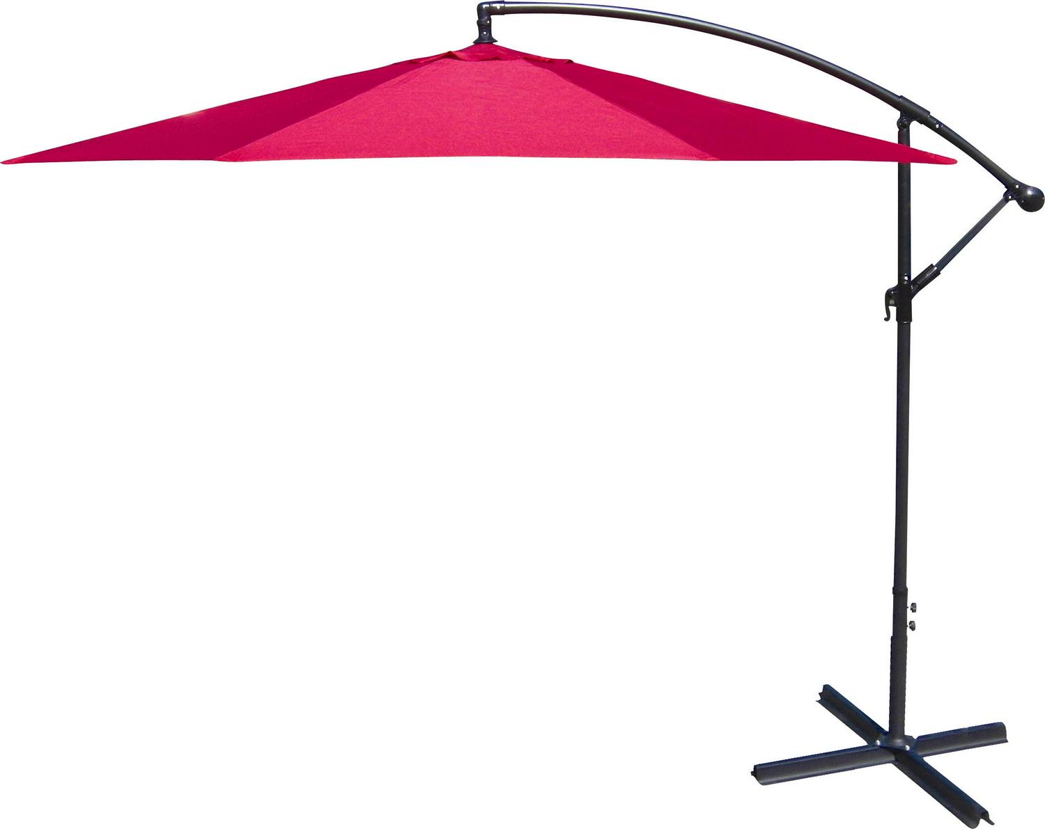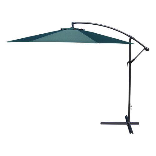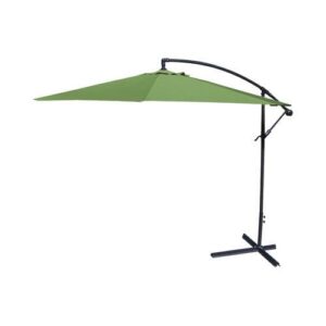 Enjoy cooling shade while perfecting your patio, porch or poolside style with this 9.5′ Offset Folding Outdoor Patio Umbrella. The octagonal umbrella canopy measures 9’5″ in diameter, providing plenty of protection from the sun’s harsh rays for a patio table with 6-8 chairs. As hot air rises, it can escape through the vented top to help increase the cooling effect, keeping you and your guests comfortable. Crafted from UV-resistant polyester, the canopy resists fading to stay looking vibrant after hours in the sunlight. his durable fabric is also mold-, mildew-, stain- and water-resistant, making it ideal for outdoor use. The sturdy pole and eight ribs of the patio umbrella are made from black powder-coated steel to resist rusting and stay looking great for years to come. Just add four weights to the built-in base of this classic cantilever umbrella to keep it secure. After sunset, simply use the hand crank to fold the umbrella down and secure it closed with the attached fabric tie. Best of all, this patio umbrella is easy to care for – simply spot clean the canopy with soap, water and a soft cloth.