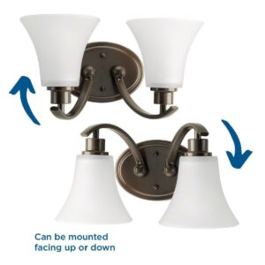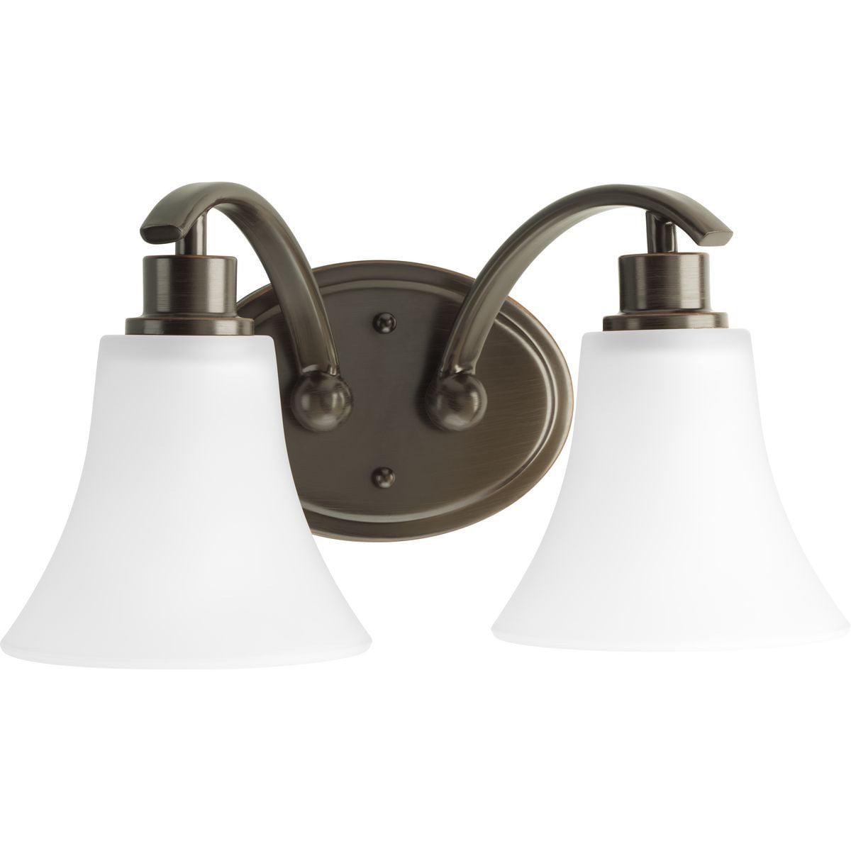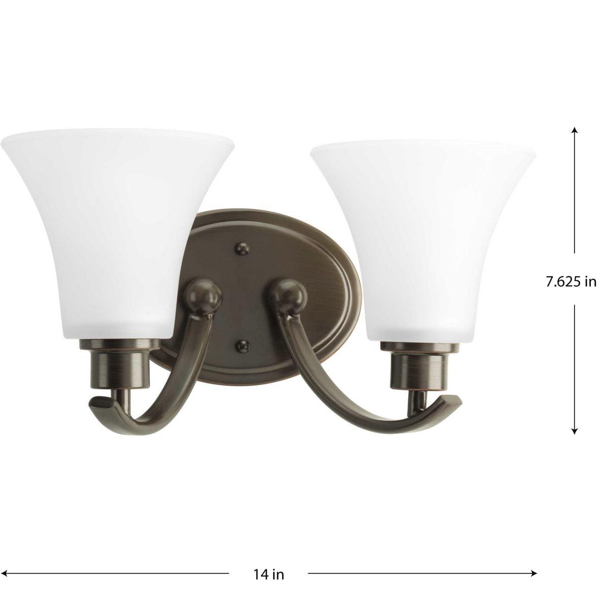 Gleeful simplicity defines the Joy Collection. Refreshing and fashionable, arcing forms of metal and fluted glass shades are enhanced by a classic Antique Bronze finish. Two-light fixture with white etched glass complete the look and allows you to coordinate well with other fixtures from this collection. Bring joy into your heart and into your home with this wonderful two-light bath fixture.