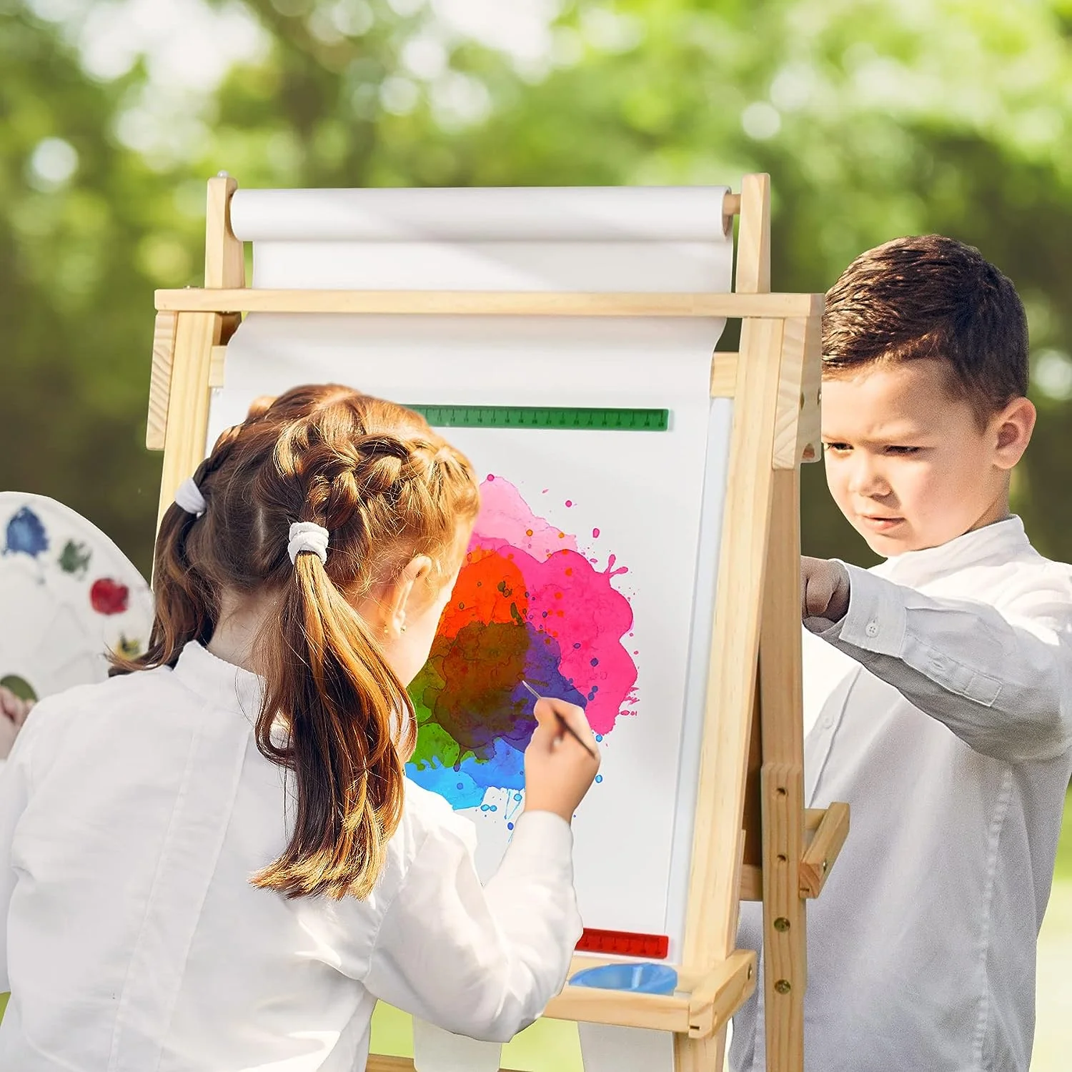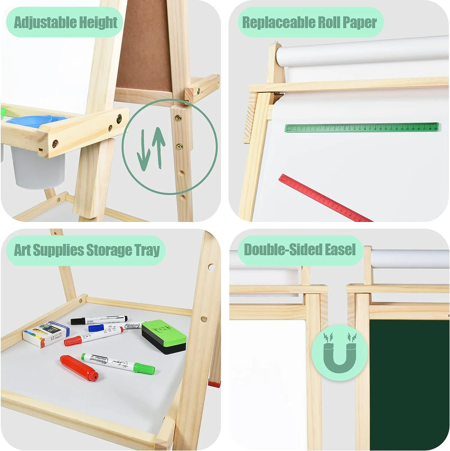 【3 in 1 Wooden Easel】: Our drawing easel comes with 3 painting panels, magnetic whiteboard allows used by marker pens , magnetic blackboard allows used by chalk, and it can also be used by pulling down the top paper roll. With 3 kind of drawing surfaces for choice, let our kids express their creativity fully play. 【3 Height Adjustable Standing Easel】This child’s easel features three adjustable height setting, 39″, 41″ and 43″. This art painting easel will accompany our children to grow and suitbale for children of varying ages. 【Safe & Stable Toddler Easel】Made of high-quality wooden materials assembled with precision manufacturing standards. Our painting easel is compliance with international standards testing, everything is for the safety of kids. 【Ideal Gift for Kids】Parents can teach spelling and play arithmetic games with with our baby through this magnetic easel. Kids art easel will provide hours of creative activities such as painting, coloring, lettering and math games, both FUNNY and EDUCATIONAL. The wood tray, drawing cup storage self, pen chalk storage slot, with 3 storage design offers great storage space and bring convenience while painting. 【Abundant Kids Art Supplies】Our kids easel has luxurious accessories, including 1 paper roll, 2 magnetic rules, 1 box of chalk, 1 chalk case, 4 whiteboard marker, 1 eraser, 4 drawing cups, colorful magnetic letters and math set, added kids 1pcs art apron and 2pcs oversleeve, can keep children’s clothes clean. Meet the needs of children’s drawing and learning.