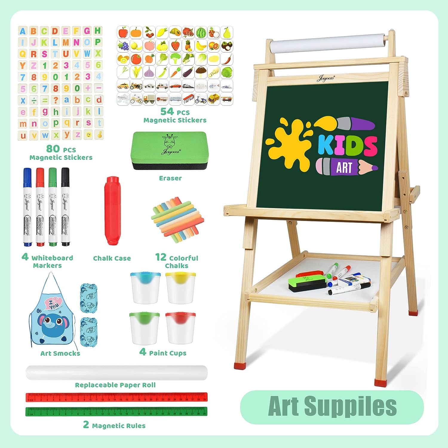 Joyooss Art Easel for Kids with Double-Sided Magnetic, Wooden Standing Kids Easel with Dry Erase Whiteboard & Chalkboard,Height Adjustable Children Easel with Paper Roll