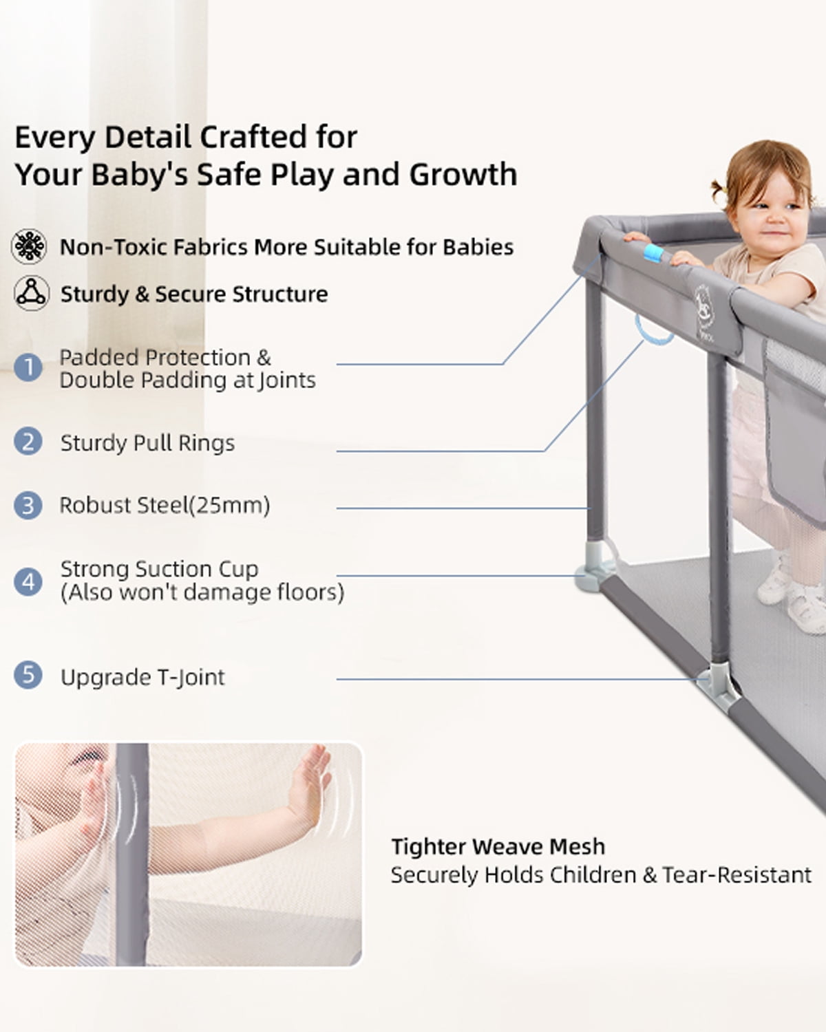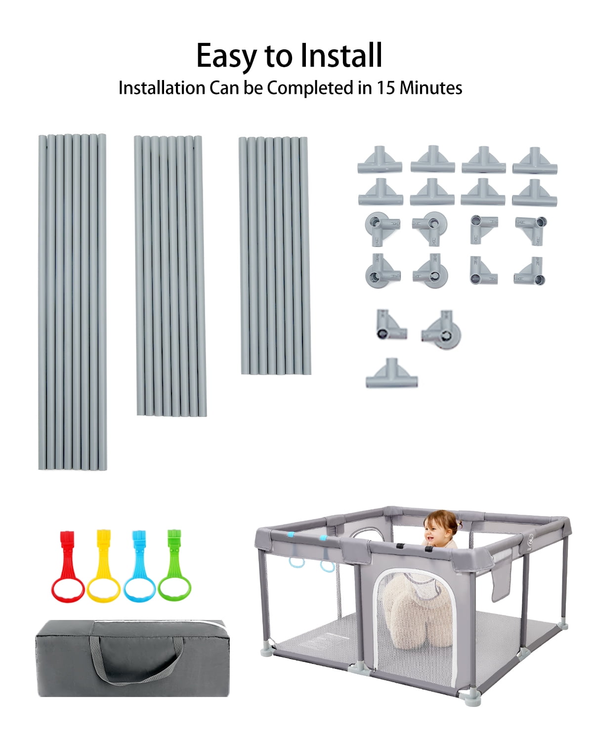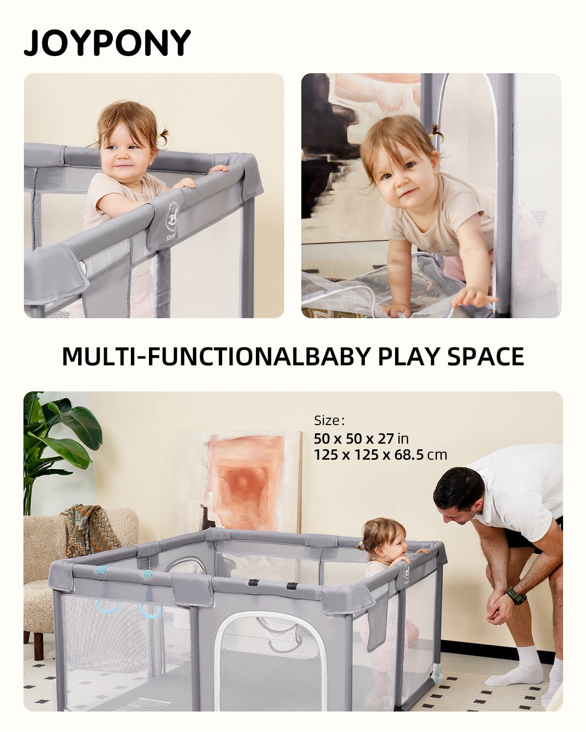 Large Baby Playpen, Safety Play Yard: Joypony playpen measures 50x50x27 inches. The scientific safety height of the baby play pen is long enough for toddlers 6 months to 6 years old to crawl, walk, stand and play freely. The play yard with basketball hoop for baby provides large space to play around while the safety baby gate keeps them inside. Safety Material& Sturdy Structure: Our play pen passed US CPC certification. Made of 300D cationic cloth and strong steel pipe, with 4 sturdy safety non-slip suction cups keep the playpen in place. Do not worry about it will be overturned or pushed down by the child. The thickened foam upper fabric cover of the playpen makes the playpen softer. Free Mother’s Hands: Suitable for parents with a growing baby, the Joypony playpen is helpful for kids to explore the world of perception, play and learn to move on their own, and keep it away from being lost or exposed to hazardous areas as well. You do not have to watch your child anytime! mothers can let go of their hands and do their own things. 360° Full Vision Design: Four sides of the playpen are breathable mesh, the mother can interact with the baby at any time. The zipper door design makes it easy to get in and out of the playpen, and the outside of the playpen also adds a storage pocket to put diapers and other items, convenient to use at any time. Easy to Install, Store and Clean: The baby fence uses alloy steel pipe and plastic joint connection, easy to disassemble and assemble(no tools required). With a bag provided, easy to store and carry. The bottom is made of wear-resistant,wear-resistant, non-slip, breathable, quick-drying, fabric. Only need to wipe with wet cloth and soap to clean.