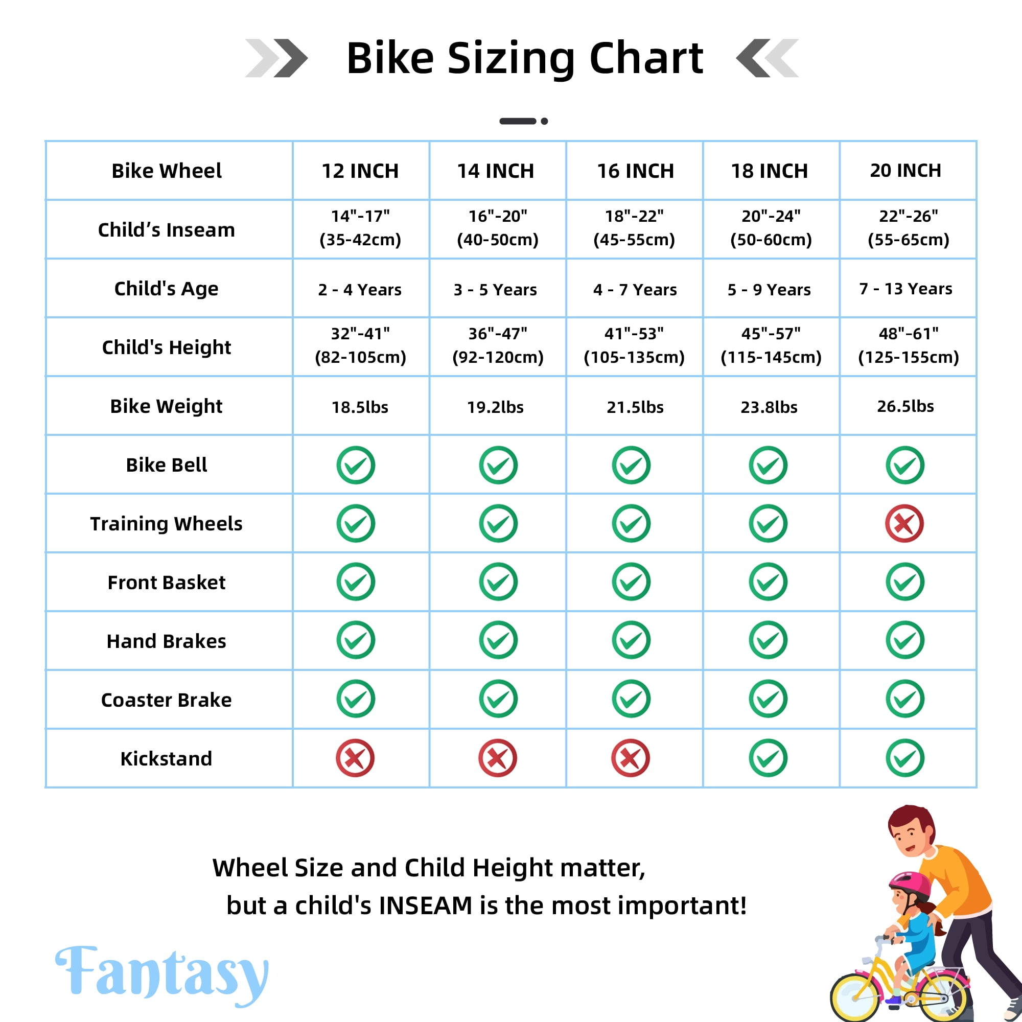 - 5, Choose the Right Size! 12 inch bike is suitable for 3-4 years old (33-41 inch) girls; 14 inch bike is suitable for 3-5 years old (35 – 47 inch) girls; 16 inch bike is suitable for 4-7 years (41-53 inch); The handlebars and seat height are all adjustable. Grow up with your children. The steel frame and fork are guaranteed by our LIMITED LIFETIME WARRANTY.