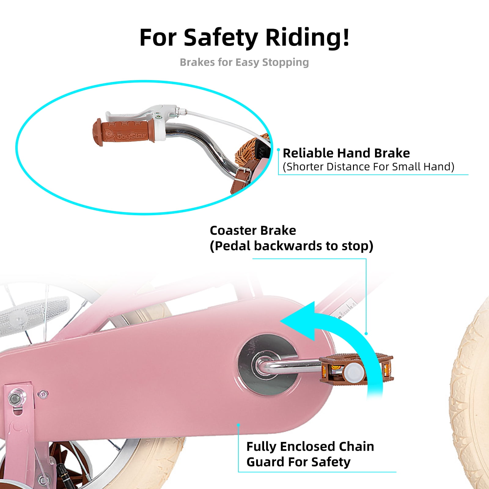 - 3, Safer Riding! The Front hand caliper Brake plus rear coaster/foot brake offer ample stopping power with more safety, wide 2.125″ pneumatic tires add more stability, Sturdy steel frame and crank, Non-slip resin pedal, enclosed chainguard, front & rear reflectors and wheel reflectors make this bike safe to ride.