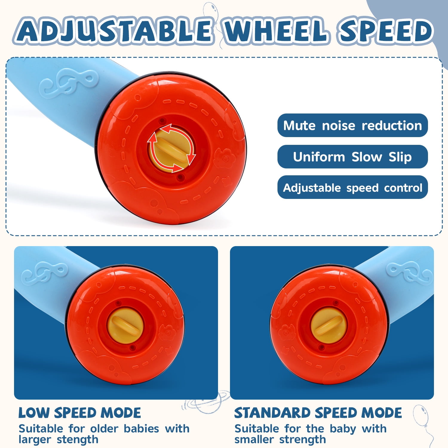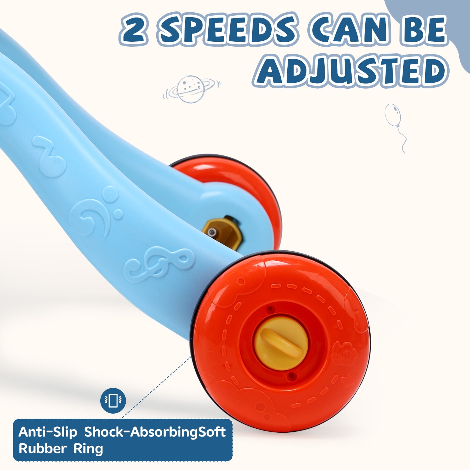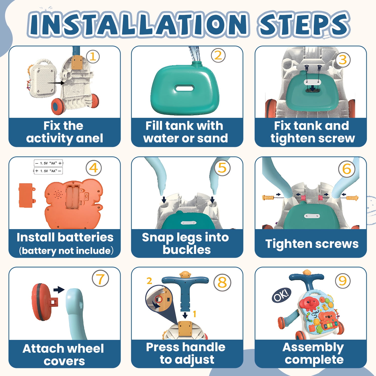 Baby Sit-to-Stand Walkers Unisex Toys: Encourages baby first steps, develop Baby’s coordination and strength by pushing the walker forward to learning initial standing and walking. Activity Center & Game Table: Detachable removable game panel come with shape recognition block, fun electronic organ(Removable),colorful turnable gear, rattle, detachable basketball frame. It can develop the baby’s fine motor skills and hand-eye coordination ability, improve their color recognition and shape identification ability while playing. Adjustable Speed: The sit-to-stand learning walker is with a non-slip shock-absorbing soft rubber ring, which can increase the friction with the ground. And the rear wheel can be adjusted to a proper speed(standard speed and low speed) to meet the needs of babies in different stages of walking. Safe Material & Great Gift: Made of safe ABS material, smooth edge without burrs, no-toxic. Early educational baby push toy is a wonderful birthdays, newborn gifts, Christmas gift choice for infants, babies, toddlers, newborn boys and girls. Prevents Bow Legs: Anti-slip and adjusting handle(Adjusting the handle according to the baby’s height), speed adjustment and triangular stable structure make your baby’s steps safe. Scientific ergonomics design let the baby learn the correct way to walk, without bow-legged. Removable Activity Game Panel: The multifunctional panel can be removed from the walker, the panel come with turnable gear, cute buttons shape, ball and ball toy slot for baby to play and learn. it can fully exercise baby’s hand-eye coordination and stimulate their curiosity. Adjusting Handle: The handle of learning walker can be adjusted up and down, it’s flexible and can adjusted according to the child’s height and usage movements. Let your baby take the first step bravely. Stable Design: There’s a weight box on the back of the baby walker weight box can filled with water or sand to increase weight. You can customize the weight of the walker according to your baby’s strength. Stable Triangle Structure: The baby walker with scientific triangle structure design, it will makes the baby walk more steadily and safely. We always take safety seriously and put it first! Child-friendly Material & Great Gift: Made of safe ABS material, smooth edge without burrs, no-toxic. It’s a wonderful birthdays, newborn gifts, Christmas gift choice for infants, babies, toddlers, newborn boys and girls. Motor Skills Development: Spinning blocks, turning gears, shape sorters will develop baby’s fine motor skills. Electronic organ can encourage your baby to play, develop their musical creativity, bringing endless for your kids. Two Speeds Can be Adjusted: The sit-to-stand learning walker is with a non-slip shock-absorbing soft rubber ring, which can increase the friction with the ground. And the rear wheel can be adjusted to a proper speed(standard speed and low speed) to meet the needs of babies in different stages of walking.