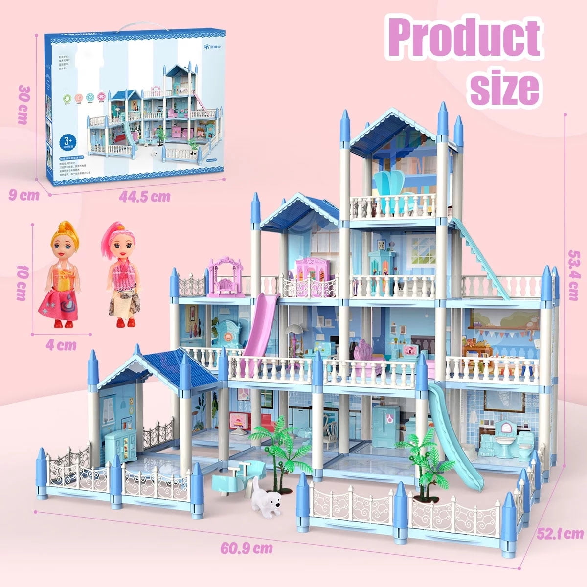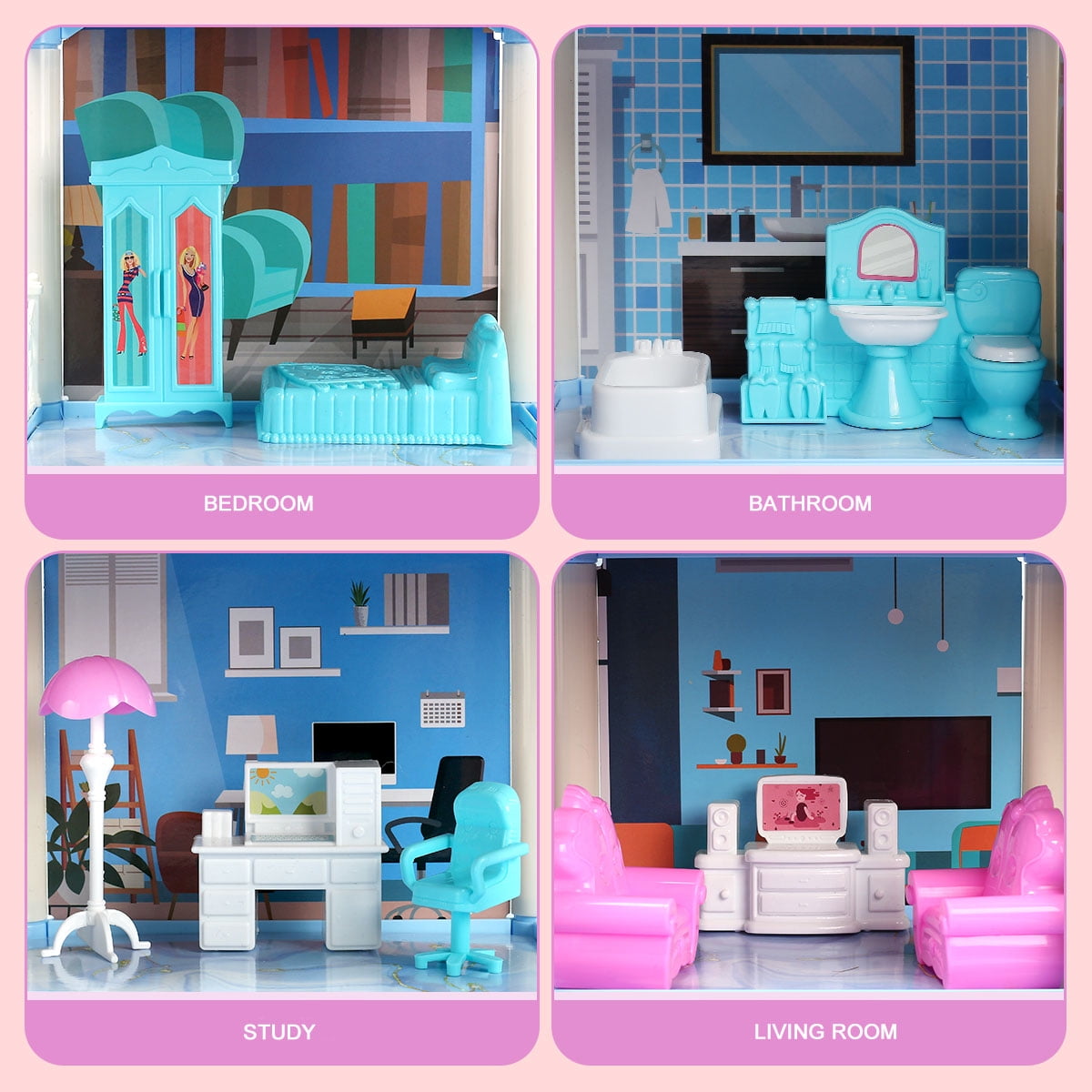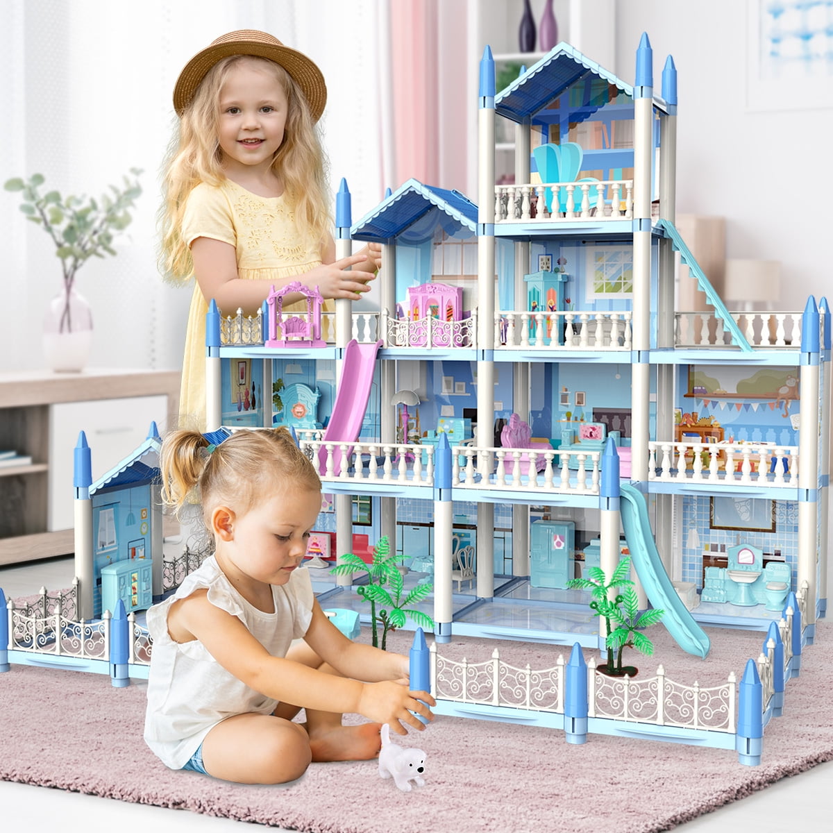 Kids Dollhouse Girls need to build their own house by themselves, thereby promoting critical thinking and innovation among our dear kids. Parent-child interaction will make this process more interesting. The colorful lights will make your house look like the fairy tale. Huge Doll House: there are 14 rooms which are categorized into Bedroom, kitchen, dining room, bathroom, living room, study room, piano room, etc. Unique Furnishing Features: Sliding doors, carriage, fences, dressing table, sofas, piano, rocking chair, pet, bathtub, toilet, TV, refrigerator, stove, dining table and many more. DIY: Girls need to build their own house by themselves. The house-building process promotes critical reasoning and great sense of accomplishment among girls. Parent-child interaction will make this process more interesting. The parental supervision process also seen as a fun-driven bonding activity. With the Dollhouse, girls can create & imagine anything! The possibilities are endless in this amazing dollhouse.Transforming furniture doubles the fun!Move into the Dollhouse & make yourself at home! Young imaginations will discover you can be anything with doll!