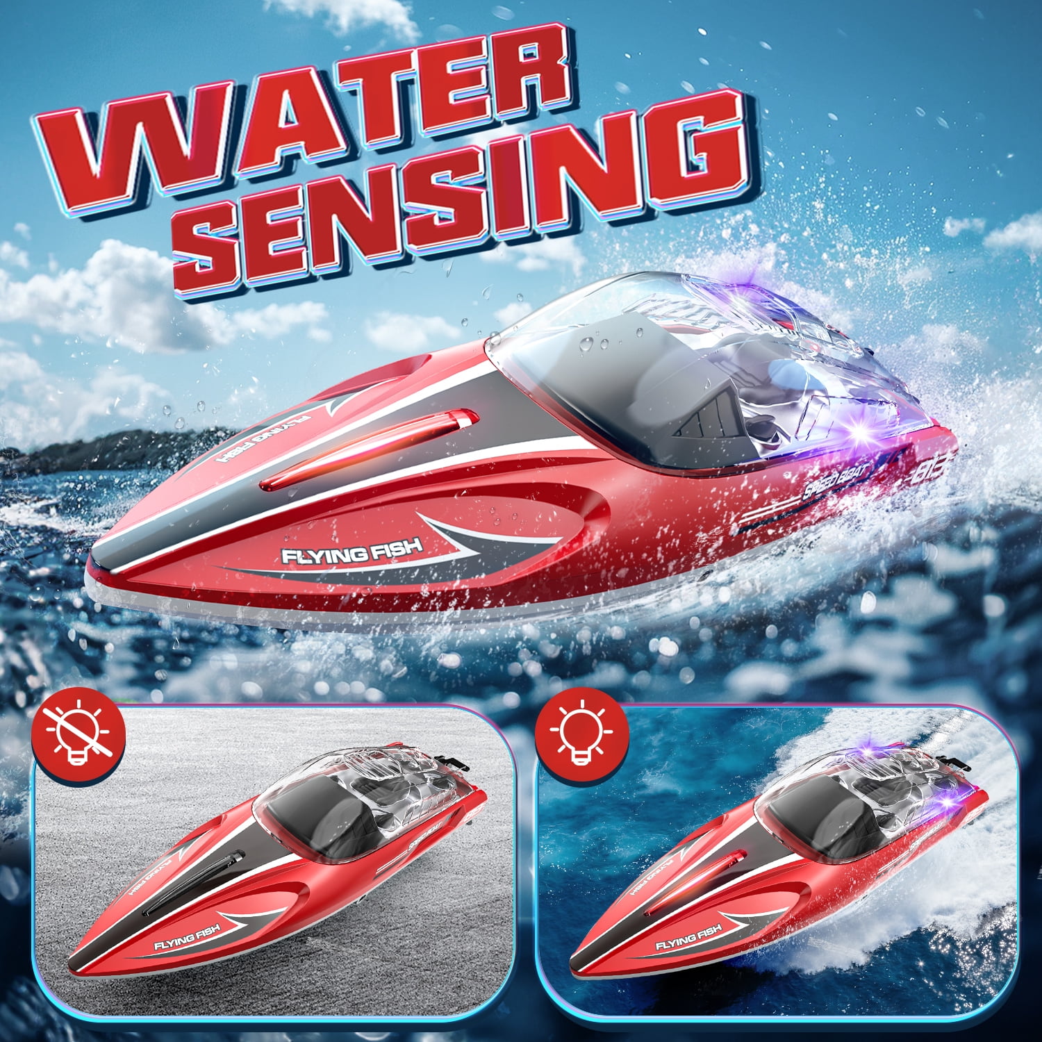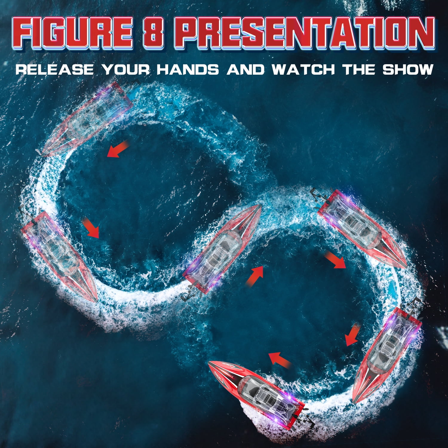Be the captain and have the endless time of fun with remote control boat! A large-prop motor pushes these RC boats to a whopping 25+ MPH! The 4-channel 2.4 GHz transmitter lets you find your own signal while racing other boats. It allows multiple speedboats sailing at the same time. Built-in water sensor function, sailing begins when the boat touches the surface of the water. This powerful single-prop motor is made even more efficient with technology that uses the water to cool the engine while race. A capsize recovery function uprights your radio controlled boat when flip. Upright your vessel with the Capsize Recovery Function by upward then backward and turns the boat back to its racing mode in the event of a flip. Double-hatch design and capsize recovery make this the best choice for any level RC enthusiast. It also protects your RC motorboat and improves water resistance in wavier waters. Your remote transmitter emits a low battery alarm when your boat with low battary. An LCD screen on the remote displays signal, power, trim adjustment, and throttle. It also has left/right hand control mode to satisfy different habit.