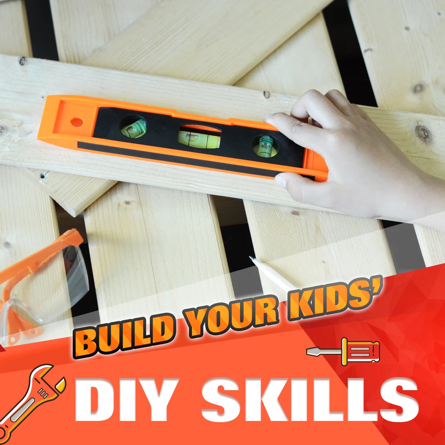 14 PCS REAL HAND TOOLS FOR KIDS – All tools in this set are real tools. It’s a must to use them with adult supervision. They are 6” Kids Hammer, 6” Crescent Wrench, 6” Combination Pliers, 6” Needle Nose Pliers,8”Water Pump Pliers, 8” Magnetic Flat &Phillips Screwdrivers, 9” Magnetic Level, 10’ Self-lock Tape Measure with both Metric and Inch Units, Child-Sized Safety Goggles, Goggles Case, 8 Grids Accessories Storage Box, Child-Sized Adjustable Tool Belt and Handy Tool Bag. DESIGNED WITH HIGH QUALITY & PRACTICALITY–The tools are steel forged with rubber handles, they are small enough to fit your kids’ hands, suitable for children in 5 year and up. The belt and bag are made of heavy duty fabric and durable enough to catch all the tools for a longtime. The bell is adjustable from 20” to 32”, 9 pockets in different size with 2 steel hammer loops create plenty space for tools. The bonus 8 grids box helps store little accessories likes screws, nuts, pins, etc. HELP BUILD YOUR KIDS’ DIY SKILLS – When you are doing some woodworking or DIY programs, you will find you kids are staring at you full of interests and want to pitch in. This Joytown tools set makes it possible. They are designed with smaller size, comfortable and safely for kids. It’s a perfect set for your kids to build and improve their DIY skills. ULTIMATE GIFT IDEA – Perfect tool set for boys, girls, kids, teens and adults. Practice your kids’ hand-on skills, activate their imagination, keep your boy or girl busy for hours at a time. This pretend play tools set is a perfect gift Christmas / Birthday. OUR POLICY – 100% Satisfaction Service. Get it and try it. If you don’t like it, don’t worry, Just contact with us, we provide 100% no-asking return or replace service.