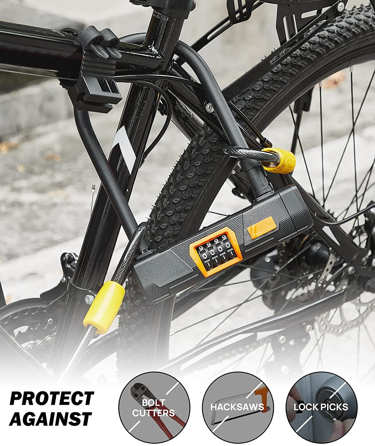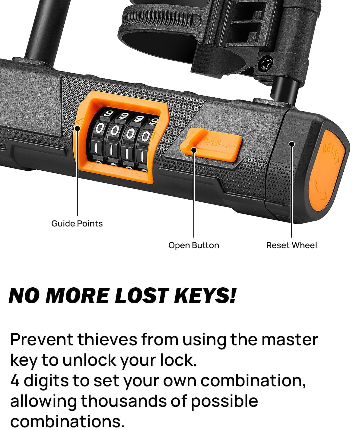 The bike U-lock resists corrosion from water, dust, and dirt to prolong the life of your lock. All-weather performance means peace of mind and better security.We also sent you padlock connectors, you can easily place your lock. Note that when using the padlock connector, the red button should be located under the lock, that is, close to the direction of the lock head, so that the lock can be well secured. Then you can easily take out or put in the lock just by holding down the red button.Choose JOYTUTUS bike u lock combination, no more lost keys! 4-digit set your own combination convenience allows for thousands of possible combinations. Prevent thieves use universal key to unlock your lock. It is recommended that you can take a photo after changing the code, in case you forget the code and cannot unlock it.