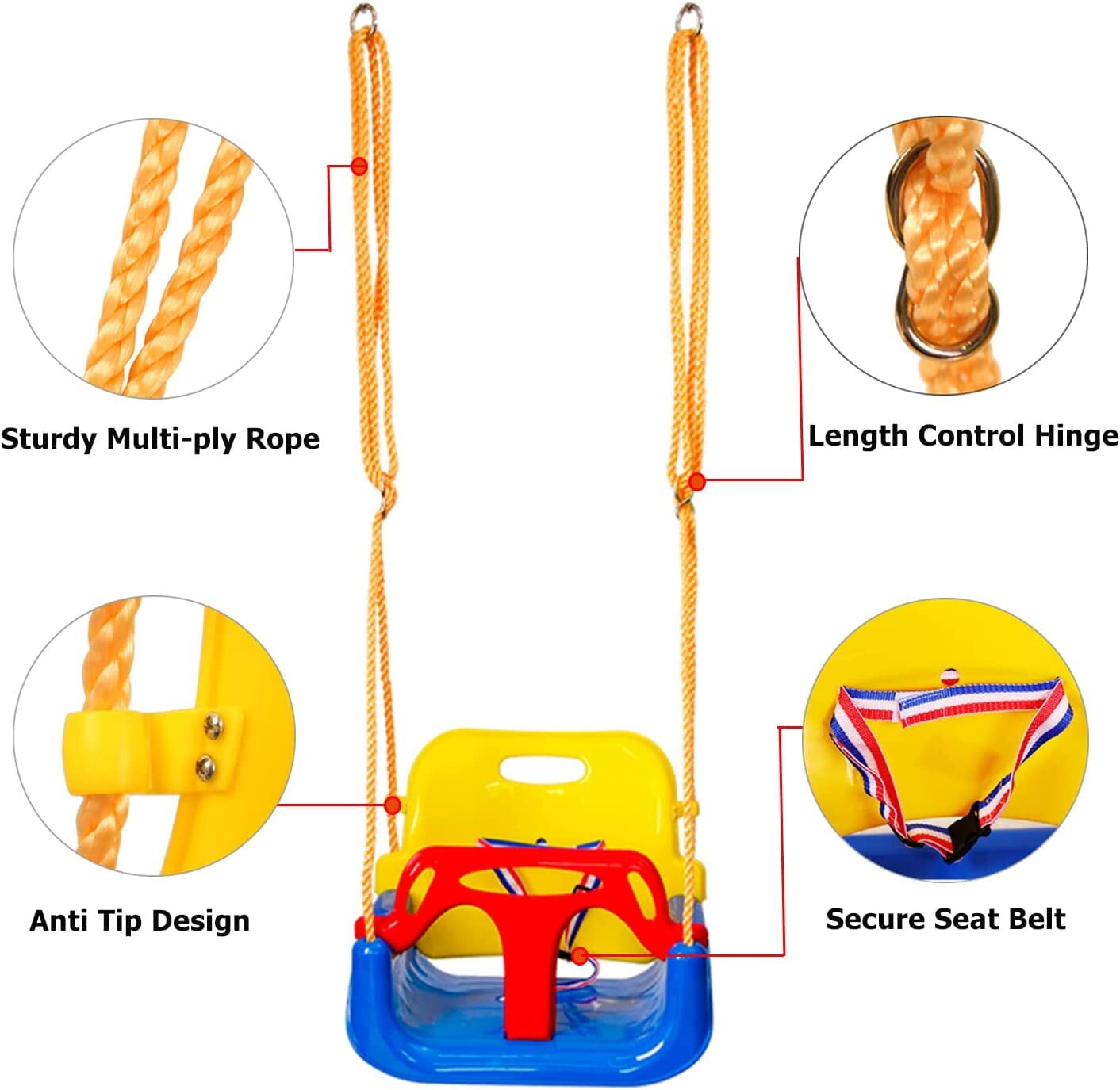 Discover the JUGAAD LIFE 3-in-1 toddler swing set, designed for safety and fun. This durable toddler swing seat can hold up to 220 lbs and features a versatile, adjustable design that grows with your child. Crafted from high-quality polypropylene and nylon, it offers a secure grip and double-safe features like a front T handlebar and seat belt. Easy to install with included tree straps, this swing set provides endless hours of outdoor or indoor play for children of all ages.