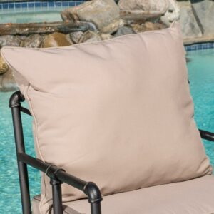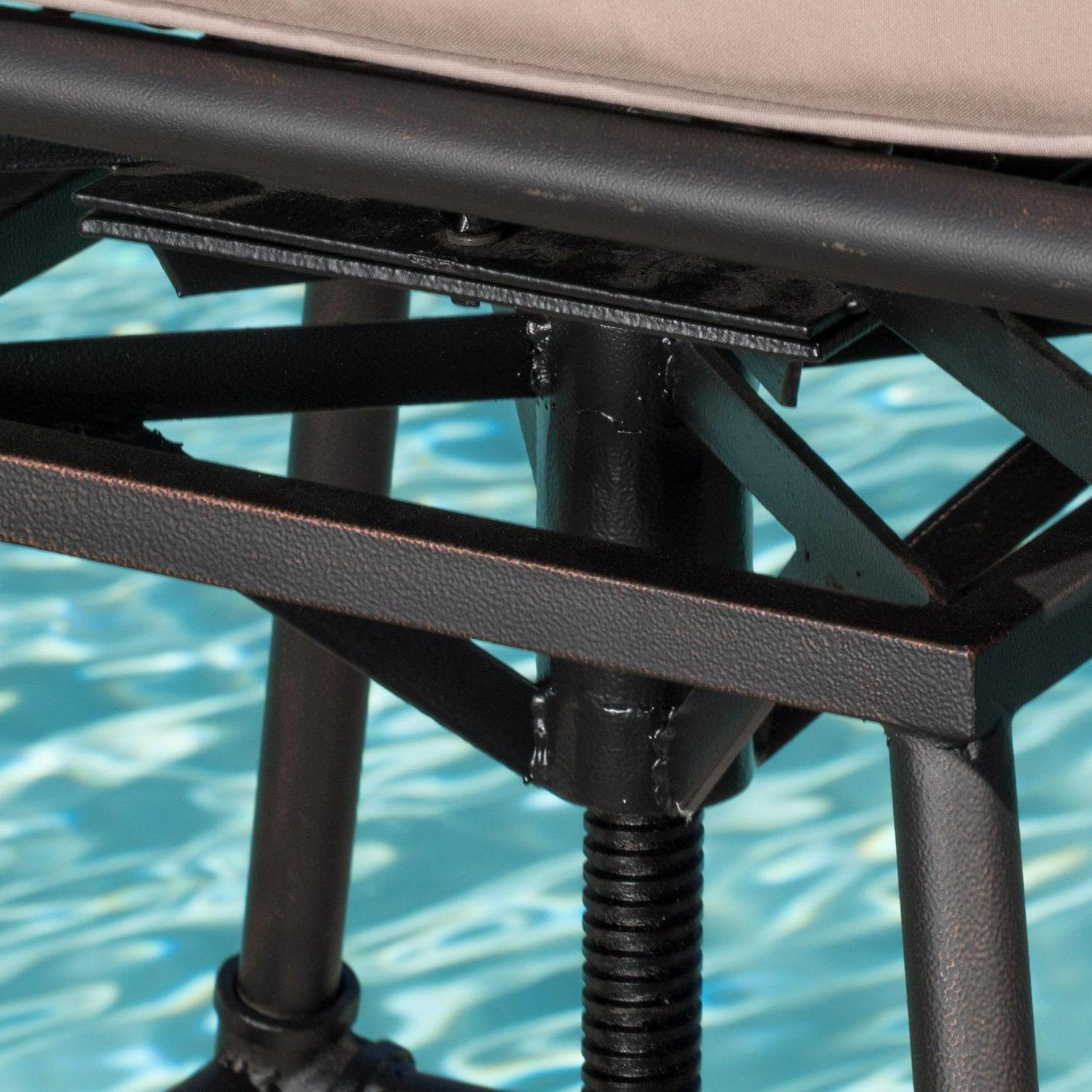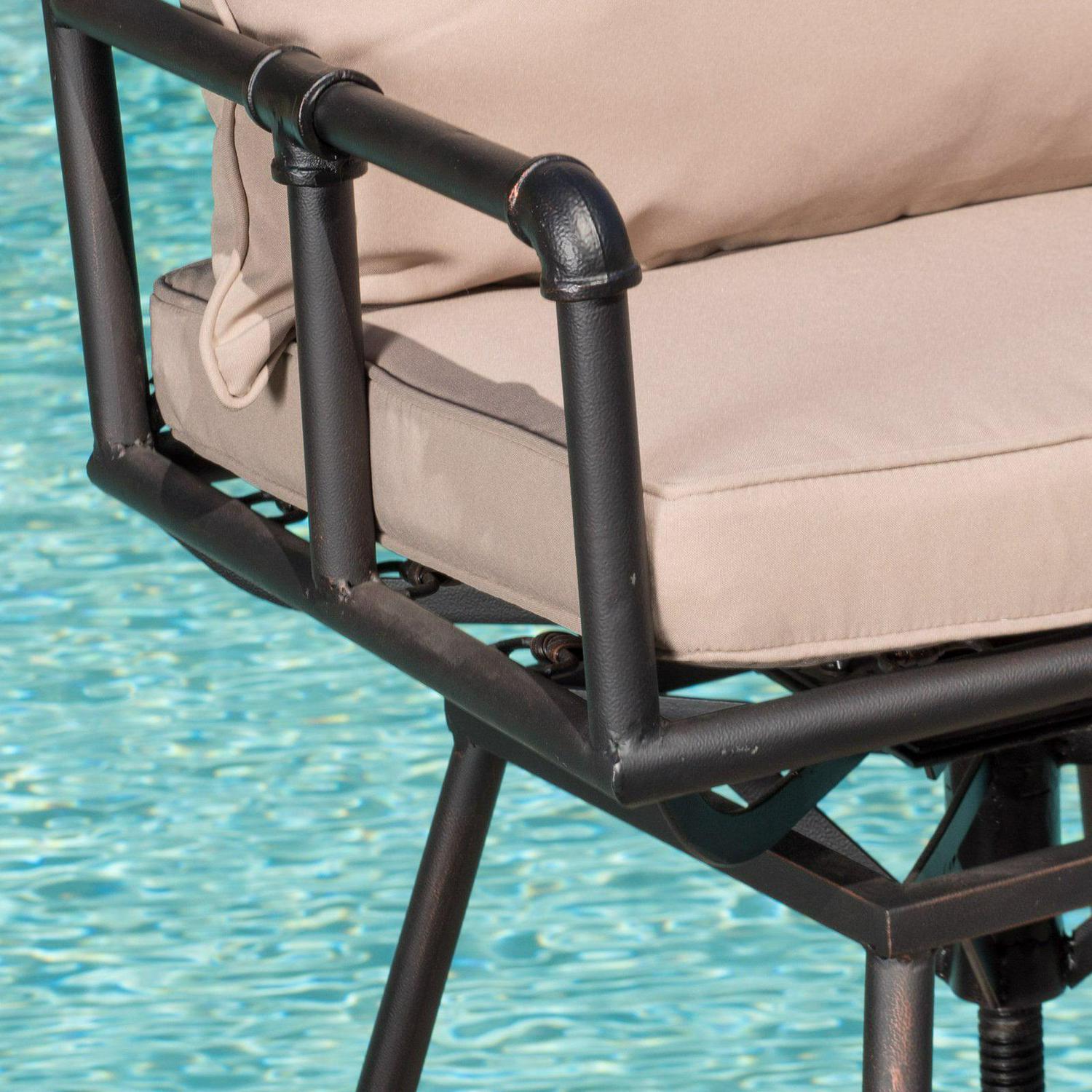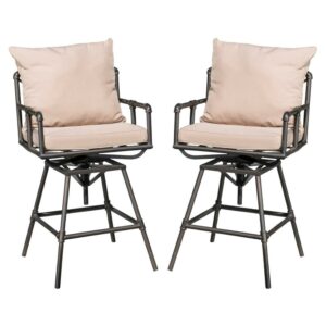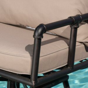Enjoy the whimsical pipe theme of this Julia Adjustable Height Bar Stool – Set of 2, made of iron in a dark copper finish. This set of two matching chairs includes weather-loving tan fabric cushions on the seat and back for long lounging. Integrated footrests match the plumbing style. This bar stool is adjustable too: give it a spin to make it higher or lower.