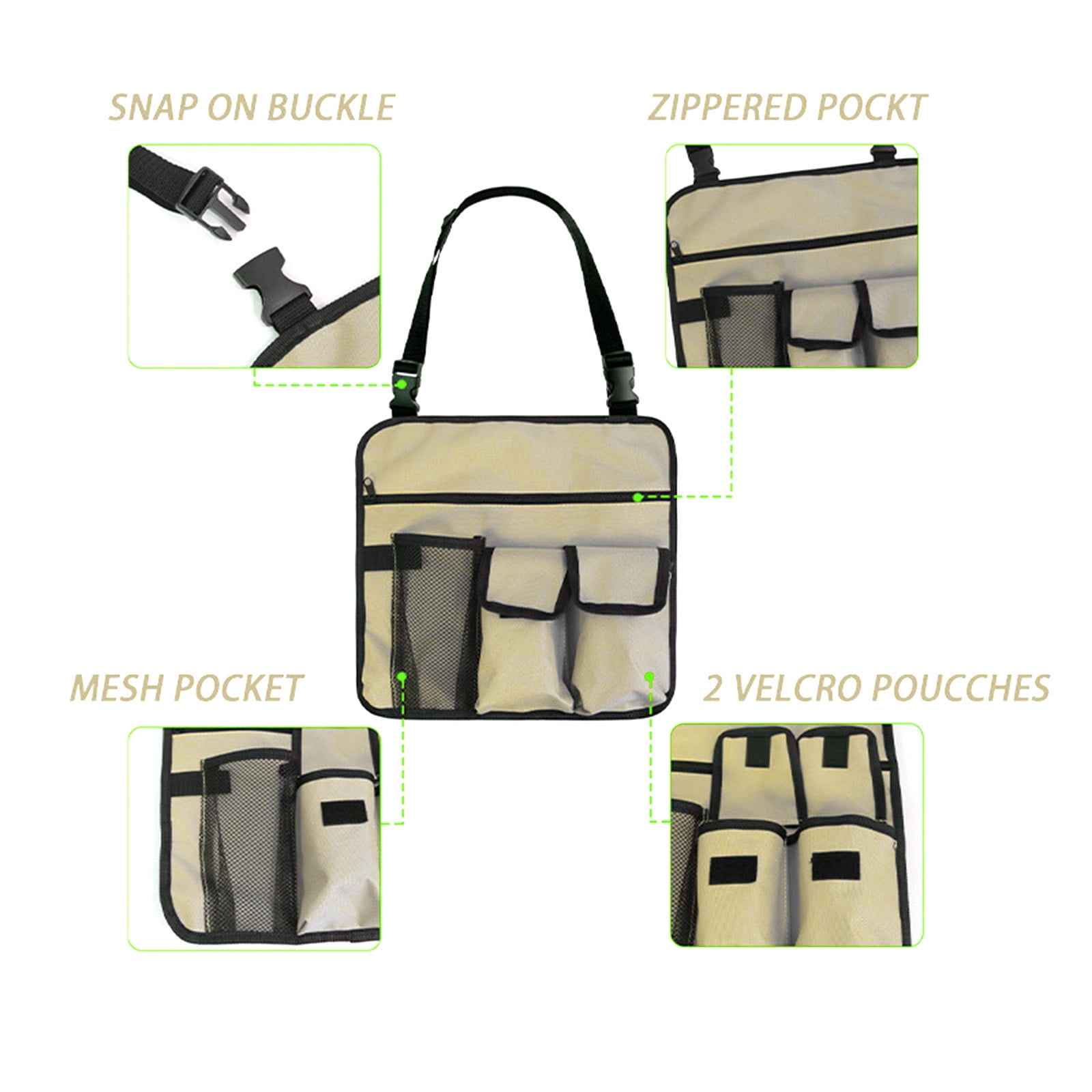 Camping Chair Hanging Bag Armrest Side Organizer Beach Multi Pockets Organize Armchair Tote Shoulder Beside Storage Pouch for Outdoor Fishing Beaching Feature: Color:Green,Black,Khaki Material:Oxford cloth Product size:33x33cm/12.99×12.99in Packing size:28x27x3cm/11.02×10.63×1.18in Net weight: 148g/0.33lb Gross weight:148g/0.33lb Description: 【Wear Resitive Material】Chair Hanging Bag Made of premium and 600D Oxford cloth material,wear resitive and easy to clean,can be used for long time 【Easy to Fasten】Strong hook loop can fasten easily to the armrest of your beach chair,ideal armrest side organizer and outdoor tote bag,it was also hung on wheelchairs,office arm chair,strollers or baby beds side to store necessities. 【Multi Pockets Storage】Chair Organizer large capacity design,with 5 pockets,1 main zipper pocket can hold tablet,magazine,newspaper or book,2 small pockets with cover can hold cell phone,earplug,key or other small items,1 mesh pocket can store drinks or water bottle,1 hanging strap can hang your sunglasses. 【Portable Design】Adjustable straps and buckle,it can be used as a shoulder bag for daily use,lightweight,you can carry it to travel,camping,hilking and beach holiday,size-13×13 inch. 【Wide Used】The beach chair organizer provide the perfect storage for beach chair,outdoor chairs,recliner,rocker sports chair,camp chair,garden chairs and wheelchairs. Package Content: 1 x Storage bag