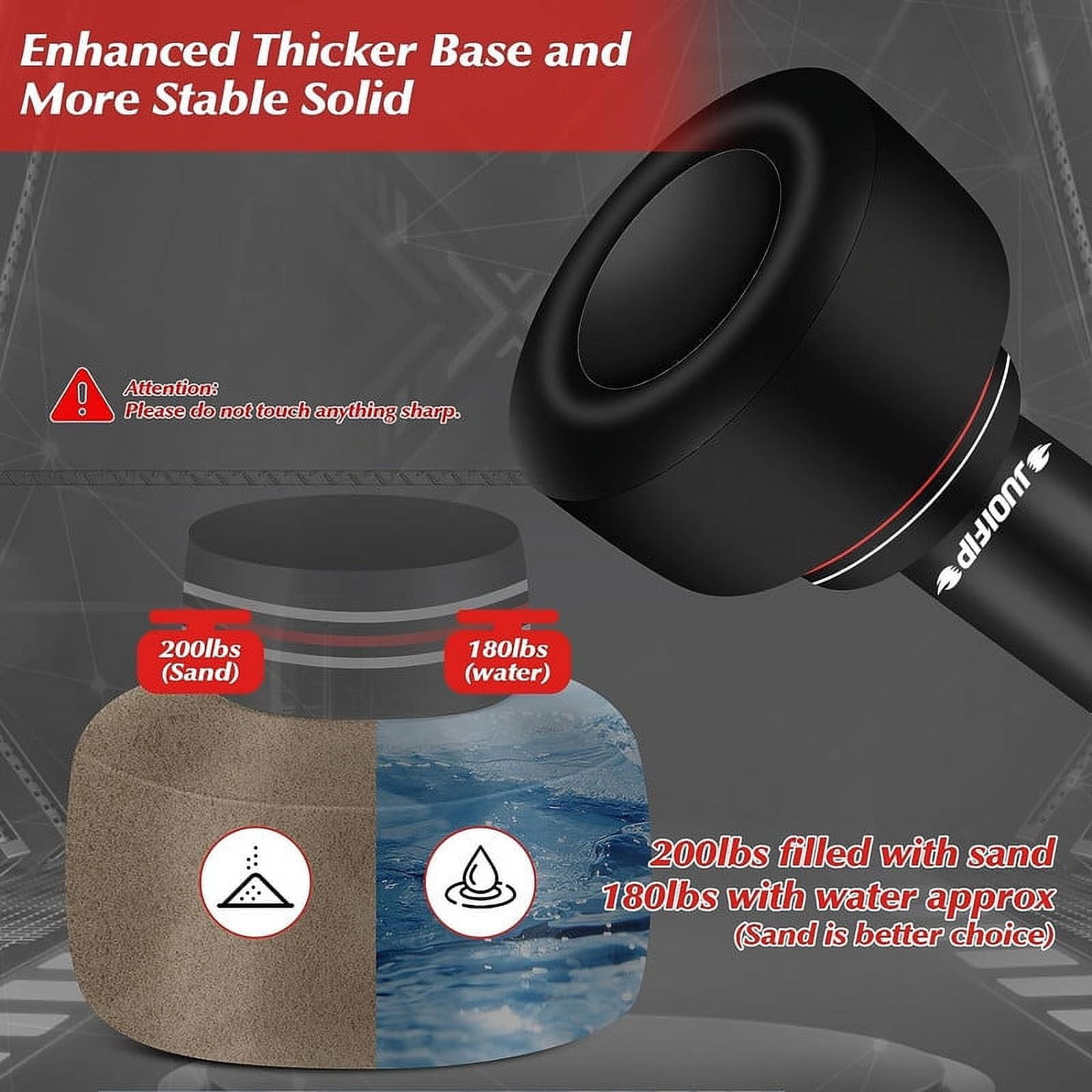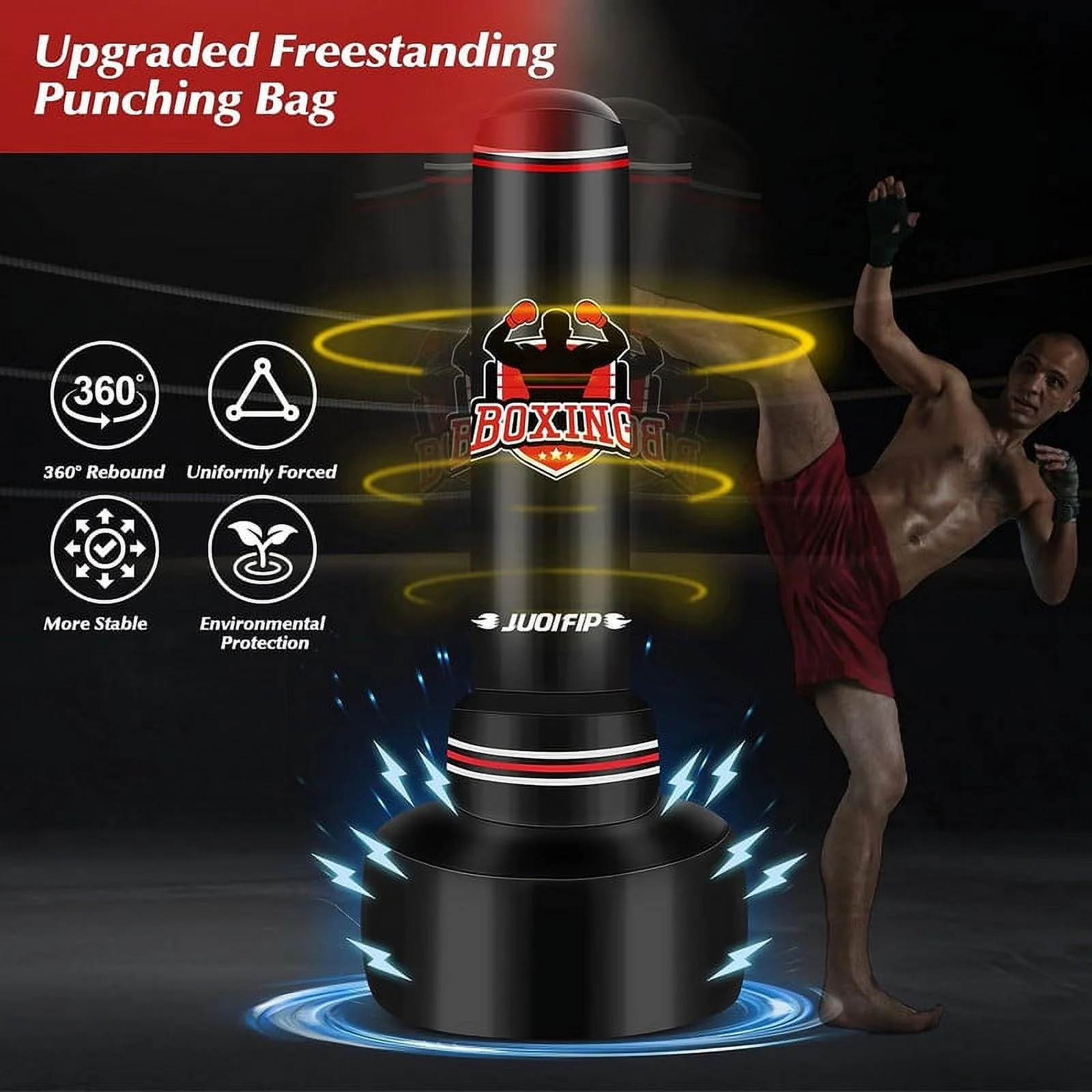 Professional Heavy Punching Bag Set: One-time purchase, you will get a complete set of boxing equipment, a freestanding punching bag a pair of boxing gloves, and an electric air pump, There is no need to purchase an additional electric pump, it is easy to inflate and give your hand the best protection, make sure you can boxing with confidence! Durable Material: Thickened PVC Structure: Compared to the 0.4 MM thickness on the market, our products are thickened to 0.5 mm thickness PVC material, which means our boxing bags are more reliable and durable. Generates tear-resistant, fast rebound, good hardness balance, and hands-protective surface Stable Big Base Boxing Equipment: Thicken 0.5 mm PVC base bears 80 kg weight easily, and can hold 180 lb of water or 200 lb of sand, So before using the punching bag, make sure to fill the base with water/sand and then inflate it using an air pump or you can fill it with either material or a combination of both to ensure stability. Sand is the better option to make it more stable 360-degree swivel and sturdy boxing bag, unique 360 swivel keeps the bag rebound freely after being hit. Let you release unlimited pressure and train in Taekwondo, boxing, karate, and Muay Thai Fitness. Bring your family, friends, and colleagues, and start your boxing training by filling up with gas right away! Just What You Need: Spend a lump sum of money, and you will get a complete set of boxing equipment and excellent service. Our freestanding punching bags are durable